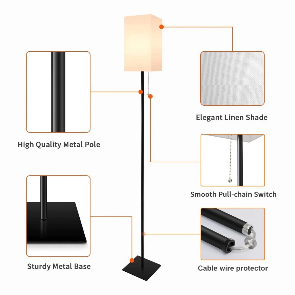 [Sturdy & Safe Design] The floor lamp has a well-weighted and sturdy metal base with non-slip cotton pads; it is not easy to tip over even if accidentally hit by children or pets, even on the carpet. [Energy Saving LED Bulb] The lamp includes a 9W 3000K warm white LED bulb equivalent to an incandescent bulb burning 60 watts; it uses less energy with a longer lifespan of more than 25000+ hours, reducing the electricity bill by up to 80%. The maximum compatible light source wattage is 60.00 watts, and no batteries are required; it provides a brightness of 800.00 lumen. [Comfortable Diffused Lighting] The tall floor lamp features a high-quality linen shade that softens and filters light into a diffused glow with no flickering and no buzzing; it provides a comfortable glow to protect your eyes with less irritation, making it easier to focus on activities like reading, working or sewing. The comfortable light also allows you to relax quickly. [Simple Modern Aesthetics] The simple and modern design of the floor lamp tall matches any styles of home decor; it can be placed in living rooms, bedrooms, offices, kids' rooms, guest rooms, or next to couches, providing the needs of brightness while serving as an elegant decoration in your home. The suitable size allows pole lamps for living rooms to stand in any corner or narrow area, making them space-saving. [Easy Tool-Free Assembly] The square floor lamp is easy to assemble in just 5 minutes without any tools required; simply insert all tubes and screw them firmly (remove the "cable wire protector" before installing the tubes), put the shade on the socket and tighten it with the socket ring, then install the LED bulb.