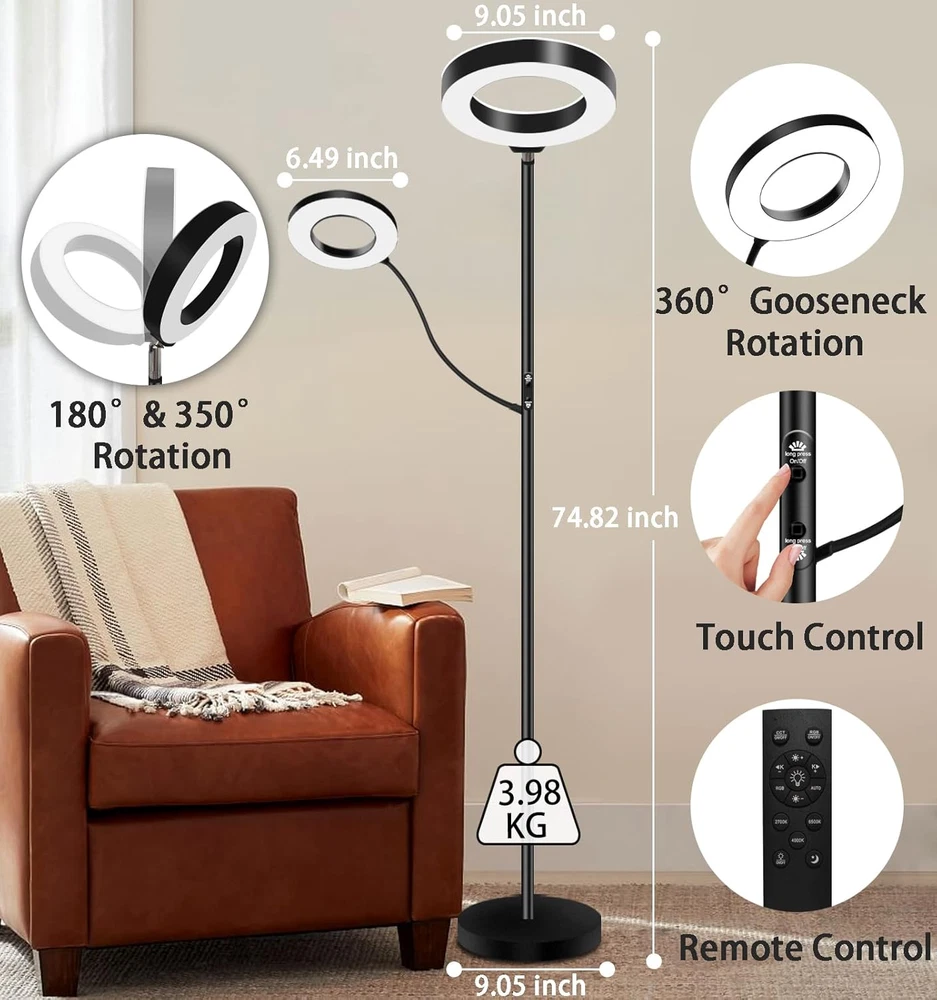 Store New Arrivals Add to Favorite View Feedback Contact Floor Lamp for Living Room with 3 Color Temperatures,Super Bright Dimmable LED Lamps, Standing Lamp Tall with Remote Push Button, Adjustable Gooseneck Reading Lamp for Bedroom Office Description Item model number A9 Light Source Type LED Style Minimalist Number of Items 1 Power Source Corded Electric Number of Light Sources 2 Control Method Remote Batteries Included? No Lighting Method Adjustable Lamp Type led Number of Pieces 1 Room Type Living Room Switch Type Remote Product Dimensions 16.33"D x 4.4"W x 10.82"H Material Cast Iron, Iron Installation Type Freestanding Controller Type Remote Control Finish Type Painted Specific Uses For Product Reading, Decoration Indoor/Outdoor Usage Indoor Bulb Base B21S-4 Country of Origin China Batteries Required? No Item Weight 10 Pounds Connectivity Technology USB Special Features dimmable Special Feature dimmable Part Number A9 Shade Color Black Mounting Type Floor Mount Color Black Is Cordless? No Base Material Metal Is Waterproof false Shape Round Voltage 120 Volts Recommended Uses For Product Reading, Decoration Shade Material Plastic, Metal, Iron Finish types Painted Included Components Remote Control Size A Upgraded Lamp Head: The newly upgraded living room high light has a metal base that is heavy enough to be securely placed. The buttons on the lamp post only control both sides of the main light, and the on/off key of the reading light is on the remote control. There are two circular lamp heads that can be freely adjusted in angle, without flickering or blue light. Protect your and your family's eyes. (remote control does not contain batteries) Modern Floor Lamp with 3 Color Temperature :3 color temperature modern floor lamp: The main RGB vertical lamp includes an LED emitting surface, and the main lamp has adjustable temperature settings of 3 different colors: 2700K/4000K/6500K. You can easily change the color temperature (except for reading lights) through the remote control to set the overall atmosphere of the room. Different modes create different atmospheres to meet your daily needs. Floor Lamps for Living Room with Adjustable light: Gooseneck Reading floor lamp comes with a rotating head, assuring convenience for daily life. When you put the floor light behind your couch, you can adjust the lamp head to any angle you like, which is very proper for reading and working. Handy Push Button to turn on/off the lamp and change 3 different color temperatures. Corner Floor Lamp for Living Room Bedroom Study Room: It is very affordable and works great when you need a floor lamp for a dark corner. This floor light fits in any room from industrial to modern or traditional décor. Perfect for a living room floor lamp, bedroom floor lamp, kids room floor lamp, office floor lamp, appartment floor lamp, classroom floor lamp. Easy to Install: Easy to put together and included the 2 light head . You need to twist the poles together, insert them in the base.Pull out the light cord from the bottom to easily screw the light pole together . No need any tools to complete. Product Description ABOUT US We offer the best prices around on high quality products. Our E-store includes media such as books, movies, music and games while offering electronics, toys, sporting apparel, clothing, tools, general home, garden items and more. SHIPPING We are always working hard to ensure your package arrives as soon as possible. Please understand that some factors like weather, high postal traffic, and the performance of shipping companies are outside of our control. We offer free shipping to the lower 48 states and ship within 2 business days of payment, usually sooner. We do not accept P.O. Boxes. Please provide a physical address. For shipping outside of the continental USA, we only use eBay's Global Shipping Program.The item is shipped to KY and then sent to the rest of the world. International customers are responsible for all duties and taxes. Continue to check out in order to calculate costs for shipping the item to your country. Messages regarding eBay's Global Shipping Program MUST be directed at eBay EXCLUSIVELY. RETURNS We offer a 30-Day Return Policy on items which you are not completely satisfied with. You have the option for a full-refund or an exchange of the item. No returns are available on items shipped outside of the USA. PAYMENT We accept PayPal. CONTACT US This page content is yet to come Please ad us to your favorite seller and visit again later Thank You CUSTOMER SATISFACTION We try our very best to make sure every customer is completely satisfied. If there's a problem, message us! We're happy to help. WE ACCEPT Copyright © 2021 AutoDS. | All Rights Reserved