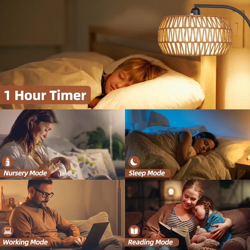 Dimming Brightness& Color: Our farmhouse standing lamp makes it effortless to tailor your lighting experience. With the included remote and dimmable bulb, you can easily adjust the brightness (from 10% to 100%) and fine-tune the color temperature (ranging from 2700K to 6000K) of this arch rattan lamp. Experience the benefits of mimicking natural sunlight, boosting mood, improving sleep, and increasing energy 1 Light with 2 Style Lampshade: Our reading boho lamp features a 360-degree rotation lamp head, allowing you to customize the lighting angle. The rattan lampshade emits a charming grid light effect, while the linen+rattan lampshade prevents light leakage, creating a warm and romantic atmosphere. You own 2 styles of home decoration and lighting effects with 1 tall rattan lamp Humanized Design: Our boho farmhouse floor lamp offers four preset modes (nursery/reading/sleep/working) to meet your different lighting needs. Set a 1-hour timer for a cozy bedtime atmosphere, and enjoy the convenience of not having to worry about turning off the floor lamp Remote Control & Foot Switch: Enjoy two ways to control the arch rattan floor lamps. Use the included remote control to adjust the rattan standing lamp from up to 50ft away, even without leaving your warm bed. The foot switch allows you to turn off the bohemian floor lamp effortlessly Gift for New Home & Easy Installation: Our tall boho floor lamp is easy to move to different rooms, making our modern farmhouse floor lamp perfect for homes without ceiling fixtures. It's an ideal gift for new homeowners and suits various settings, including living rooms, bedrooms, offices, apartments, and classrooms