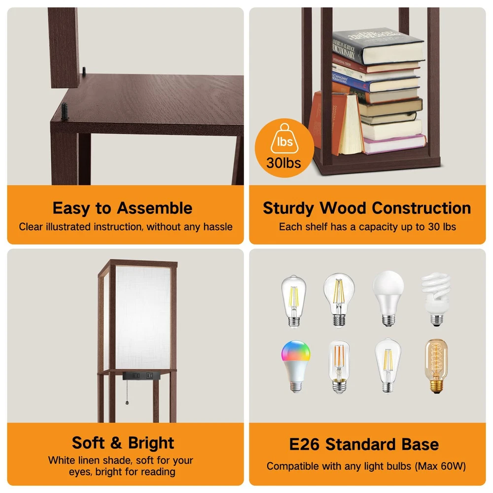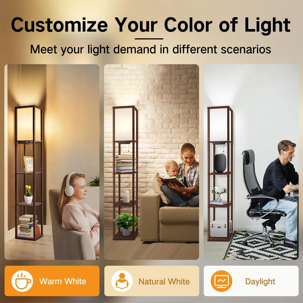 3 Color Temperatures & Long Lifespan: The modern floor lamp comes with a 9 Watt, 810 lumens, 3 Color Temperature(Warm, Cool White, Daylight) power-saving bright LED bulb with 25,000 hours lifespan. Save money and energy. Built-in Pull Chain Switch to turn on/off the lamp easily. This lamp has a Maximum Wattage of 150W and equips with E26 Bulb Base compatible with various bulbs. Meet your different lighting needs and moods. Fast Charging Station & Memory Function: The corner floor lamp built-in 1 type C fast charging port, 1 5V/2A USB port, and 1 power outlet, which allows you to charge devices such as phones, laptops, iPad, and Kindle at the same time. It will reduce the clutter of charging wires in your space and make your life more convenient. The memory feature will remember your choice the next time you turn it on as well, don't need to cycle through every color temperature to get to the desired setting. Minimalism Design & 3-tier Storage: Constructed from wood material, the shelf floor lamp has a modern, stylish look that can be easily coordinated into any contemporary room design. The floor lamp offers ambient illumination and style to any interior space. The 63.7 inch tall floor lamp has three 10.25 inch wide and 15 inch height shelves for quick access storage (the TV remote, phones, tablets, books) and for displaying your family photos, potted plants, decorating elements, vases, and art. Soft Bright Light & Customize Your Lamp: With a simple rectangular shape and a white linen texture shade is open at the top, casts soft and warm glow that's comfort for eyes. It is pretty bright enough for reading. Design with 3 shelves, you can build this without a shelf to make it shorter. Decor every space to your home. Easy to Assemble & Sturdy: The standing floor lamp is easy to assemble within 5 minutes, no tools needed. It weighs only about 12.1 lbs which makes you obviously carry it in your hands. Tough and sturdy enough to hold up to 30 lbs of items on each shelf, you can place anything on each shelf without worrying about wobbling. The lamp has a 9.5 feet cord and thus you can move it around in a room. Comes with Plastic Clips, to help tuck the power cord away making for a neat-looking product overall.