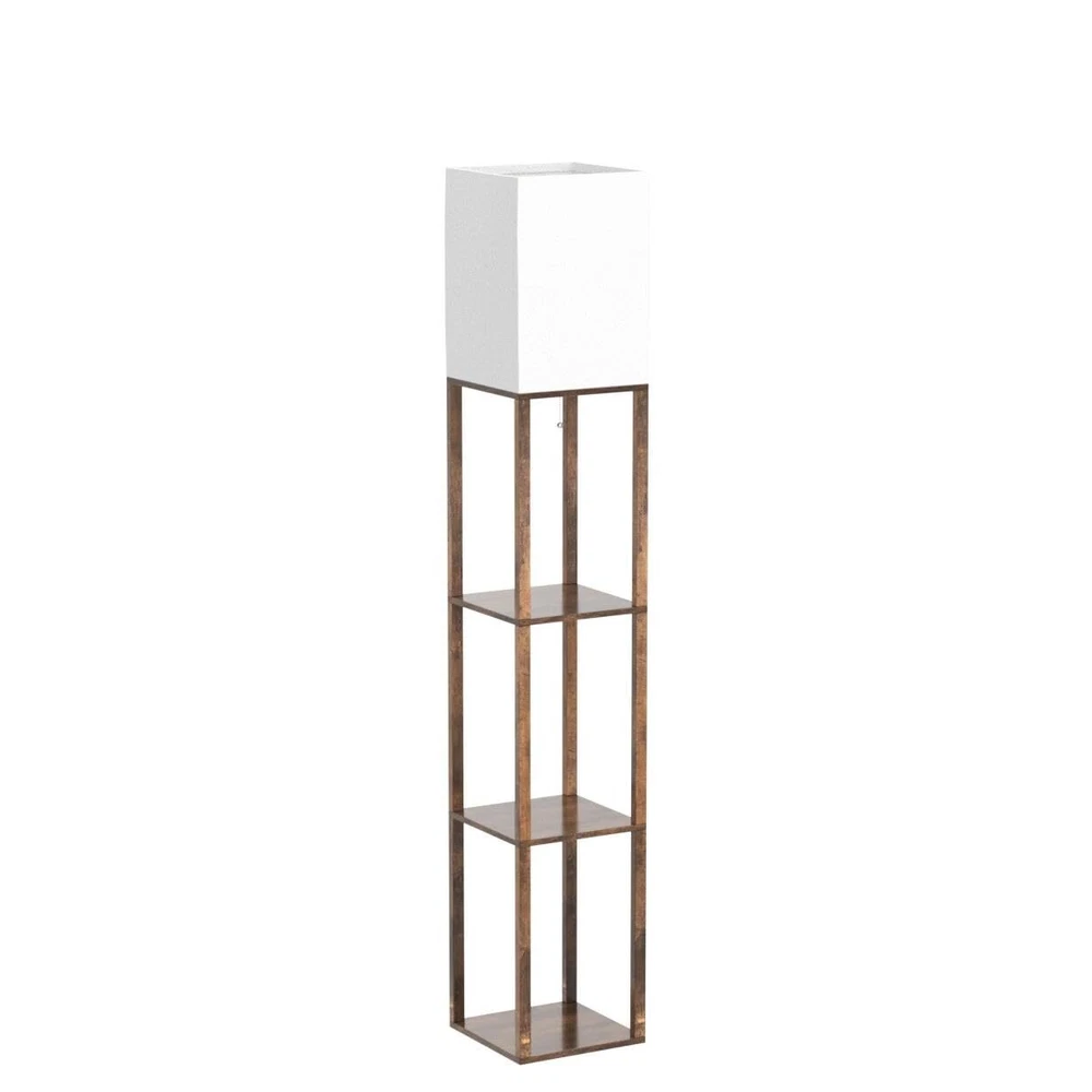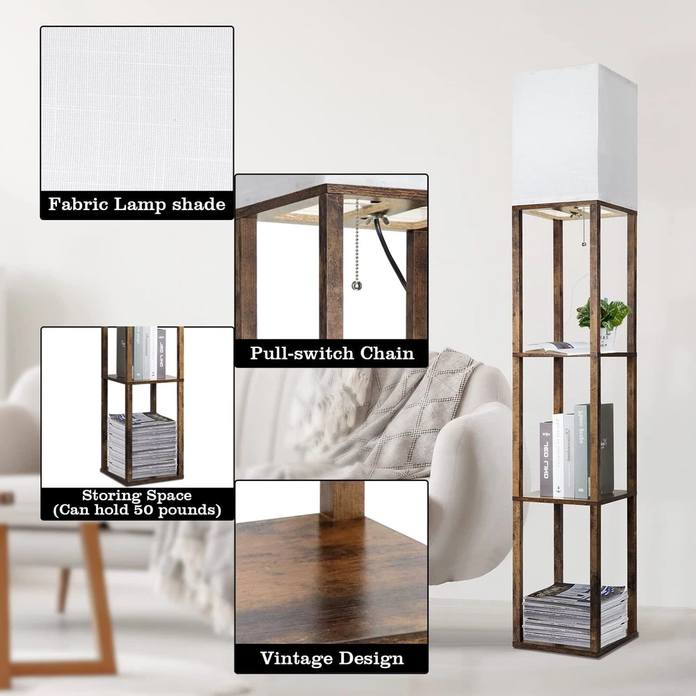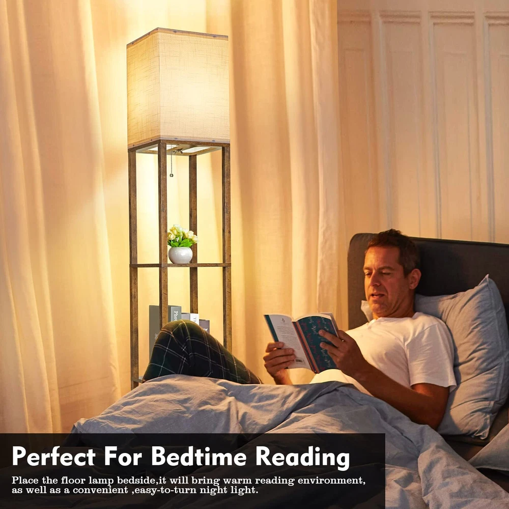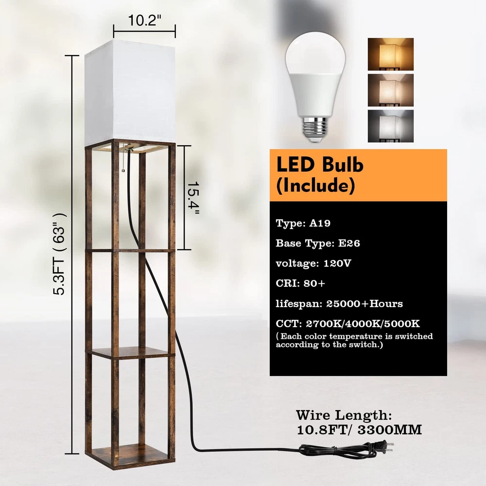LED Shelf Floor Lamp,Modern Dimmable Wood Standing Lamp Display Storage Wood Floor Lamps with 3 Color Temperature LED Bulb for Living Room, Bedroom, Office š”š”ćTriple Display Shelves Lampć: 63inch high shelf floor lamp with 3 brown tiers provides a display and storage space for your valued family photo, plant, magazines and other sundriesļ¼which loads up to 50 pounds max. It's convenient and practical in your bedroom, guest room, or office. š”š”ć3 Color Temperature Floor Lampć: You can control the brightness of your floor lamp for bedroom with the ability to adjust color temperature(2700K, 4000K, 5000K ) by pulling the chain. To adjust your favorite atmosphere of your space. š”š”ćSmart Floor Lamps Designć: This floor lamp with shelves is equipped with an E26 base compatible with various bulbs. A 8W A19 LED bulb included.CRI 80+ of the bulb can show the color of the object more realistically. When you adjust the standing floor lamp to the brightness, the last mode will be saved you set, which is convenient for your life. š”š”ćPremium Fabric lampshadećThis floor lamp for living room is designed with off-white cloth lampshade.The simple and stylish design complements the medieval or modern decoration style, which creates a elegant and comfortable atmosphere to your study, den, dorm room, foyer. š”š”ćEasy to Assembleć The modern floor lamp is easy to assemble within 10 minutes, no tools needed.Easy to install and powerful in functionality, so it can be used as a corner lamp to decorate your living room or as a nightstand with lamp to bring you life convenience.