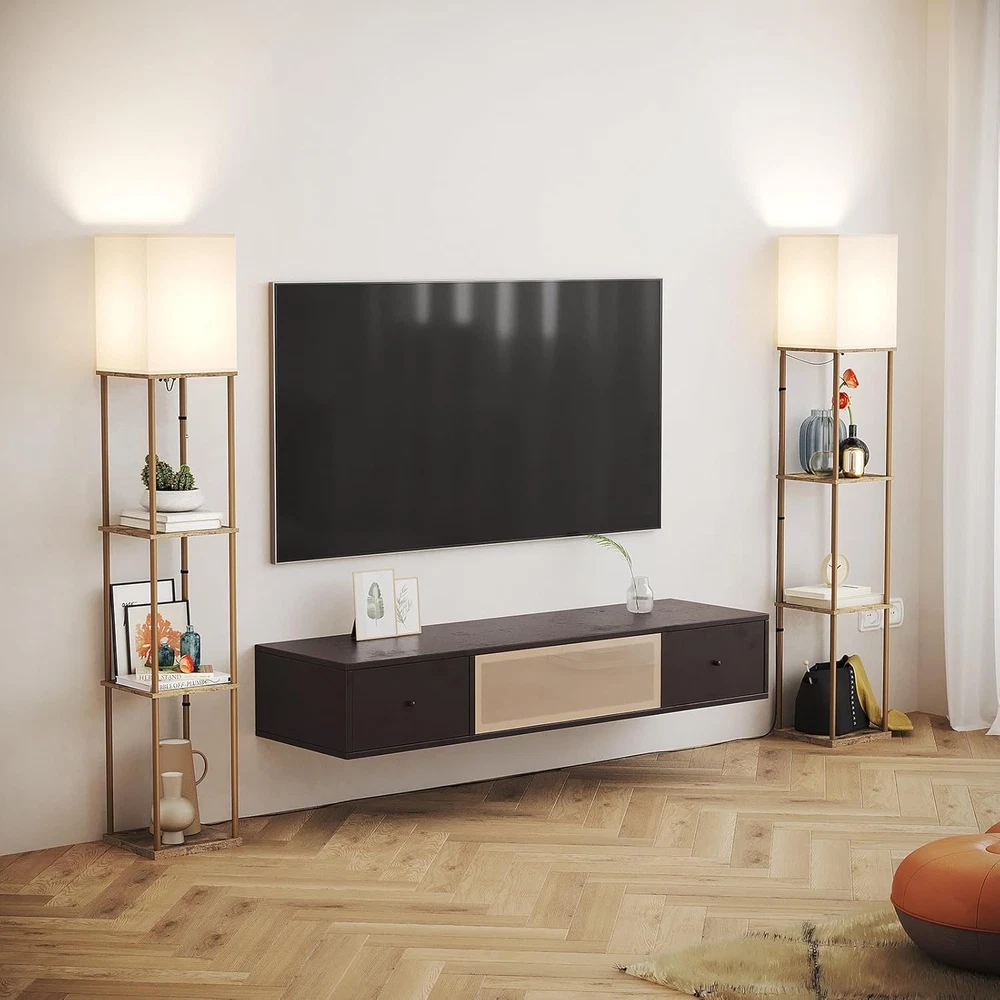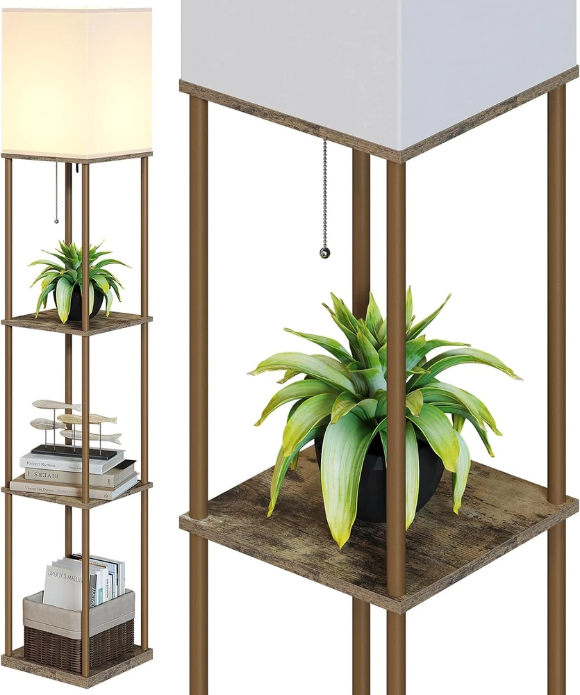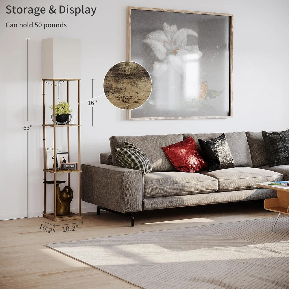 3-Color Temperatures LED Bulb Included: SUNMORY shelf lamp includes a 9 Watt, 800 lumen power saving LED bulb, so you don’t need to buy extra bulb. The LED lamp bulb is 3 color temp : 3000K/5000K/4000K. You can switch different color temperatures according to different scenes. Also can work with smart outlets that are Alexa, Google Home Assistant, or Apple HomeKit enabled(requires smart outlet sold separately). Non-glaring Cloth Lampshade: This shelf floor lamp is equipped with a high-quality off-white cloth lampshade and opens upwards. With the built-in three-color temperature bulb, it can be used for both functional lighting and ambient lighting. Storage & Display: This tall lamp has 3 layers of high density fiberboard, each with a maximum weight of more than 50 pounds. On the shelf, you can put decorations such as vases and photo frames, as well as daily necessities such as books and mobile phones. So it can be used as a corner lamp to decorate your living room or as a skinny nightstand with lamp to bring you life convenience. It is very suitable as a gift for Mother's Day, Thanksgiving Day, or Christmas. Minimalist Design & Versatile Style: The contemporary stand up lamp matches asian, mid century modern, rustic, country and farmhouse decor thanks to its diverse lighting effects and simple lines. Easy to Assemble:SUNMORY shelf floor lamp has been improved in craftsmanship and simplified the installation steps. Compared with other similar products, it will save you 30% percent of installation time. The accompanying package comes with the tools needed for assembly and an instruction manual containing text and video installation steps. Simple repetitive operations are very easy for most people. Warm Tip: Please tighten each post to keep the whole lamp stable. Product Description SUNMORY-Light the world, warm your heart SUNMORY is obsessed with providing high-quality lighting and furniture designed for a cozy life. We work to make design inclusive, simple, elegant, and available for various living spaces as well as promoting to light up your life. 1 For your living room 2 For your bedroom 3 For your studyroom 1 Warm Yellow Light 2 Yellowish Light 3 White Daylight Elegant colors, exquisite wood grain. Exquisite texture, suitable for any home style. Compact size Compact size Pull switch Retro pull switch,easy to operate E26 Base & LED Bulb This SUNMORY shelf lamp comes with a 3-color temperature bulb, you can also buy a bulb that matches the E26 base, like A19/ST64/ST58. Robust & Easy to Assembly SUNMORY shelf floor lamp has been improved in craftsmanship. Compared with similar products, it will save you 30% installation time. Strong & Durable Shelves Each shelf is made of high-density fiberboard, with a maximum load-bearing capacity of more than 50 pounds. You can place heavy objects like books. Quality Lampshade & Soft Light Equipped with a high quality fabric lampshade, this tall lamp has a elegant look that suits all furnishing style. SUNMORY Modern Floor Lamps for Living Room,Bedroom,Office,Study Room,Nursery Room The floor lamp has the dual identity of lighting and decoration. It is a master of creating atmosphere and a decoration expert of matching furniture.