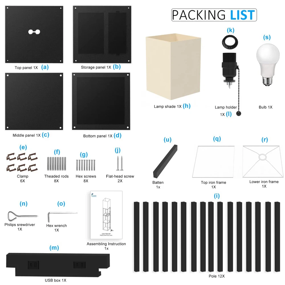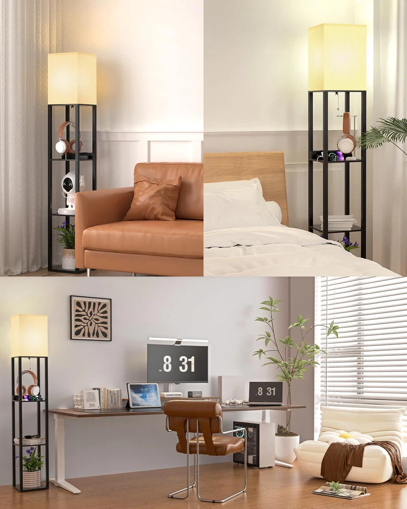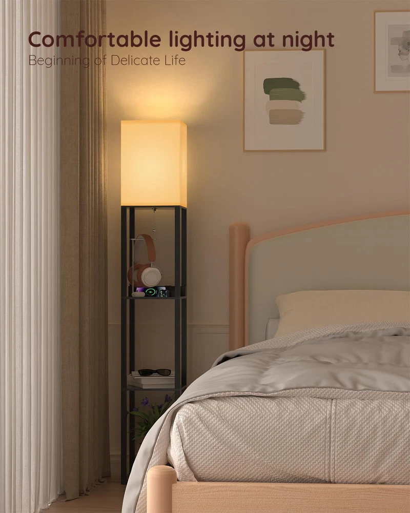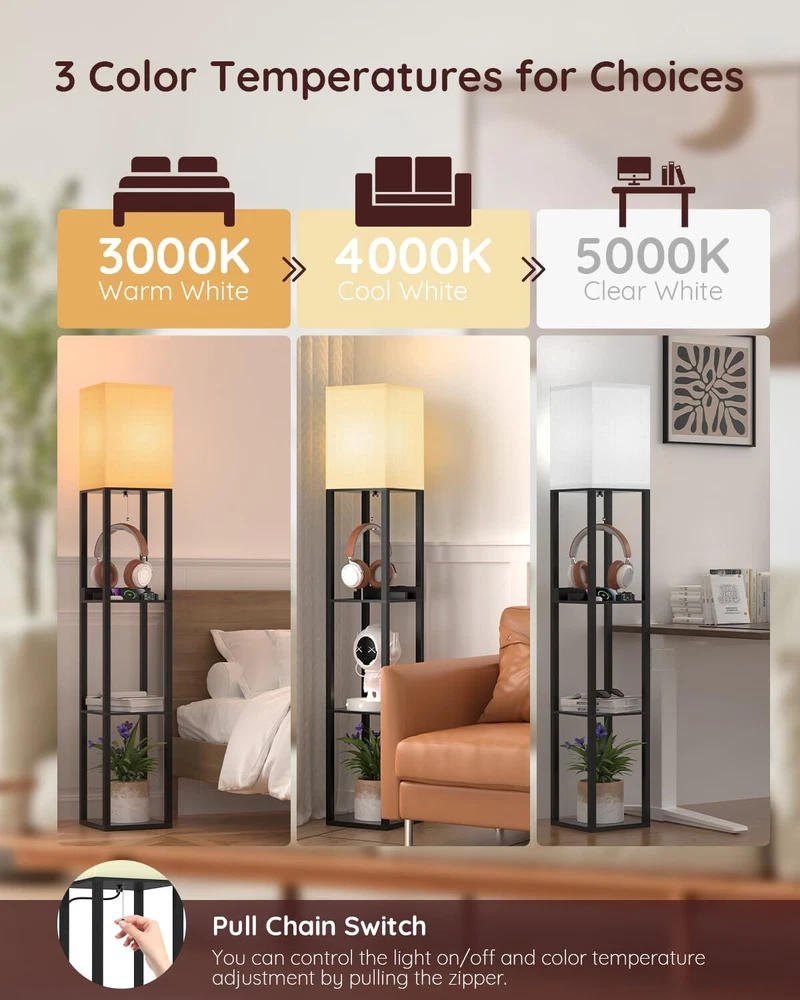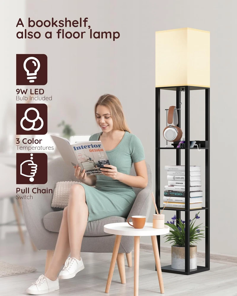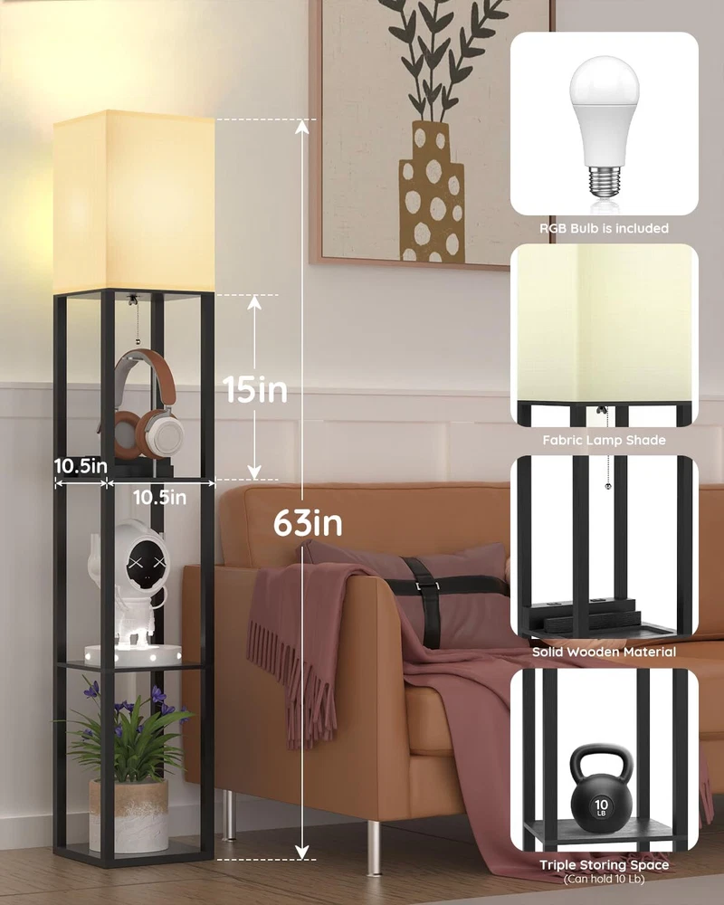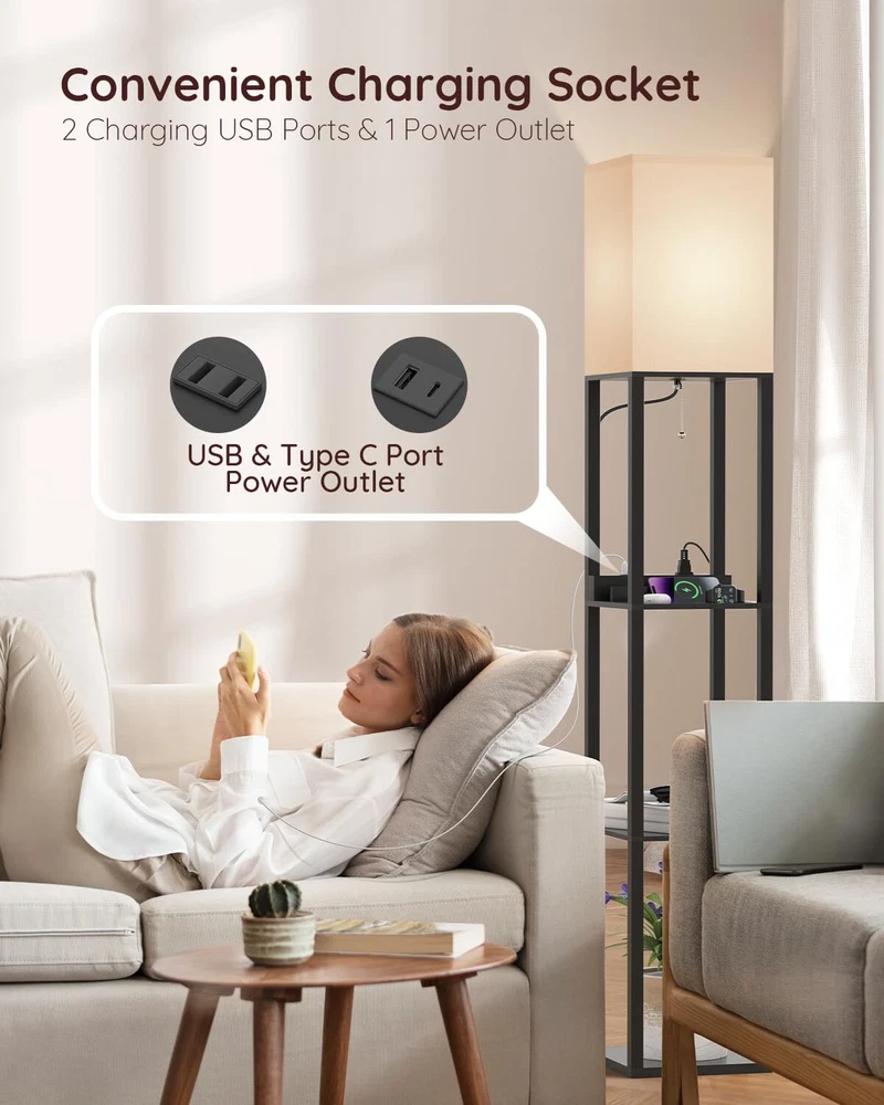 Real Solid Wood Floor Lamp: Shelf floor lamp is made of solid wood and it is stable. The non deforming high density beech frame, 1.5 inch thick, can bear up to 30pounds daily necessities and decorating stuff like plants, vases or books(each shelf can bear a maximum load of 10 Lb). 3 Color Temperature LED Bulb Included: Our shelf floor lamp includes a 9 watt, 805 lumen power saving LED bulb. The LED lamp bulb is 3 color temperature 3000K, 4000K, 5000K. Our floor lamps with shelves is perfect for bedrooms, living room, reading room and office, you can choose different lights to adapt to different scenes. Charging Station Function: The floor lamp built-in One USB + One Type C + One power Outlet allows you to charge three devices at the same time. This will reduce the clutter of charging wires in your living room or bedroom and improve the convenience way. Freedom Storage and Display: The 3 tiers wood panel floor lamp is useful. In addition to charge 3 electronic devices on the first one power panel at the same time, these shelves can also be used as storage for books,cell phones. You can also put decorative ornaments on the bottom or second tier, such as vases, vegetation, photo frames, other decorations and so on. Easy to Assemble & Durable: Quick and easy assembly- manual & tools, 15 minutes of simple tools-free assembly. Comes with the plastic clip to help fold up the power cord and make the whole product look neat. If you encounter any problems during installation or use, please feel free to contact us.