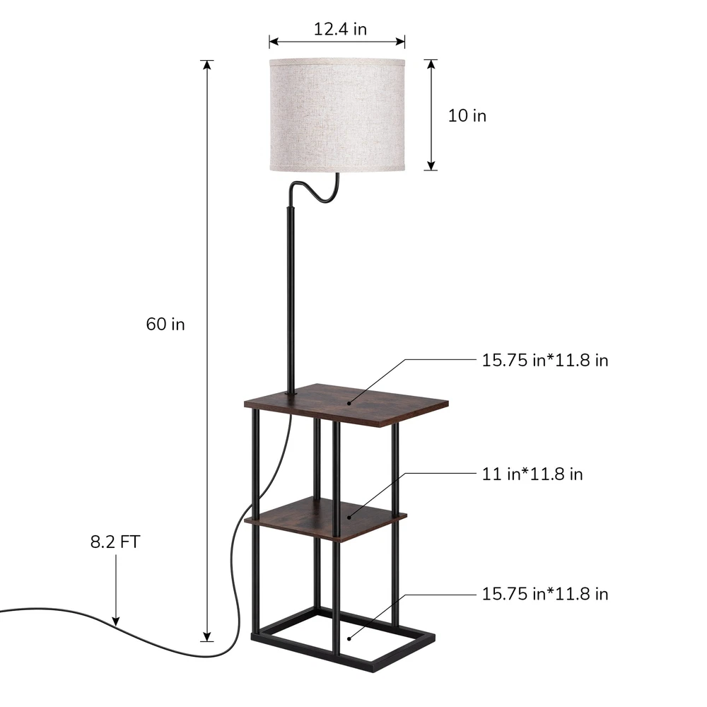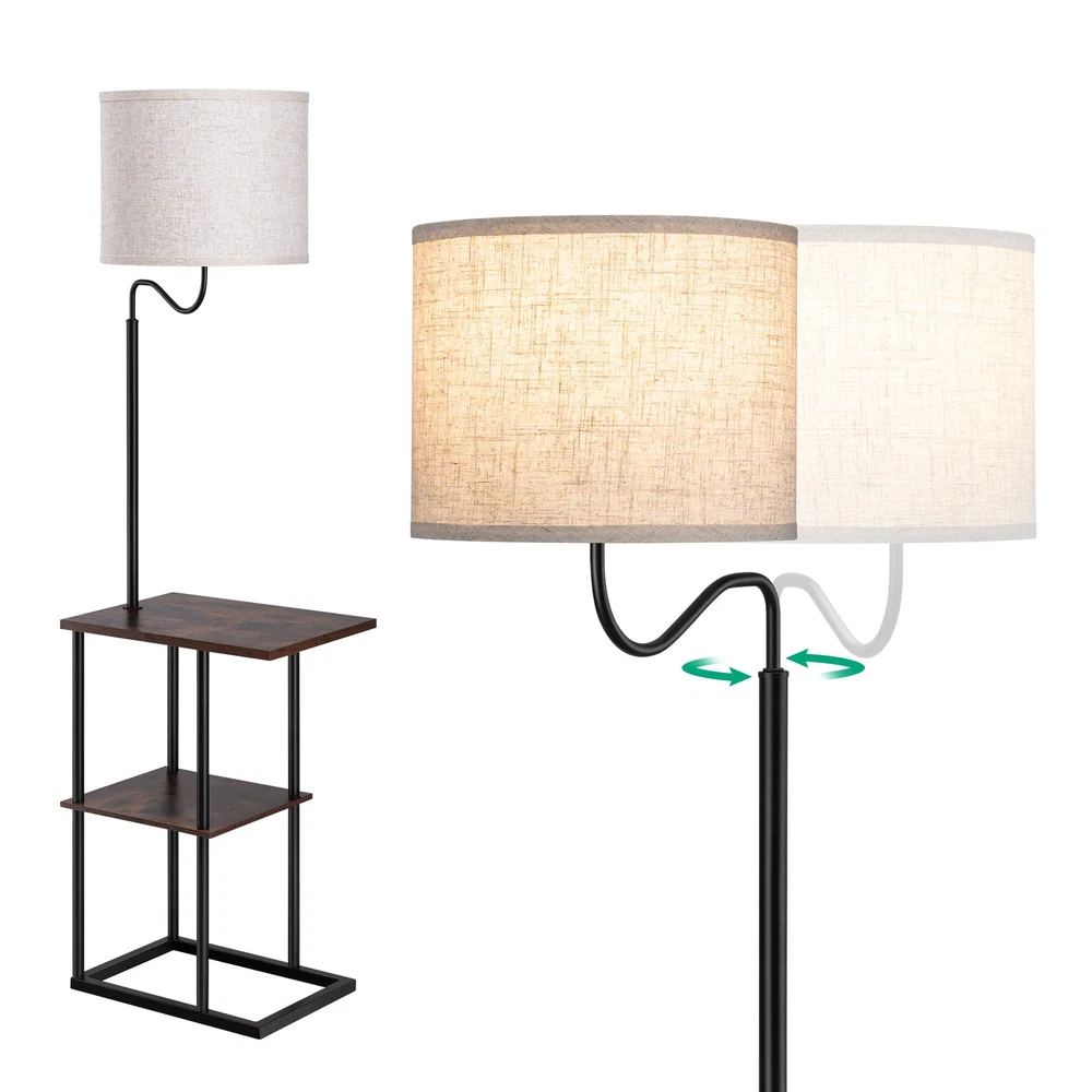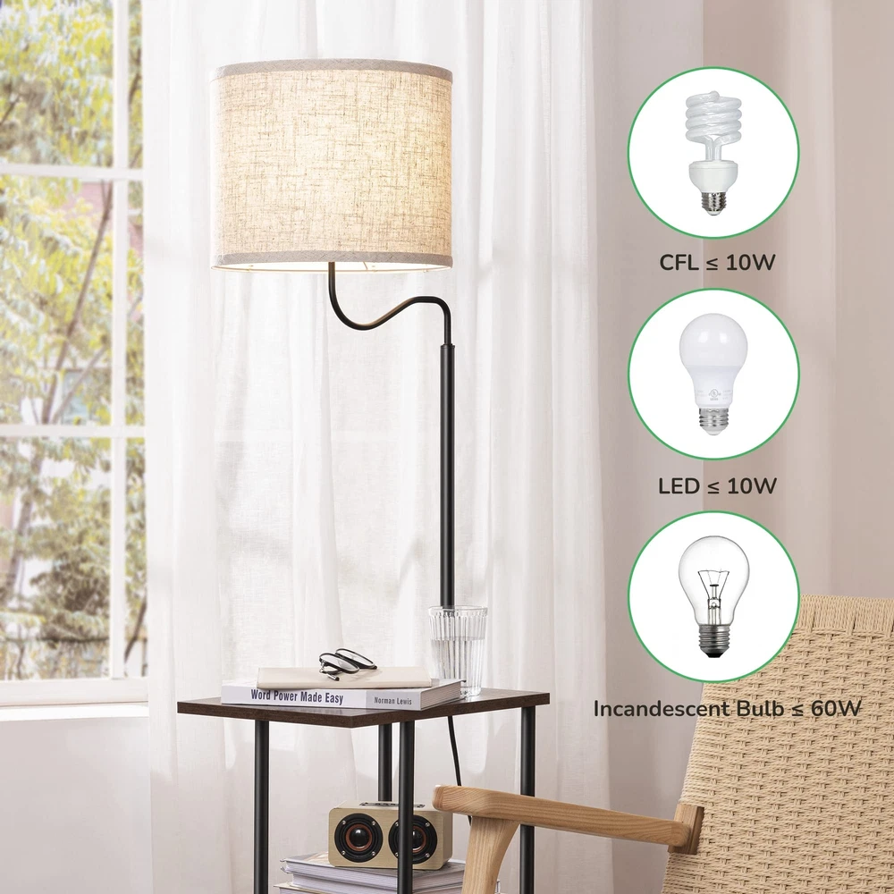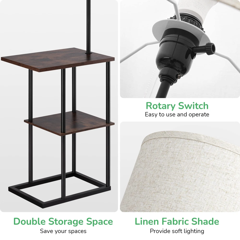 【Space Saving Lamp with End Table】With 2 tables underneath, this lamp/table combo allows you to put iPad, phone, books, magazine, TV remote, drinks, tissue, glasses and any other small items in easy reach; 11.8" wide table is ideal for small space such as between recliners, bedside, guest room, office, apartment, etc. 【Mid Century Modern Design】Designed with black metal legs, wood shelves and linen lampshade, this mid-century stylish floor lamp matches other furniture and decors from traditional to contemporary perfectly, creating a cozy and comfortable ambiance for your living room, bedroom, couch area, reading corner, etc 【Soft Light for Reading】Linen drum lampshade is thick enough to soften beams and minimize glare, the modern floor lamp can be used for large ambient light illumination as well as accurate area lighting for working, reading or needle work in the couch, chair and bedside area, protects your eyes 【Stable & Sturdy】Rectangular metal frame ensures stability and safety, prevents any subtle wobble when moving the floor lamp, built-in bulb won't be knocked off by your cats; adopted with solid wood, these thicken shelves are scratch-resistant, waterproof and easy to clean 【Easy to Assemble & Rotary Switch】No tools required, this tall floor lamp with shelves is easy to assemble in several minutes; designed with a rotary switch, convenient to turn it ON/OFF even lying on the couch or bed; suits E26 bulbs (LED/CFL ≤ 10W; incandescent Bulb ≤ 60W), bulb not included