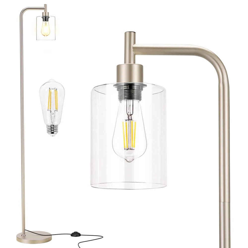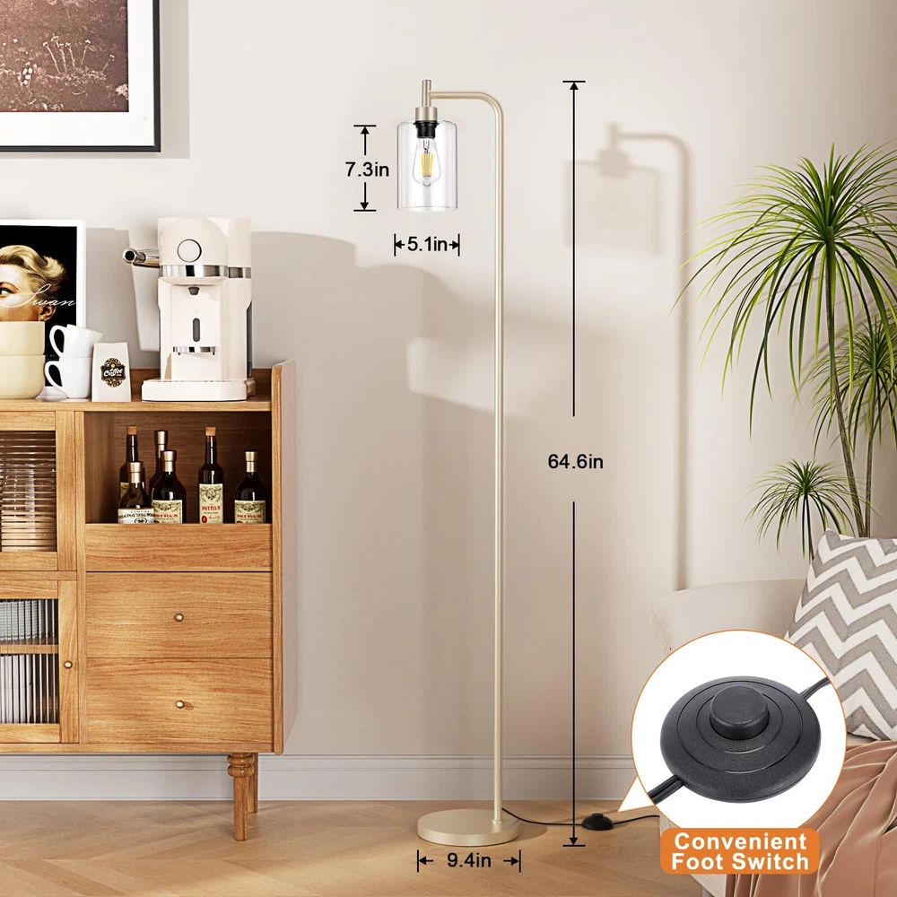 【Gold Floor Lamp with Modern Design】 - 64.5" floor lamp design style is simple and modern, and can match different styles of furniture you want. Tall lamp will transform your home decor into a rustic and farmhouse atmosphere. Gold standing lamp can fit perfectly in your living room, bedroom, corner or office and take up very little room and has a classy, look to it. Floor lamps for living room bright lighting both blends in and provides unassuming accent to the space. 【Replaceable LED Bulb】- Modern floor lamp with 3000K/6W LED bulb provides warm white light to create a comfortable atmosphere for your home. It's also brighter than those ordinary lamps and can light up a larger space in your home. This light bulb is replaceable and can be changed to the type you want according to your preferences. We have already provided you with a ST58 bulb, so you don't need to buy any more. 【Heavy Base, Safe to Use】- Industrial floor lamp has a highly stable base and lamp pole and can stand firmly on the floor, which prevents the elderly, children and pets from being overturned. The standing light is equipped with a rust-resistant gold metal body and a sturdy clear glass shade, which makes it look gorgeous and expensive. Based on the moderate weight of pole lamp, you can easily place it anywhere you want. 【Foot Pedal Switch, Liberate Your Hands】- In order to bring more convenience to your daily life, we specially chose the foot switch design for floor lamp. The on/off switch is a push button that sits on the floor so you could press it with your foot easily. With the simple flick of a switch, you can get lighting or not. Easy to operate, greatly liberate your hands! 【Easy to Assemble】 - This living room lamp can be easily assembled without tools, as all the detachable components are included in the package. In just a few minutes, you can the instructions to put all parts of the tall lamp together. Instructions are included in the package, and assembly are attached to the product page.