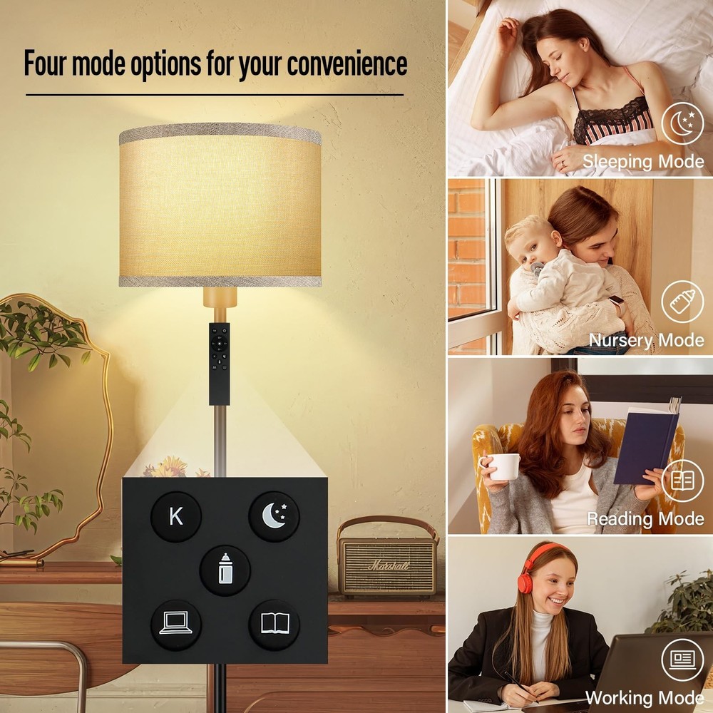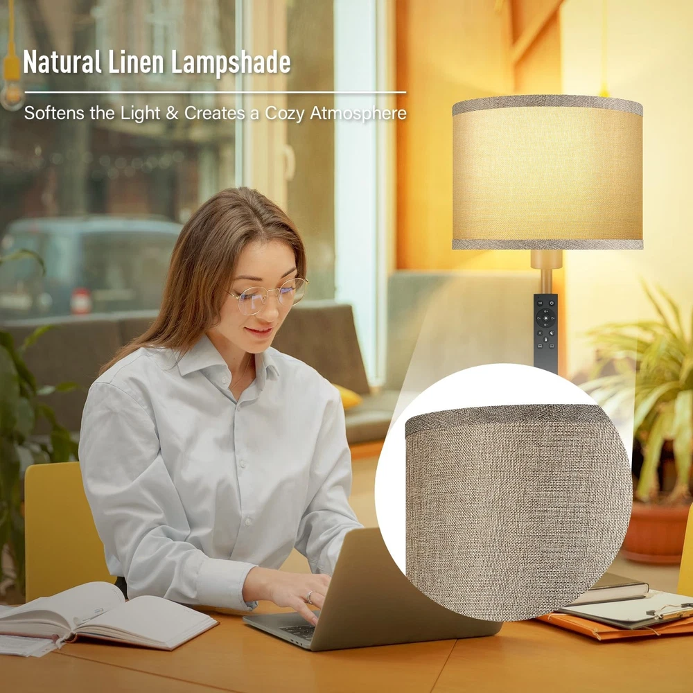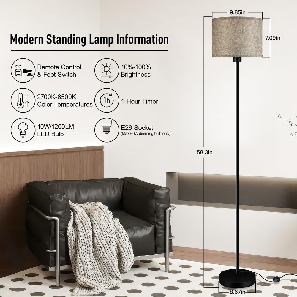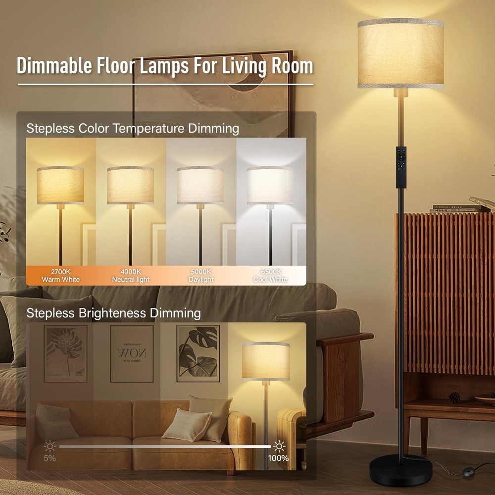 Floor Lamps for Living Room, Stepless Dimmable Floor Lamp with Remote, 2700K-6500K Colors Temperature & Brightness Adjustable,10W/1200LM Jute LED Floor Lamp, Modern Standing Lamp for Bedroom/Office Product Details Color: Jute Brand: Bricosmocon MPN: B1186 UPC: Does not apply EAN: Does not apply Finish Type: Smooth Base Material: Metal Bulb Base: E26 Product Dimensions: 9.85"D x 9.85"W x 58.31"H Lamp Type: Floor Lamp Product Dimensions : 9.85 x 9.85 x 58.31 inches; 6.11 Pounds Item model number : B1186 Date First Available : March 22, 2025 Manufacturer : Bricosmocon Country of Origin : China Customer Reviews: 4.4 4.4 out of 5 stars 80 ratings Finish Type: Smooth Base Material: Metal Bulb Base: E26 Product Dimensions: 9.85"D x 9.85"W x 58.31"H Lamp Type: Floor Lamp Shade Color: Jute Shade Material: Linen Switch Type: Remote Style: Modern & Classic & Simple & Vintage & Boho Brand: Bricosmocon Color: Jute Special Feature: Remote Control & Foot Switch, Stepless Dimmable Light Source Type: LED Material: Metal Room Type: Living Room/Bedroom/Study Room/Office/Farmhouse Power Source: Corded Electric Number of Light Sources: 1 Included Components: Linen Lampshade, Stepless Dimmable LED Bulb, Remote Control, Foot Switch Is Waterproof: False Bulb Shape Size: A19 Mounting Type: Floor Mount Wattage: 60 watts Number of Items: 1 Lighting Method: LED Indoor/Outdoor Usage: Indoor Water Resistance Level: Not Water Resistant Efficiency: High Efficiency Voltage: 120 Volts Brightness: 1000 Lumen Is Cordless?: No Manufacturer: Bricosmocon Part Number: B1186 Item Weight: 6.1 pounds Country of Origin: China Item model number: B1186 Finish types: Smooth Special Features: Remote Control & Foot Switch, Stepless Dimmable Batteries Included?: No Batteries Required?: No Date First Available: March 22, 2025 Stepless Dimmable Floor Lamp, Create Personalized Lighting: This floor lamp with remote control includes a 10W/1200LM LED bulb (lifespan50,000h), capable of dimming function from 10%-100% brightness, color temperature from 2700K-6500K, suitable for warm white, natural white, daylight and cool white; It can be used according to the scene need to create different atmospheres and visual effects, perfect for use as a living room corner floor lamp, floor lamp for bedroom, or office floor lamp. Smart Remote Control Operation, Multiple Modes for Easy Switching: This modern floor lamp has two control options: remote control and foot switch; the remote control features a 1-hour timer function and direct switching between sleeping mode,nursery mode,reading mode,and working mode, these modes make this LED floor lamp highly practical, which can be selected according to different needs;It's a good choice if you want a standing lamp that can be convenient and enhance the lighting atmosphere. Combining Aesthetics and Practicality: Made of high-quality metal and natural jute linen materials, make this jute floor lamp more safe; The linen lampshade can soften the light to avoid direct light to the eyes; You can easily adjust the brightness and color temperature to create a comfortable and cozy home atmosphere; Simple and modern design, whether you place this bright floor lamp in any place you want to light up,can be perfect to integrate into the decorative design,light up every space. Easy to Assemble: Just follow the installation instructions, only 5 minutes, you can easily have a complete corner floor lamp; Pole lamp remote control comes with matching instructions on the back, just a few steps, you can easily match, more convenient for your operation; Additionally, the remote control has a magnetic attachment function, allowing it to be easily adsorbed on the pole of the tall lamp or any metal furniture, reducing the risk of losing it and making it easy to access. Compatible with Smart Devices: You can plug this modern standing lamp into the smart plug (not included) and add it to your appliance group, you will be able to control it through your smartphone, which will bring you a smart and modern living experience; This simple floor lamp is equipped with a 71in extension cord, which allows you to move it to the right position at will, and the stable base allows you to place it in a variety of corners, such as the bedside, sofa and other corners.