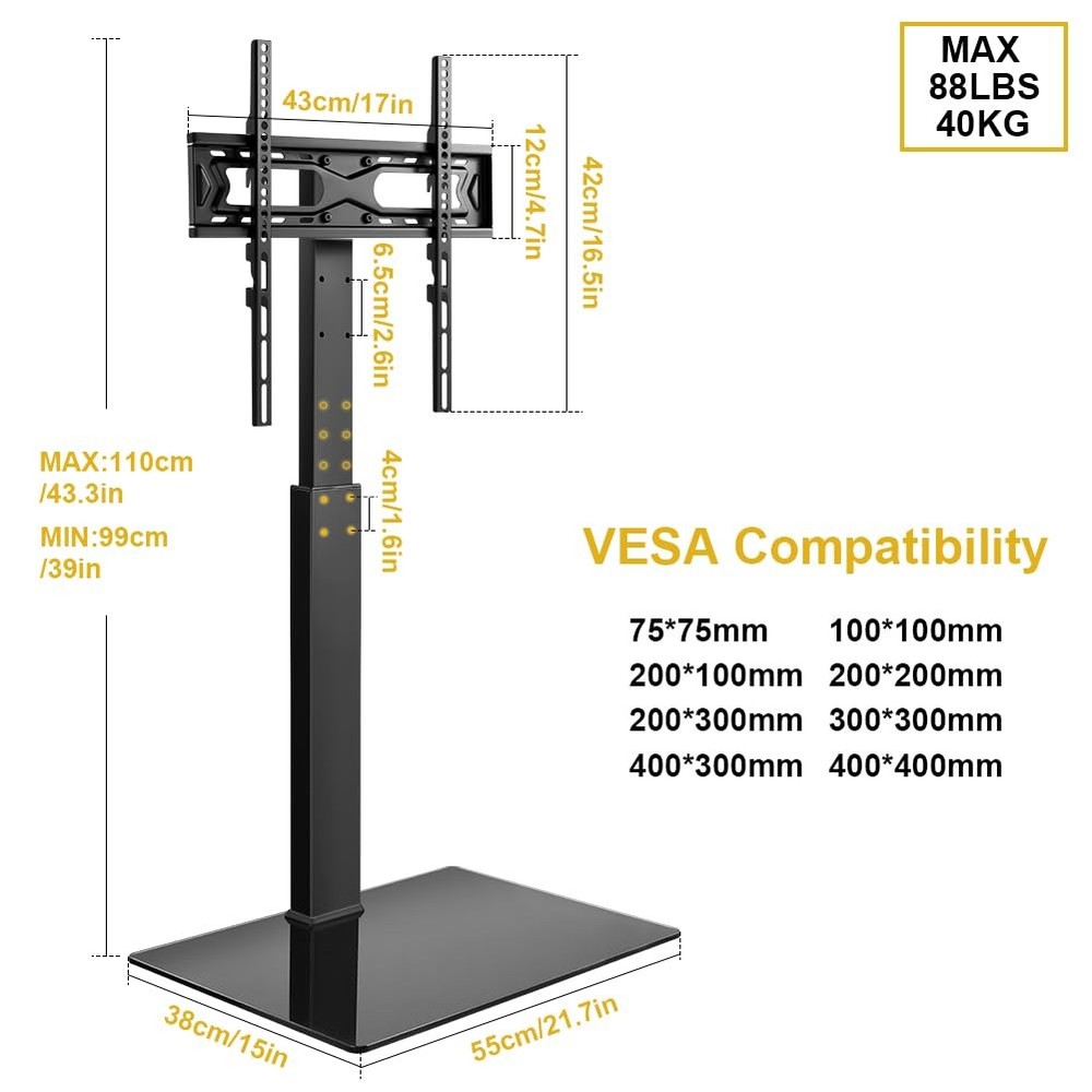 Floor TV Stand for 27-65 inch LED Screen Adjustable TV Stand with Mount Swivel Floor Televisions Stand with Tempered Glass Base for Corner Bedroom Living Room Max VESA 400x400mm 27’’- 65’’ Wide TV Compatibility: this floor tv stands is desighed to hold 27’’ to 65’’ TV screen up to 88 pounds. Vesa patterns from 75x75mm to 400x400mm. For more details, please check the product picture. Please verify the screen size, weight capatity, and vesa pattern before purchase. 14 Height Adjustable Variations: 7 panel height settings and 2 hook positions, this floor standing TV stand offers 14 different height configurations from 39″ to 43.3″. Don’t worry about adjusting the height, different position to different height. ±30° Swivel Optimal Viewing Angles: Swivel universal tv stand allow you to swivel the tv screen left or right by 30° to meet your eye sight. TV stand for bedroom, tv stand for living toom, also suitable for classrooms, offices, meeting rooms. Moden TV Stand with Tempered Glass Base: swivel tall tv stand base is designed with a 21.7″ x 15’’ large tempered glass. This tv stand with non-slip pads to avoid scratching the floor, yet provide stability and safety for your equipment. Easy Assembly with Installation Manual: no need to punch holes in the wall. All accessories and screws come with the package. Assembly instructions are clear easy to follow, you can set up together within 15 minutes. If you have any questions, we are happ to help you. Floor tv stand, TV stand with swivel &14 height settings. 65 inch floor tv stand for bedroom, floor tv stand for metting room, tall tv stand for living room, floor tv stand for home therate, ±30° swivel floor tv stand for bedroom, universal tv stand with tilt, 14 type height adjustable tv stand, floor televisions stand with tempered glass base. Vesa patterns from 75x75mm to 400x400mm. Set up together with 15 minutes by follow the instruction manual. Shipping We offer FREE shipping on all orders! We ship within Three business days of payment, usually sooner. We use a selection of shipping services such as UPS, FedEx, USPS etc. We only ship to the lower 48 states, no APO/FPO addresses or PO Boxes allowed. Local pickups and combined shipping options are not provided at this time. Return You can return a product for up to 30 days from the date you purchased it. Any product you return must be in the same condition you received it and in the original packaging. Please keep the receipt. Payment We accept payment by any of the following methods: PayPal Please pay as soon as possible after winning an auction, as that will allow us to post your item to you sooner! Feedback Customer satisfaction is very important to us. If you have any problem with your order, please contact us and we will do our best to make you satisfied. Contact Us If you have any queries, please contact us via ebay. We usually respond within 24 hours on weekdays. Please visit our eBay store to check out other items for sale! Thank you for shopping at our store.