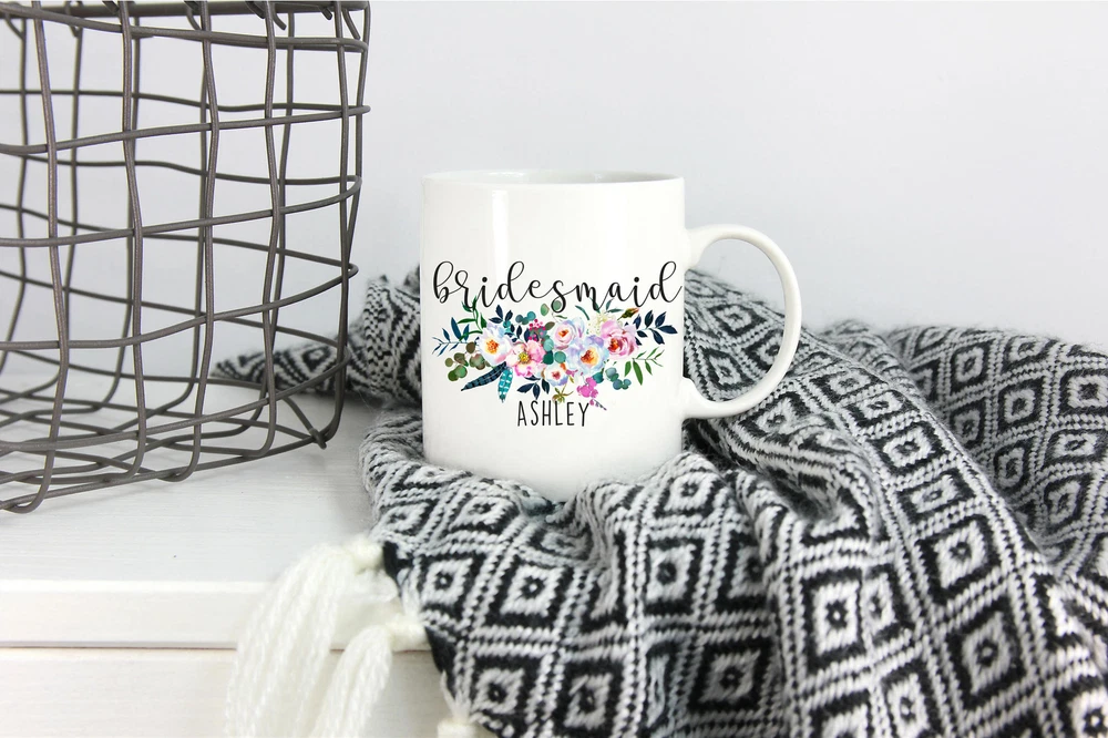 Floral Bridesmaid Mug Custom Bridesmaid Gift Unique Bridesmaid Gifts Product Details.. This high quality 11oz. ceramic white mug has a premium hard coat that provides crisp and vibrant color reproduction sure to last for years. Perfect for all hot & cold beverages. The highest quality printing possible is used. It will never fade no matter how many times you wash it. Material: 100% Ceramic. Print both sides. Dishwasher and Microwave Safe. High Gloss + Premium White Finish. Printed in the U.S.A. Personalized & Custom. We support personalized and custom mug to add custom, when placing an order, you can add notes to the "order note" in shipping address section. Also you can contact us directly via message. Shipping Info. Ready to ship in 1 to 2 business days, All products are made-to-order and proudly printed in the United States. Shipped by USPS and DHL, You will receive your order in 5-7 days. Replace & Refund. All products are defective during shipping broken, chipped will be replaced free of charge. You are not satisfied with the product, we will refund 100% money to you. If any other issues arise, please do not hesitate to message, we would be more than happy to assist you.