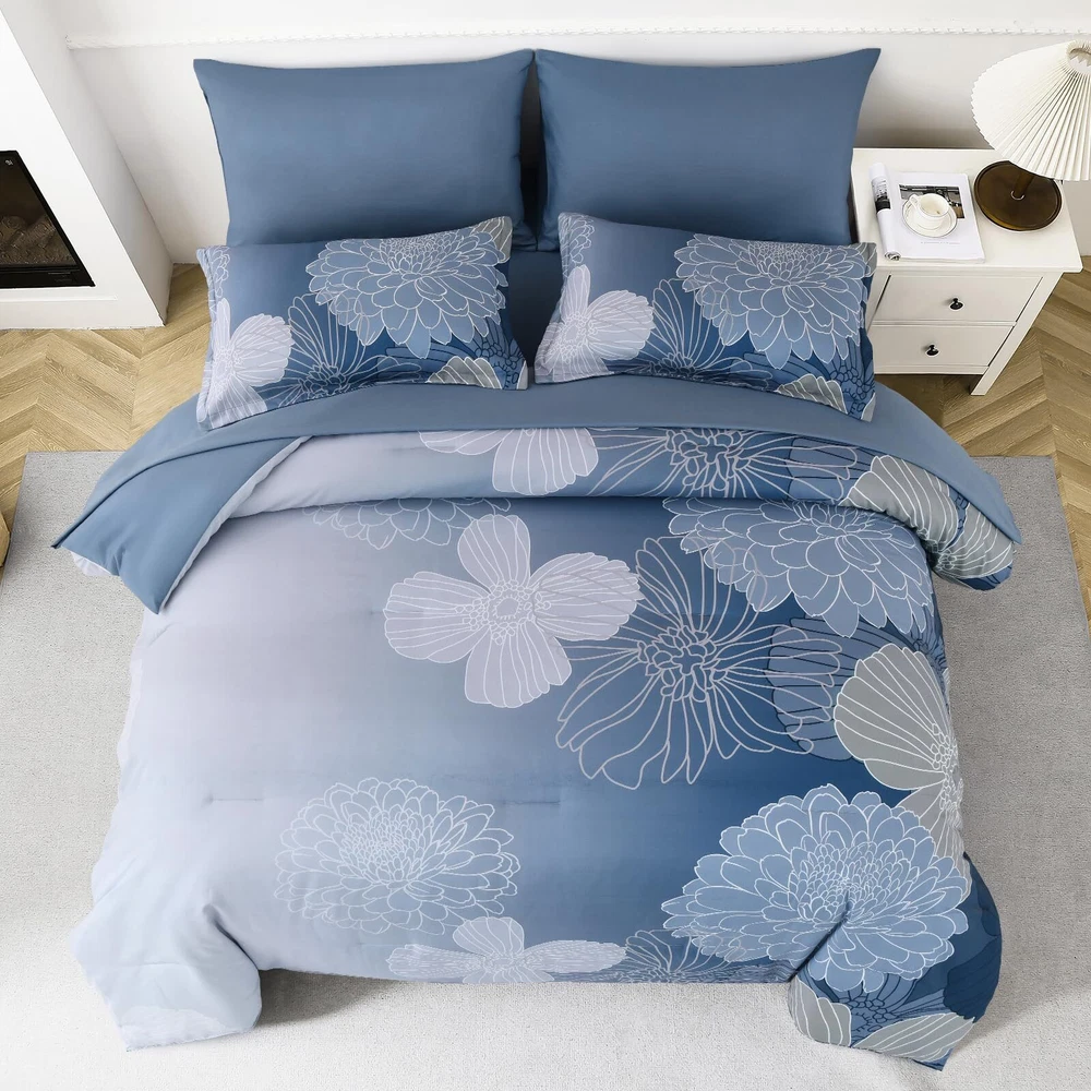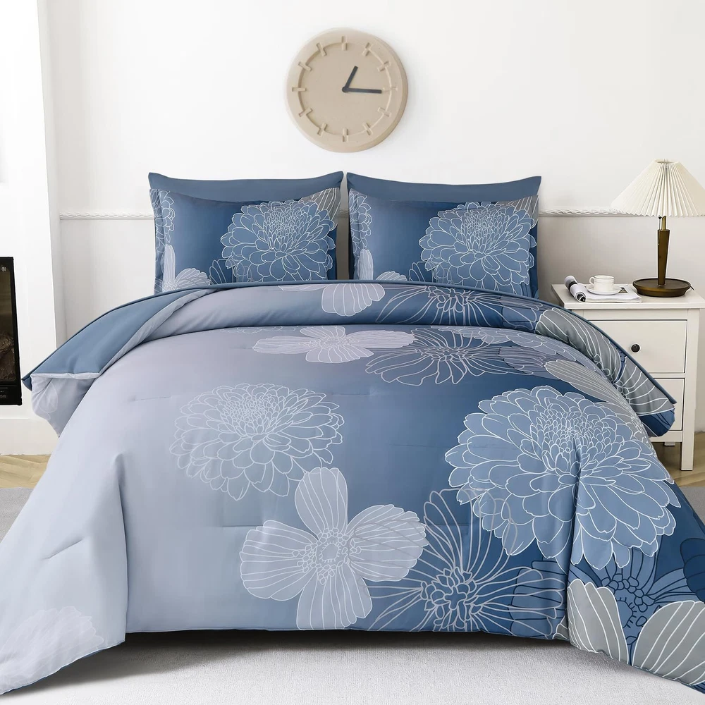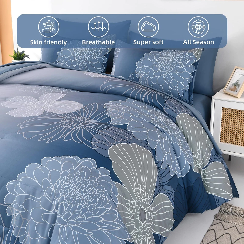 【Complete Bedding Set】Includes 1 comforter(90"x90"), 1 Flat Sheet(90"x102"),1 Fitted Sheet(60"x80"+12"),2 Standard Pillowshams(20"x26"),2 Standard Pillowcases(20"x30").Everything you need to create a cozy and stylish bedroom. 【Floral Design】The floral chic pattern of the comforter adds a bold and vibrant touch to your bedroom decor.The unique design is perfect for those who want to add a touch of fashion style to their home. 【Soft and fluffy】Made of high-quality microfiber fabric and polyester filling,this bedding set is soft,fluffy,comfortable,and lightweight. You'll enjoy a deep and restful sleep all night long. 【Expert Craftsmanship】The tight stitching process used in this bedding set prevents the quilt from moving and clumping,ensuring that you'll enjoy a comfortable sleep.The set is durable and suitable for all seasons,so you can use it year-round. 【Easy Care】This 7-piece bedding set is machine washable in cold water on a gentle cycle.Tumble dry on low temperature and do not bleach.The colors will stay bright and vibrant even after repeated washes.