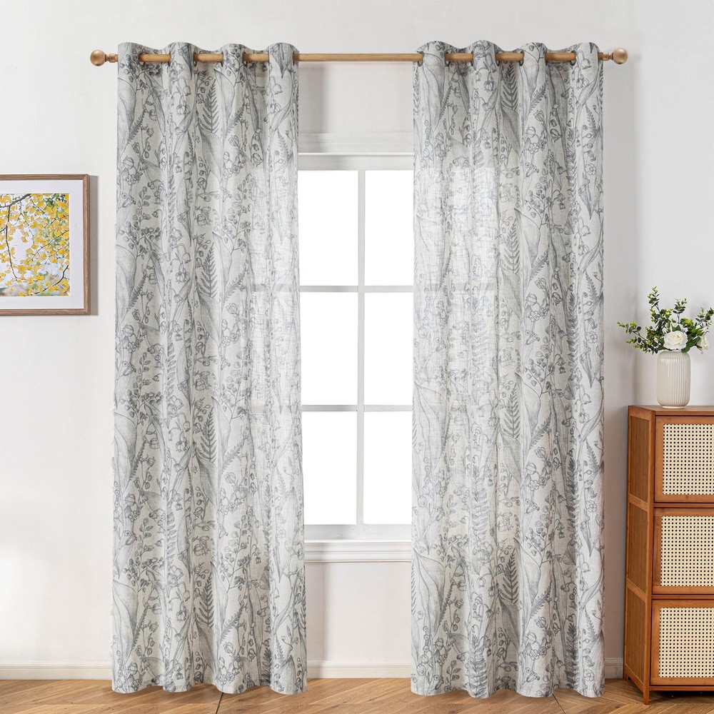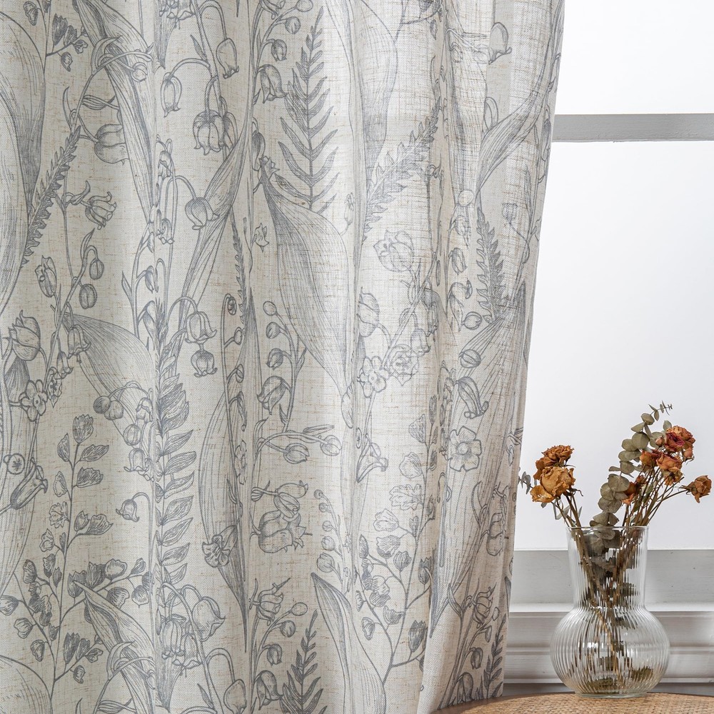 Light-filtering linen curtains decorate your home better! These premium Semi-Sheer curtains provide better privacy and Avoid direct sunlight to our eyes, and the room can also have plenty of natural sunlight. Apply to a farmhouse, bedroom, living room, guest room, dining room, home office, and any other place. BASIC INFORMATION: Includes 2 curtain panels, each measuring 52 inches wide for a total of 104 inches. Each panel with 8 grommets (1.6" in diameter)fit standard or decorative curtains rod. UNIQUE MATERIAL: The curtains adopt the linen polyester blend fabric, The linen makes them look and feel aesthetic while the polyester makes them drape so nicely and keeps them largely wrinkle-free, add a refined style to the room. LIGHT FILTERING SEMI SHEER: Unlike ordinary sheer curtains, the woven texture in the fabric is not too sheer, which protecting privacy while properly allowing enough natural light to flow into the room during the day. UNIQUE HOME DECOR: Designed with lily of the valley flower pattern, which bring you the feeling of fresh and elegant. And design choices of different colors and patterns match your living room, bedroom, dining room, kitchen bathroom, and farmhouse, update the look for your room. EASY CARE: Machine washable in cold water, gentle cycle, tumble dry. warm iron if needed.