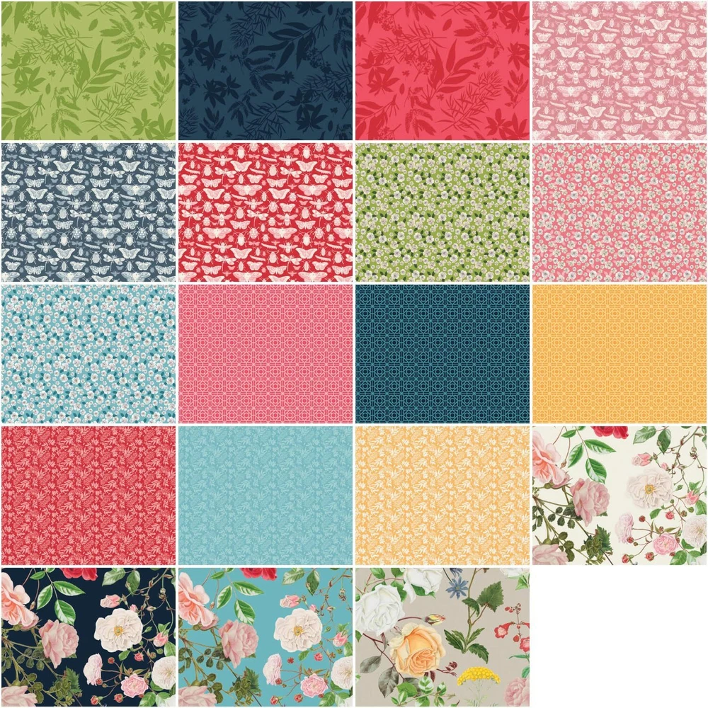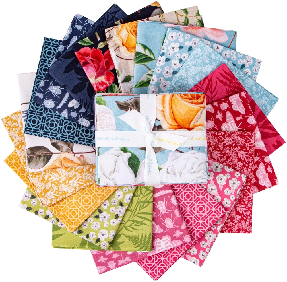 Fabric bundle of 19 18-inch by 22-inch fat quarters from the Floral Gardens collection inspired by The Royal Horticultural Society by . The Royal Horticultural Society (RHS) was founded in 1804 and is the UK's largest gardening charity. The RHS vision is to enrich everyone's life through plants and make the UK a greener and more beautiful place via its inspirational gardens and shows, science research and advisory, extensive library collections and far-reaching education and community programs. With over 600,000 members the RHS also shares its horticultural knowledge and expertise with millions of people every year through its website and publications. In 2021, the RHS launched its Sustainability Strategy, committing to be net positive for nature and people by 2030. The supporting RHS Planet-Friendly Gardening Campaign will continue to harness the power of the UK's 30 million gardeners to help tackle the climate and biodiversity crisis. One fabric is 55% cotton and 45% linen. Floral Gardens collection from Riley Blake Designed by Fat Quarter Bundle includes 19 18-inch by 22-inch fat quarters 100% Cotton; premium quilt shop quality fabric Inspired by The Royal Horticultural Society