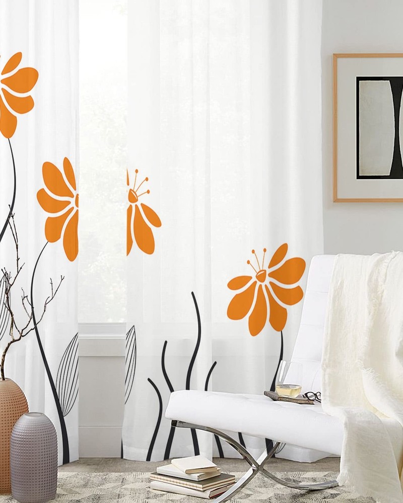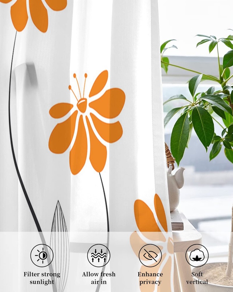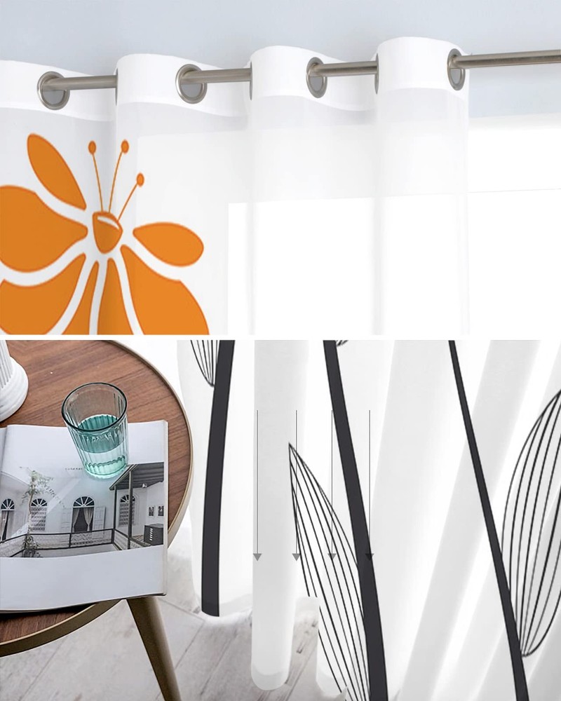 Floral Sheer Curtains, 90"W x 52"L, Orange, 2 Panels, Grommet Top, Modern Sty...