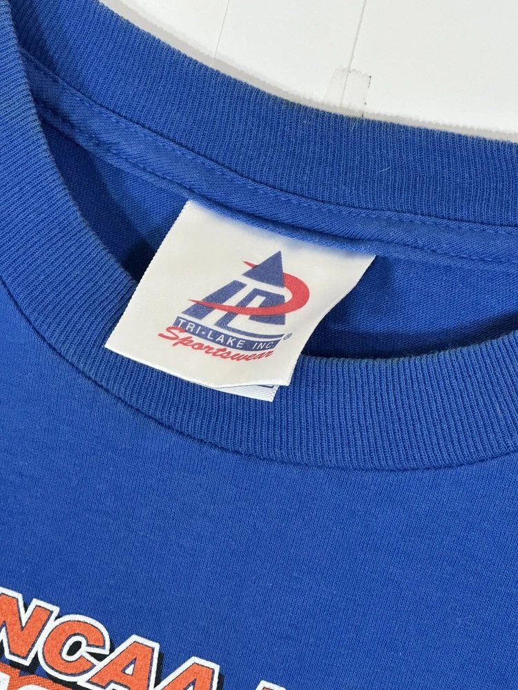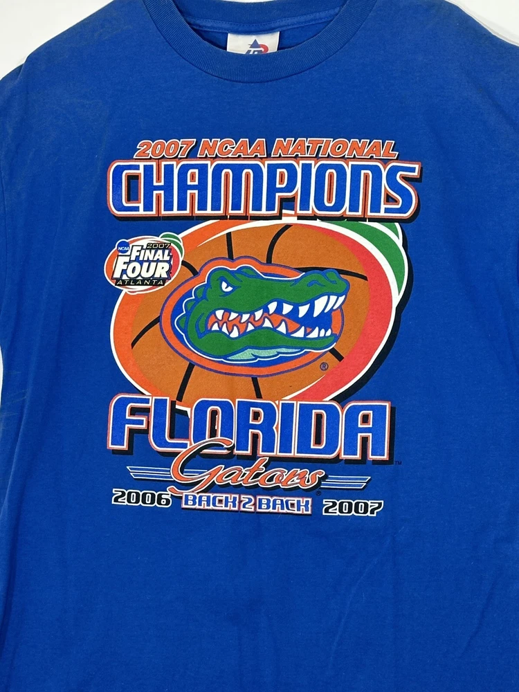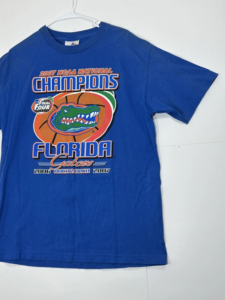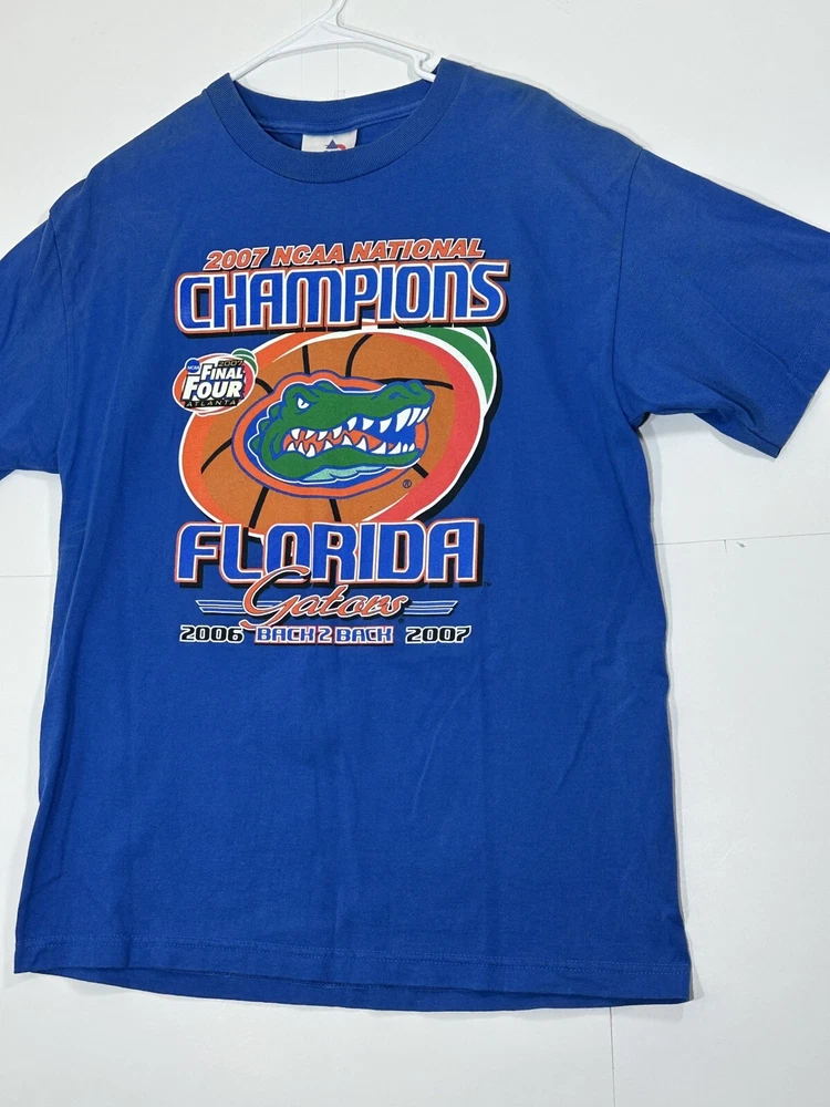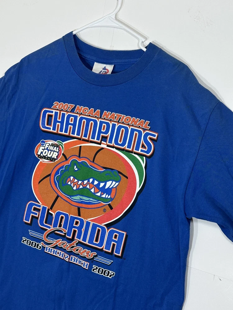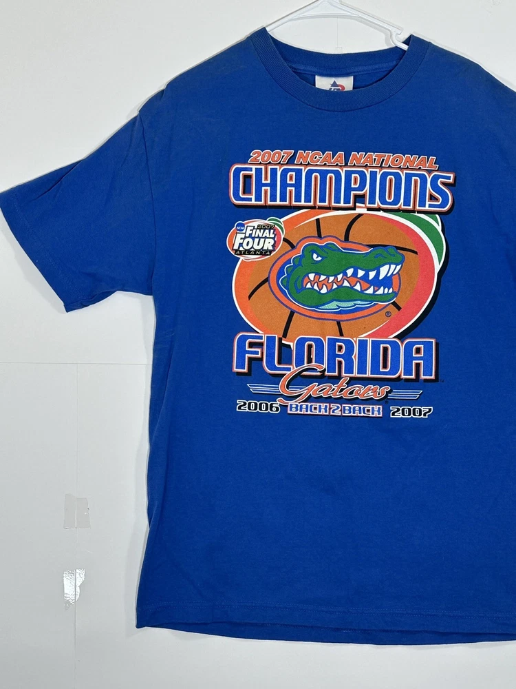 Florida Gators 2007 NCAA National Champions Blue Graphic T-Shirt Mens Size Large Y2K Very decent - to - okay condition overall - see ALL photos very closely for condition Tee has light moderate - wear /tear overall throughout mostly just some light - mild storage marks/spots on the shoulder inseam line top of the shirt - both sides of the tee - needs a little cleaning - see ALL photos very closely for condition of the shirt Will ship with care