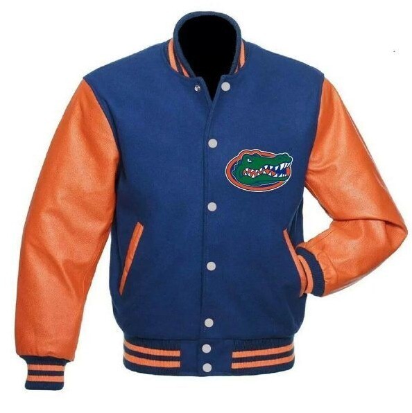 Inspired By American Football Team Florida Gators Material: Body made from wool and sleeves made from genuine leather Color: Blue & Orange Collar: Rib-knitted style collar Front: Snap tab buttoned front closure Sleeves: Long sleeves Cuffs: Rib-knitted cuffs Inner: soft viscose lining Fine quality stitching Pockets: Two side waist pockets Hemline: Rib knitted hemline. Please double check the measurements from size chart and choose your size accordingly.