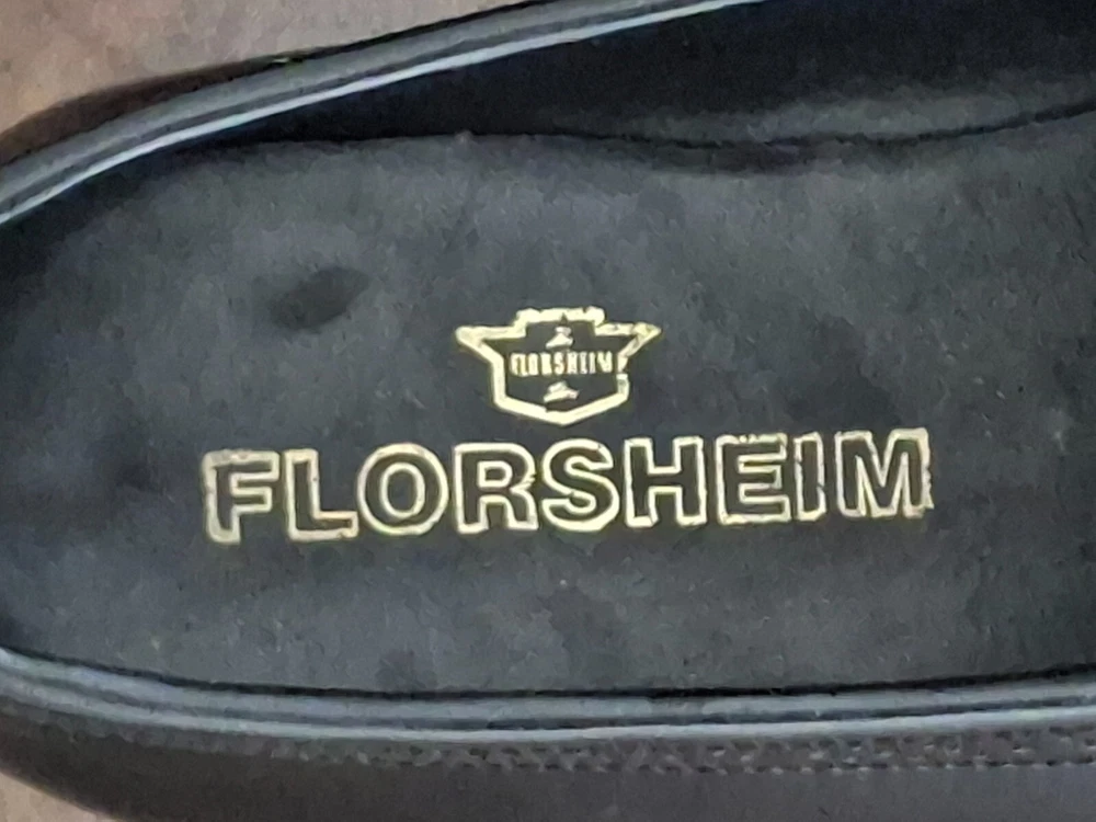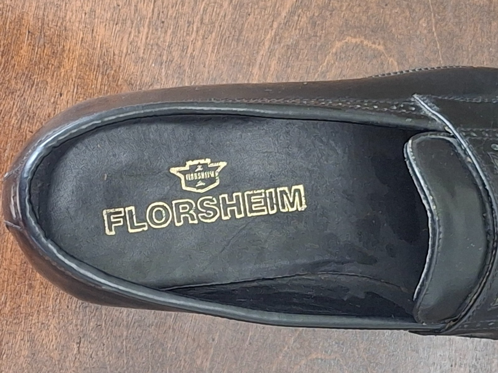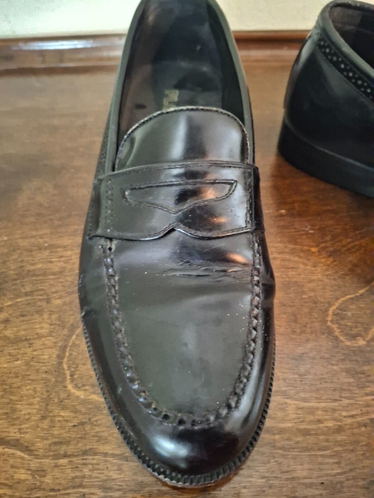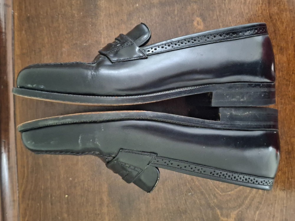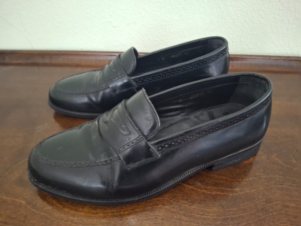 Florsheim Black Leather Penny Loafers, Size 9W. There are a few small scuffs from use and obvious use on the soles but the shoes are in Very Good Pre-Owned Condition.