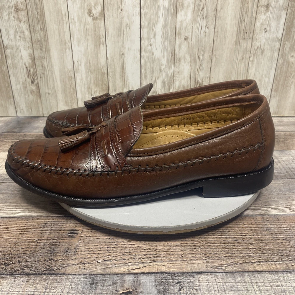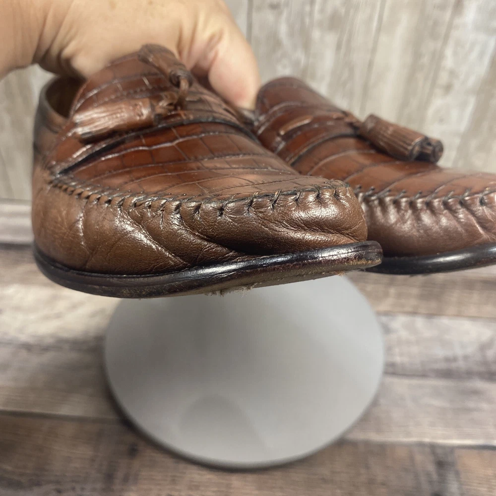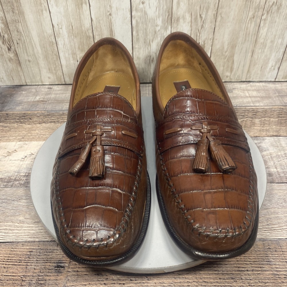 The product is a pair of Florsheim Men's Dress Shoes in Brown Croc Embossed Leather Loafers with Tassel detailing. Good condition. Show some wrinkles. Please check all the pictures.