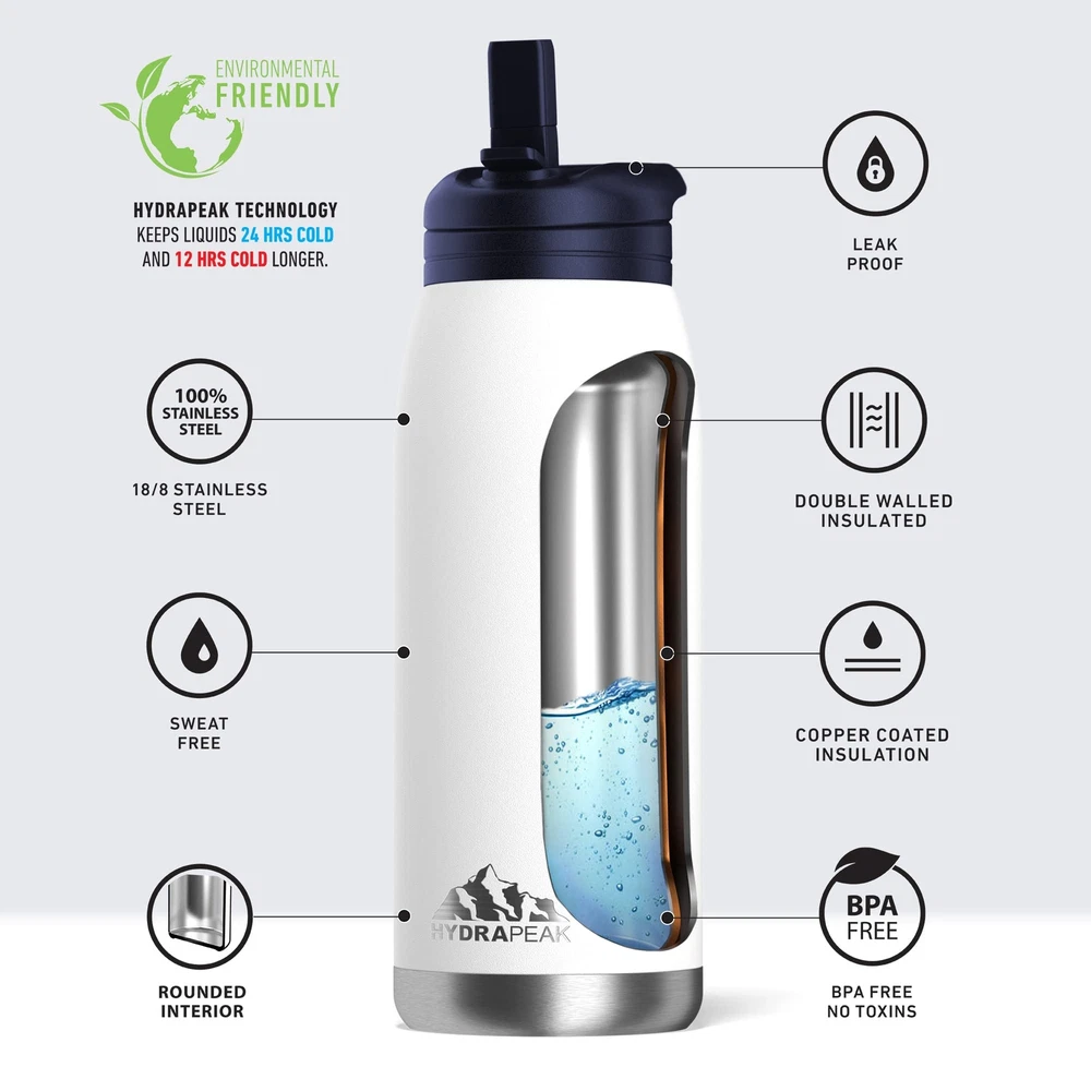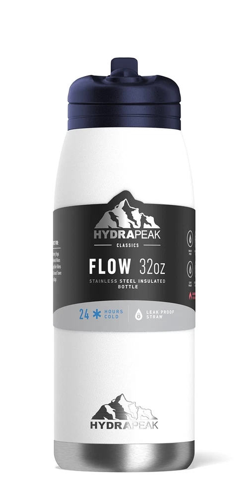 Flow 32oz Insulated Water Bottle with Straw Lid | Double Wall Vacuum Insulated Stainless Steel Water Bottles, BPA-Free and Leak-Proof, Wide Mouth Flask with Bite Straw and Handle (White) DOUBLE WALL VACUUM INSULATION: Keeps drinks cold for 24 hours and hot for 12 hours, making this water bottle a top choice for a thermos bottle or canteen water bottle. It's perfect for any occasion and great for staying hydrated on the go. LEAK PROOF AND SPILL PROOF: Our design ensures that you won't have to worry about accidents while using these stainless steel water bottles. They're perfect for the gym, school, or outdoors and can hold up to 32 ounces of your favorite drink. QUALITY: Made with high quality 18/8 food stainless steel and a premium coated finish, this insulated water bottle is durable and stylish. It doesn’t retain any odors or flavors, making it a great choice for water bottles will love. DESIGN: designed this reusable bottle with a wide mouth, making it easy to throw in large ice cubes, protein powders, fruit, and more! The canteen's wide mouth also allows you to easily pour in beverages like smoothies and fresh juices. Its sleek, simple, and modern look are sure to impress. COLORS/GAURANTEE: The flow water bottle comes in a variety of aesthetic colors making it a great water bottle and an adults water bottle. We will replace any of our products found to be defective based on normal wear and use!
