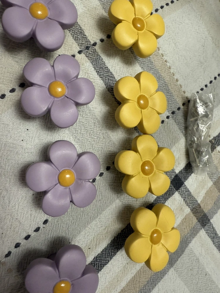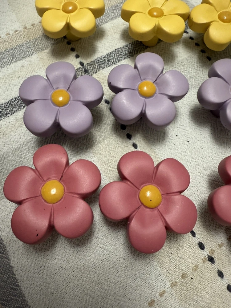 The Flower Drawer Pulls Knobs Handles are a set of contemporary ceramic drawer pulls designed in purple, yellow, and pink colors. They come in a pack of 1 and are suitable for use on bi-fold doors, drawer dressers, and other furniture pieces. These unique and decorative pulls add a touch of style and flair to any room in your home, making them a perfect choice for those looking to enhance their furniture decor with a pop of color.