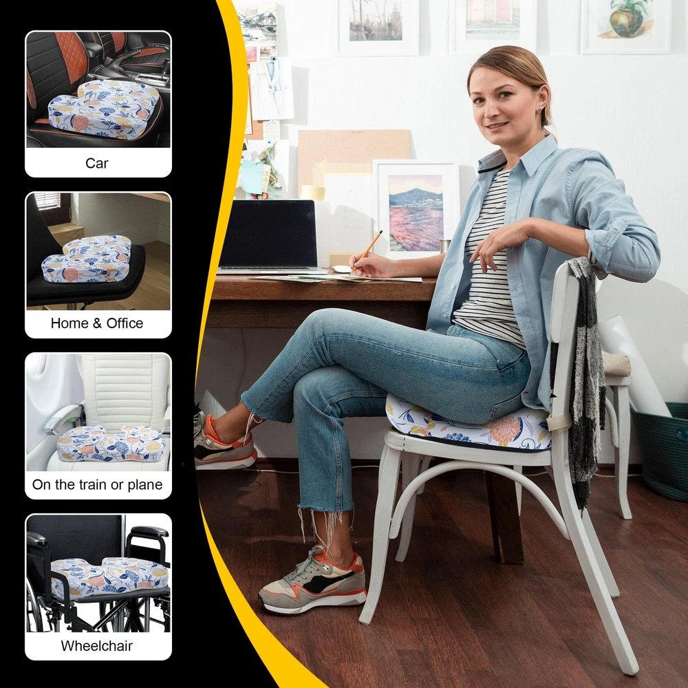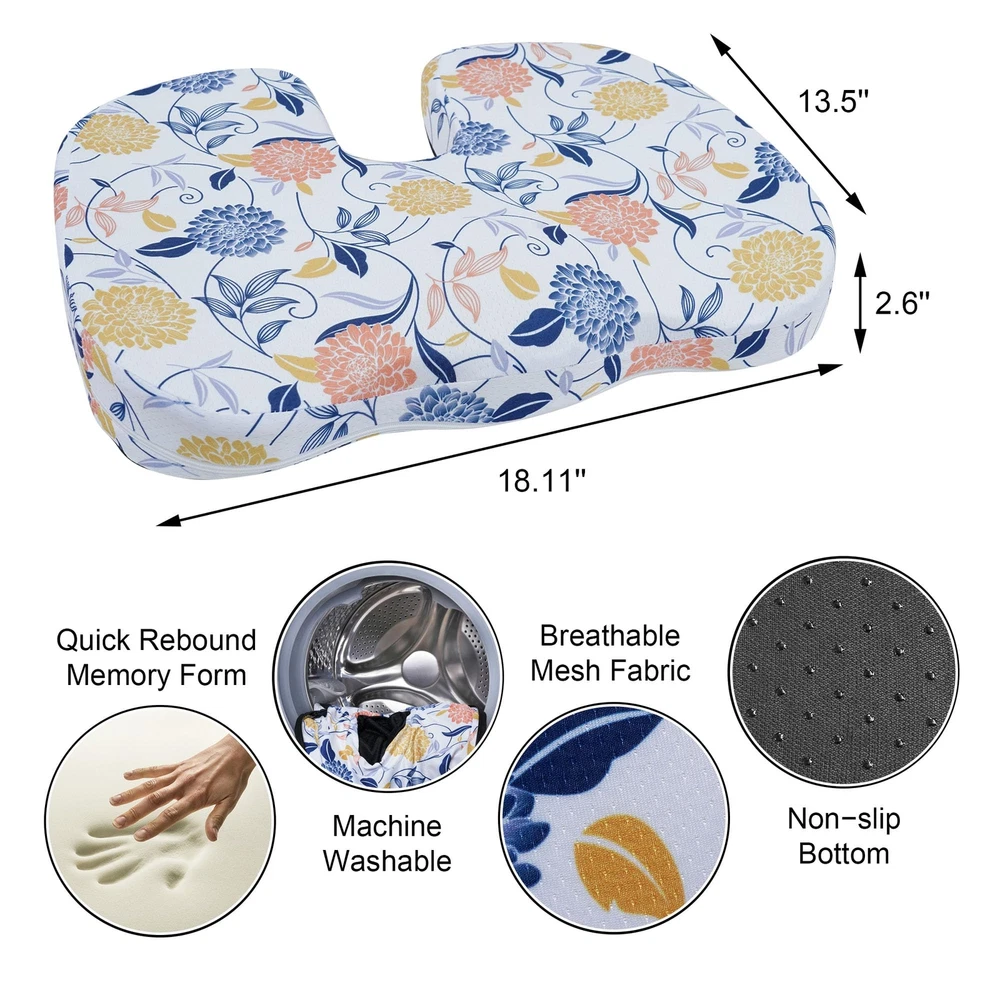 Office Chair Cushion for Back Pain Relief: Long sitting work in the office can cause various kinds of pain. Use our Flower seat cushion for desk chair to relieve back pain,sciatica and tailbone. Our office chair cushion design distributes weight evenly, provides back support for chair, lower back pain relief. Car Seat Cushion for Driving: Use our Flower car seat cushions for driving butt pain to experience ultimate comfort and relieve back pain. This Flower seat cushion for car perfectly fits the curve of the buttocks, back support for chair, help to back pain and pressure relief, effectively alleviating coccyx, sciatica pain caused by long sitting,driving. Seat cushion for desk chair, office chairs, car, trucks, plane, wheelchairs or floor! Comfortable Memory Foam Seat Cushion: Flower office chair cushion shape with ergonomic "U" shaped incisions, use to reduce hip pressure, effectively reduce tailbone pressure, thereby lower back pain relief, relieving the discomfort caused by long sitting. This cushion is highly recommended for office workers, car drivers and more. High Quality Seat Cushion: The Flower office chair cushion is well made, with a size of 18.11x13.5x2.6 inch. The surface is made of comfortable and breathable fabric, and the bottom is designed with non-slip. Memory foam chair cushions, which has sufficient support and elasticity, and can maintain its shape even after multiple uses. Whether used as a home office chair pad or a car seat pad,you don't have to let pain hinder your daily activities. Office Gifts for Coworkers: Flower office chair cushion lighting up your every day and embracing a beautiful mood. If you give a Flower seat cushion as a birthday gift for coworkers, friends, boss, clients, or colleagues, they will all appreciate your careful gift selection and no longer have to worry about various issues such as back pain, sciatica, coccyx pain, and low back pain.