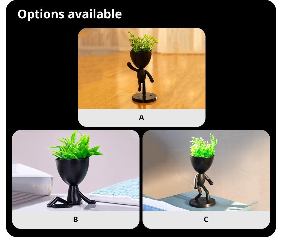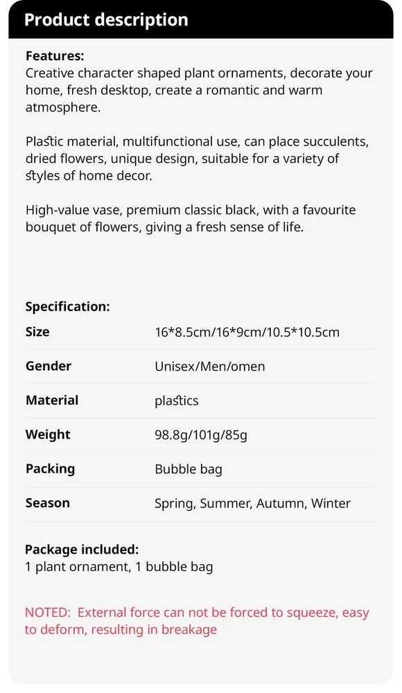 Free and fast shipping , shipping take up 1-7 Business Days 30 Day Return Accepted EASY PAYMENT via PayPal, Credit Card, PayPal Credit, Google Pay... Flower Vase Plastic Figurine Black Solid Modern Small Free Stand Bottle Décor • Unique Pastoral Style :This product features a unique pastoral style, adding a touch of rural charm to any space. Its plant-themed design is perfect for creating a natural and soothing environment. • Creative Office Decor :With its character shape and plant decoration, this piece serves as a creative office decoration, adding a touch of personality and originality to your workspace. • Quality Plastic Material :Made from high-quality plastic, this product is durable and long-lasting. Its solid construction ensures it can withstand the test of time, maintaining its appearance over years. • Versatile Figurine :As a versatile figurine, it can be used in various settings - be it at home, office, or any other space. Its simplistic yet appealing design makes it a great addition to any environment. • Brand Quality :Produced by an unspecified brand, this product guarantees brand quality, ensuring you get a product that meets your expectations and satisfaction. REVIEWS The product came very well packaged. I'm very happy. thank you for everything. Seller strongly recommended. This is great! I definitely recommend! Product looks amazing Delivery was fast. Excellent seller, great communication. I advise everyone to buy it!