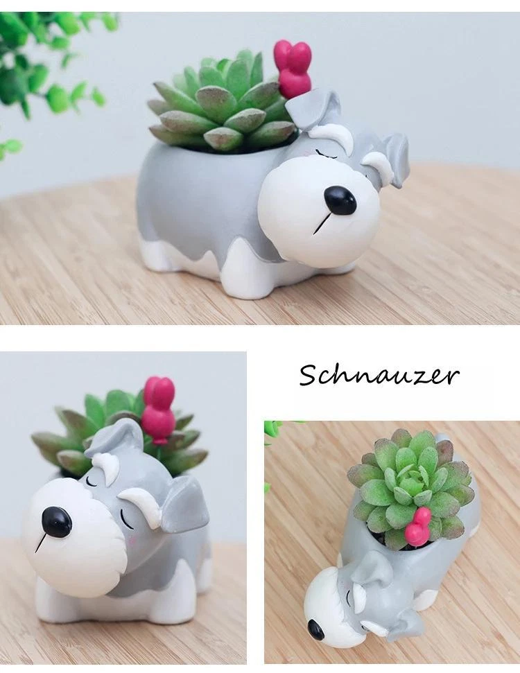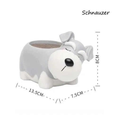 CUTE DESIGN.Cute Dog Schnauzer Shaped Cartoon Animal Succulent pot HIGH QUALITY.Adorable miniature planter is made of resin materials,handmade, Ideal for fashionably displaying plants, for small flowers,small succulent plants SAVE SPACE.Suitable for home office desk decoration,and it can also make your office unique. It also can put paper clips or sugars etc on desk. Size 13.5*7.5*8cm, plant space 4.5*6*4cm TIDY ORNAMENT.With a hole on the bottom of the vase,which makes it better to breath, and with a stopper, which prevent water and oil outflow, keep your desk tidy and clean ATTRACTIVE PRESENT: It is a great gift for your friends who love planting or animals, great choice for present Product information Material: made of resin. Plant is not included. Size 13.5*7.5*8cm, plant space 4.5*6*4cm. Size: please refer to the pictures. Suitable for home decoration,and it can also make your office unique. It is a great gift for your friends who love planting or dogs. There is a drainage hole and stopper on the bottom. Puppy design flower pots, great for mini succulents and cacti or any other small plants. Hand-painted distinctive, funny ornament for whom like gardening. Attractive little planter,makes your desk unique. Package included: 1* flower pot(without any plants) Note: Please check the size before you place an order, thank you!