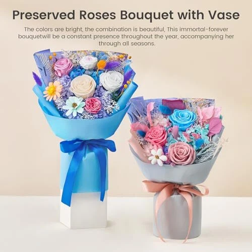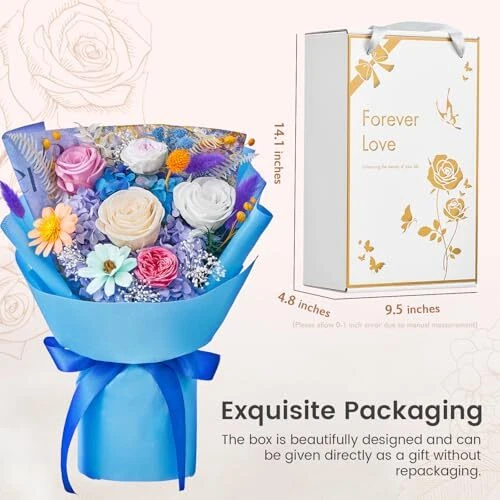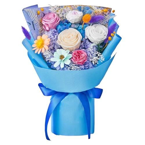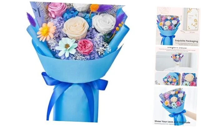 30 Days Return Policy Fast Delivery Trusted seller Flowers Bouquet Flowers Fresh Bouquet Roses Bouquet Gift for Her Wife Valentines Day Mothers Day Graduation Birthday Christmas (Pink Champagne White Roses, Blue Paper) Product Description 100% real flowers: Our forever flowers bouquet are made up of fresh and real flower, which undergo an intricate process to preserve the quality and integrity of the petals which are then dyed with rich and bright colors. Flowers that last over a year: Using a non-toxic, eco-friendly process so that they can last for a year or longer. Allowing you to have fresh flowers without daily watering or maintenance and enjoy their blooming beauty every day. Hand-Made Bouquet: All preserved bouquets are designed and hand-made by our florists. The eternal bouquets are handcrafted from preserved roses, hydrangeas, eucalyptus apple leaves, orange leaves, sola flower etc. A cute bear makes the roses bouquet more adorable and an ideal gift for loved ones. Hand-Made Bouquet: All preserved bouquets are designed and hand-made by our florists. The eternal bouquets are handcrafted from preserved roses, rich beans, bunny tails, leaves riches, melon seeds flower etc. Zero maintenance Care: Our roses bouquets hold beauty and a natural and fresh look, with no maintenance required. No need to water or add sunlight. The pollen is removed, so you don't have to worry about allergies either. Shipping Returns Payment Shipping Shipping is FREE to all addresses other than APO/PO boxes in the lower 48 states. All our stock ships from US-based warehouses. Shipped via USPS or UPS (depending on location and package weight) Unless stated otherwise, all orders will ship within 24-72 hours of your payment being processed. Check our feedback to see the great reviews of FAST shipping we offer. Returns As our valued customer, we will do our best to make sure the product you receive arrives to you on time and as expected. If you are not satisfied with your purchase, please contact us within 30 days of receiving your order to process a return. Payment We currently accept payment via eBay managed payments only. Once payment is cleared, we will dispatch your shipment within 1-3 business days. Please refer to the "Shipping" tab for more information regarding shipping speed to your destination.