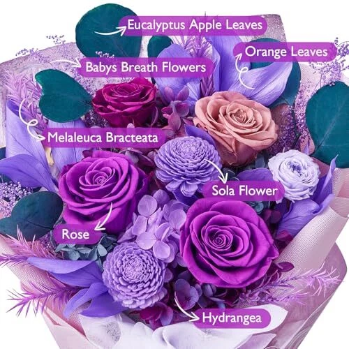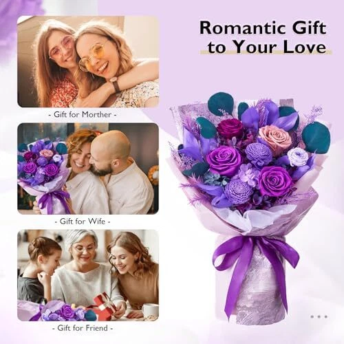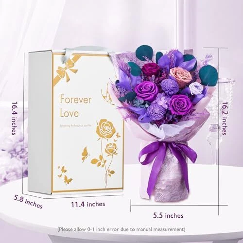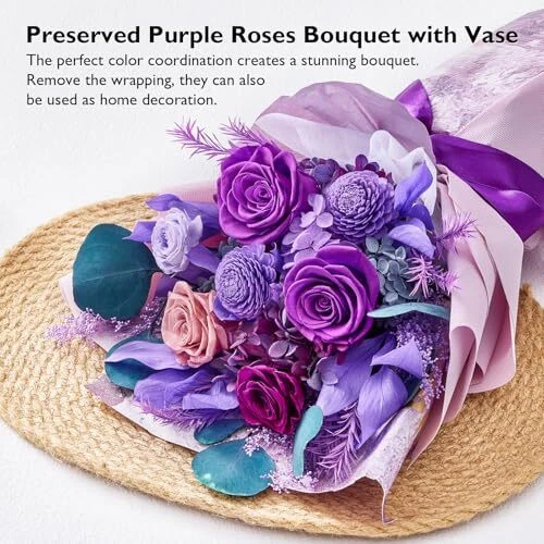 Return Policy Fast Delivery Trusted seller Flowers for Delivery Prime, Preserved Flowers Bouquet for Valentine's Day, Purple Roses and Flowers Bouquet Gifts for Her Women Wife Mom Grandma Birthday Mother's Day Anniversary Product Description Big Size, Big Charm: Our flowers bouquets, with their large size (16.2"*5.5") and charm, make every gift-giving moment unforgettable.The preserved flowers are cut fresh and treated with unique preservation technology, keeping them fresh appearance and tactile impression at least 1 year. Handmade Roses Bouquets & Long Lasting: This roses bouquets are beautifully handcrafted from 4 purple and 1 dusty pink roses decorated with different colors hydrangeas, artemisia japonica, melaleuca bracteata, orange leaves. Unlike fresh flowers, preserved flowers do not wilt or fade over time. Gifts for Her or Home Decorations: Suitable as gift for Valentine's Day, Mother's Day Anniversary, Birthday or more. They are also suitable for home, bedroom, dining table decoration. Our preserved bouquets will surely brighten anyone's day! Exquisite Packaging: Our gift box is meticulously designed and can be presented directly as a gift without the need for additional packaging. After removing the bouquet, it can be used as a floral arrangement at home, adding beauty to the space. Zero maintenance Care: Our roses bouquet hold beauty and a natural and fresh look, with no maintenance required. Please keep flower bouquet away from humid and high temperature environments, avoid direct sunlight. Shipping Returns Payment Shipping Shipping is FREE to all addresses other than APO/PO boxes in the lower 48 states. All our stock ships from US-based warehouses. Shipped via USPS or UPS (depending on location and package weight) Unless stated otherwise, all orders will ship within 24-72 hours of your payment being processed. Check our feedback to see the great reviews of FAST shipping we offer. Returns Seller does not accept returns Payment We currently accept payment via eBay managed payments only. Once payment is cleared, we will dispatch your shipment within 1-3 business days. Please refer to the "Shipping" tab for more information regarding shipping speed to your destination.