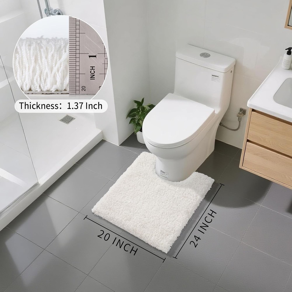 Microfiber [ MULTIPLE MACHINE WASHES WITHOUT CLUMPING OR TANGLING ] Our fluffy U-shaped toilet rugs(24x20 inch) are woven from off white microfiber yarns and will appear slightly different colors in different light and equipment. Unlike other bath mats on the market prone to clumping and tangling, our plush bath rug is crafted from sturdy, reliable materials that ensure long-lasting use. Cleaning is a breeze—whether hand-washing or using a machine, this bath mat emerges looking brand new [ CLOUD-LOFT COMFORT UNDERFOOT ] Our toilet rug measures 20"L×24"W with a 9.7" U-cut opening. For optimal fit, please match your toilet base dimensions with our reference Image #4 before purchase. The 1.37-inch plush pile cradles feet in ultra-dense microfiber luxury—thicker and plusher than standard mats—delivering lasting pillow-soft comfort. High-resilience fibers maintain their fresh appearance and plush feel through repeated use. Indulge in therapeutic softness during your private moments [ ULTRA-ABSORBENT and QUICK-DRYING ] Our plush U-shaped toilet rugs for the bathroom showcase a dense pile of absorbent fibers that effortlessly soak up water. Step onto the mat with confidence right after your shower, preventing any water from being tracked onto your bathroom floor. The high-density material excels not only in moisture absorption but also in providing a cushioned haven for your feet, ensuring warmth and coziness even on the coldest tiles [ PATENTED NON-SLIP TPR BOTTOM FOR ENHANCED SAFETY ] Our U-shaped toilet rug featuring a patented hexagon suction cup-inspired bottom design that firmly anchors the mat in place. This ingenious structure effectively prevents water from seeping through, adding an extra layer of security for both you and your loved ones. Engage in your bathroom activities with peace of mind, knowing you are safeguarded against slips and falls [ VERSATILE USAGE SCENARIOS ] Our luxury shaggy microfiber U-shaped toilet rugs effortlessly harmonize with various bathroom settings. With an array of colors and sizes to choose from, you can find the perfect fit for your decor. Enhance your shower, bathtub, master bathroom, kids' bathroom, or vanity area with these rugs. Their warm and cozy surface invites relaxation, transforming your bathroom into an oasis of comfort and style