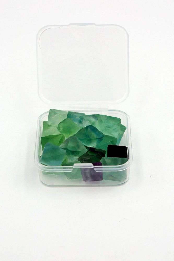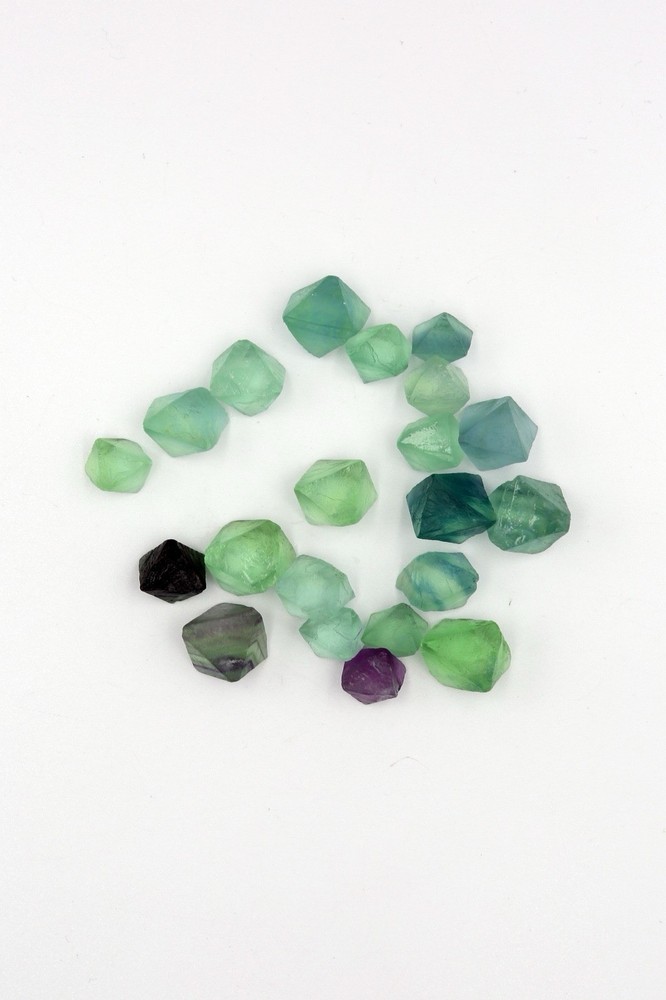 Approximately 22 pieces of Fluorite octahedron in each box MSRP $10.00 wholesale this collection of fluorite octahedrons shimmers with soft, translucent hues of green, teal, lavender, and deep violet, each crystal capturing the delicate artistry of the Earth’s formation. Their eight-faced symmetry gives them a perfectly balanced, otherworldly quality, as if each piece holds a fragment of frozen light. Scattered across the white background like scattered thoughts of a dream, these crystals are not only a testament to mineralogical beauty but also evoke a sense of harmony, transformation, and calm — a quiet constellation shaped in stone.