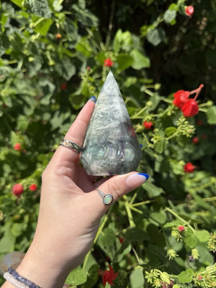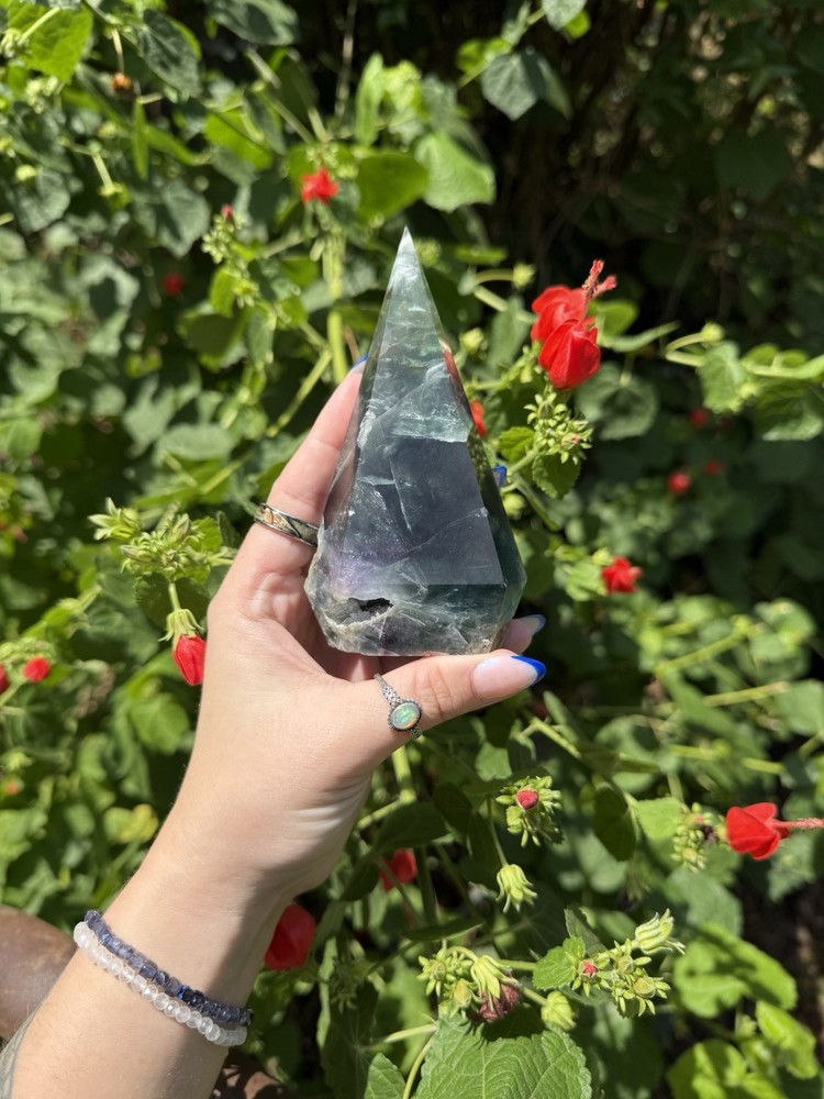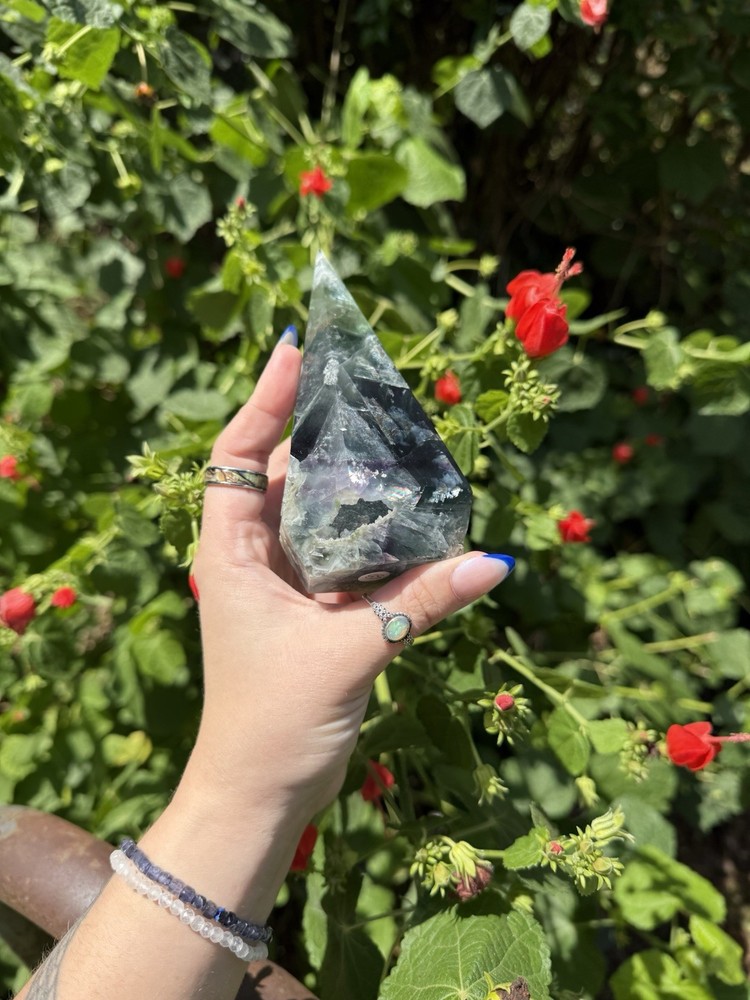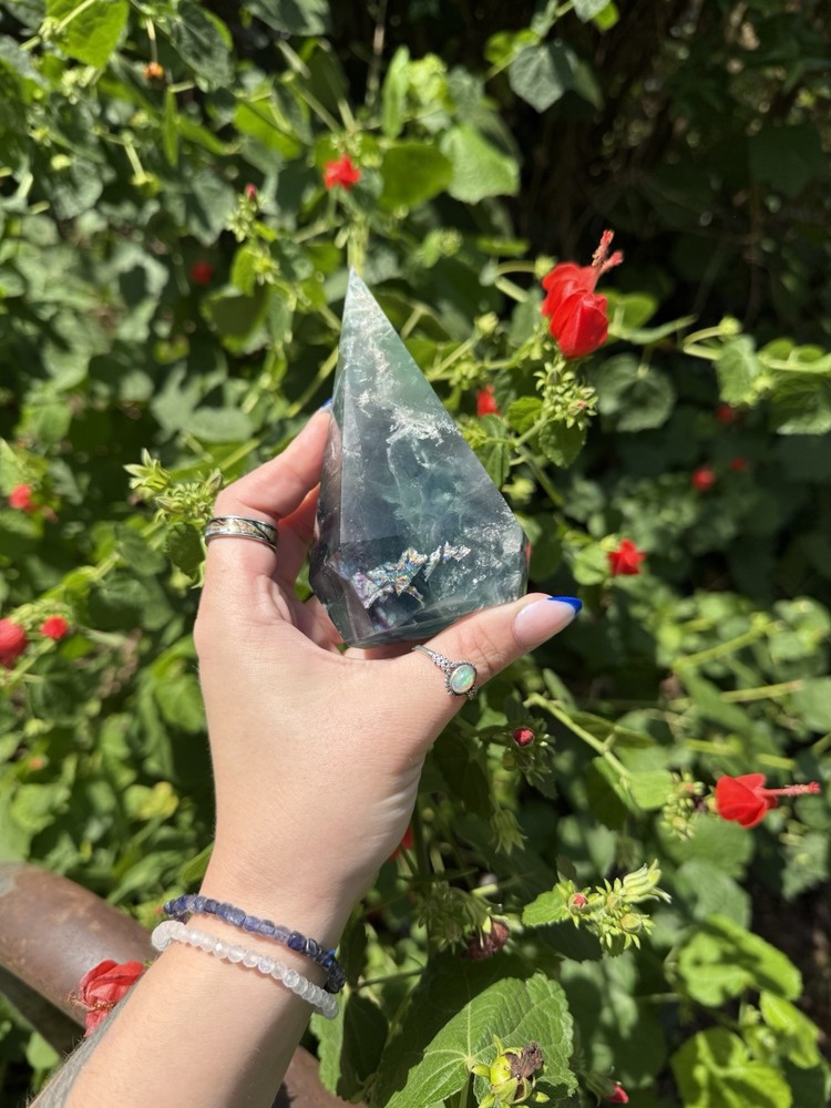 Listing is for one (1) Fluorite Diamond carving. Most have rainbows and natural “druzy” pockets. They weigh between 0.63-0.88lbs. All are intuitively chosen. Renowned for its kaleidoscope of hues, fluorite is a visual feast for the senses. From serene blues and purples to vibrant greens and yellows, each piece of fluorite is a unique work of art, captivating the eye and captivating the soul. As a stone of mental clarity and organization, fluorite serves as a powerful ally in your journey towards productivity and focus. Its gentle yet potent energy clears away mental fog, allowing you to approach tasks with precision and efficiency. With fluorite by your side, you'll experience enhanced concentration, improved decision-making, and a sense of order in the midst of chaos. Fluorite is not only a champion of mental prowess but also a guardian of emotional well-being. Its soothing vibrations gently dissolve negative energies and emotional blockages, creating space for tranquility and inner peace to flourish. By fostering emotional balance and resilience, fluorite helps you navigate life's challenges with grace and self-assurance. Known as the "Genius Stone," fluorite stimulates intellectual growth and promotes the assimilation of information. Whether you're a student, researcher, or simply seeking to expand your knowledge, fluorite amplifies your ability to absorb and retain information. It enhances logical thinking, sharpens your memory, and encourages innovative problem-solving, making it an indispensable tool for learning and personal growth. Beyond its mental and emotional benefits, fluorite is also a potent energy cleanser. Its purifying properties release stagnant energy, rejuvenating your aura and restoring balance to your energetic system. As it clears away negativity, fluorite creates space for positive energy to flow, revitalizing your spirit and enhancing your overall well-being. Immerse yourself in the transformative energy of fluorite and unlock the door to clarity, focus, and inner harmony. Embrace the captivating colors and embrace the wisdom it imparts, as you navigate life's journey with newfound confidence and grace. Discover the mesmerizing allure of fluorite and experience the profound impact it can have on your life, bringing clarity, inspiration, and a renewed zest for living.