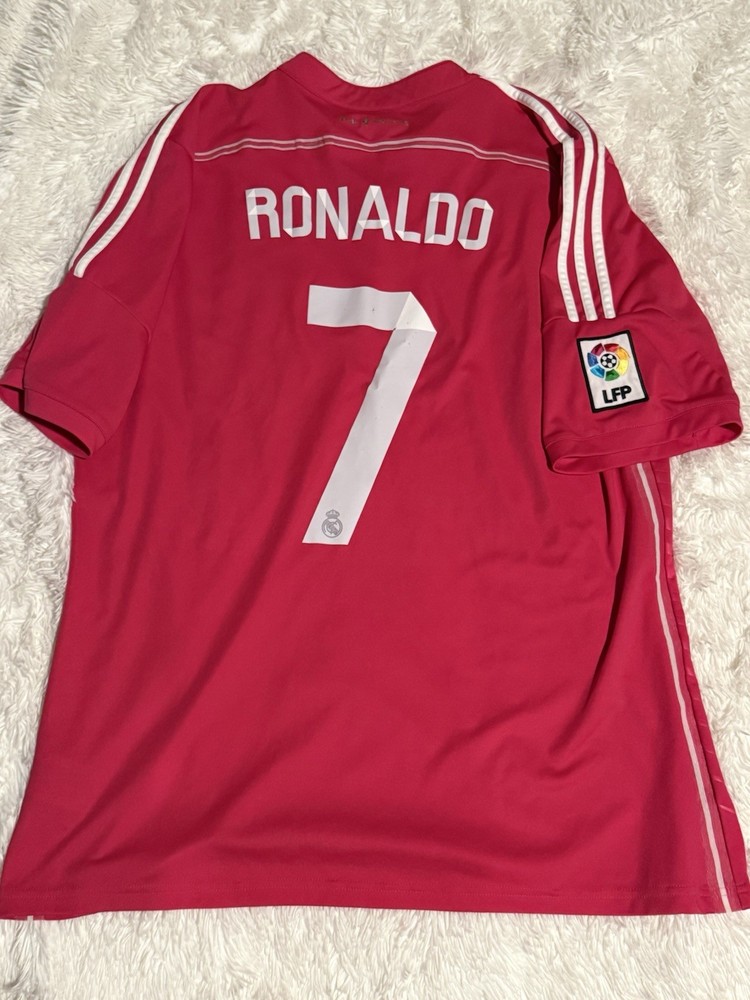 Officially Licensed: Yes Product: Jersey Country of Origin: Jersey Team: Real Madrid Gender: Men Size: XL Player: Cristiano Ronaldo Color: Pink Sport: Soccer Materials sourced from: Jersey Brand: adidas