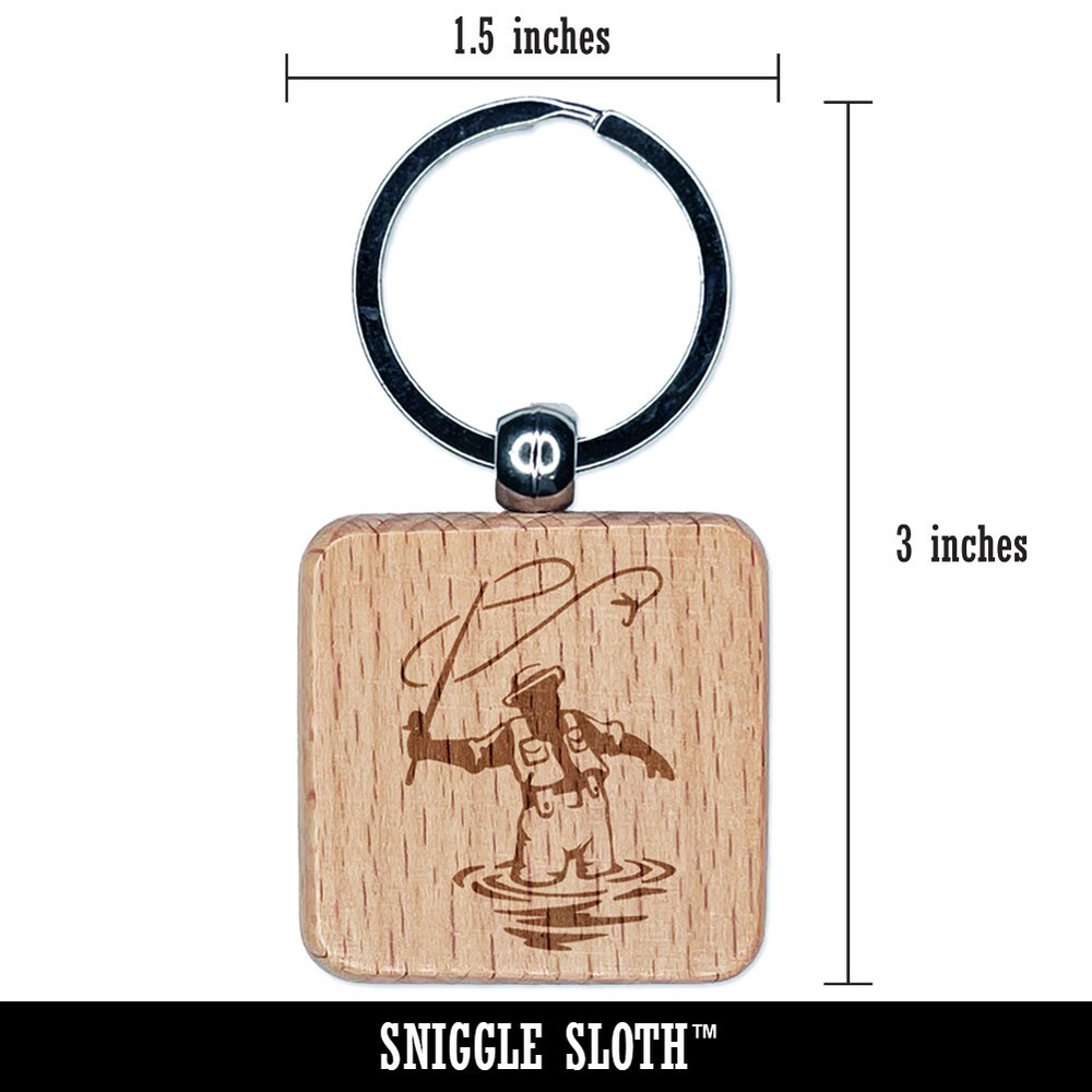 Fisherman Holding Fish Catch Engraved Wood Square Keychain Tag Charm