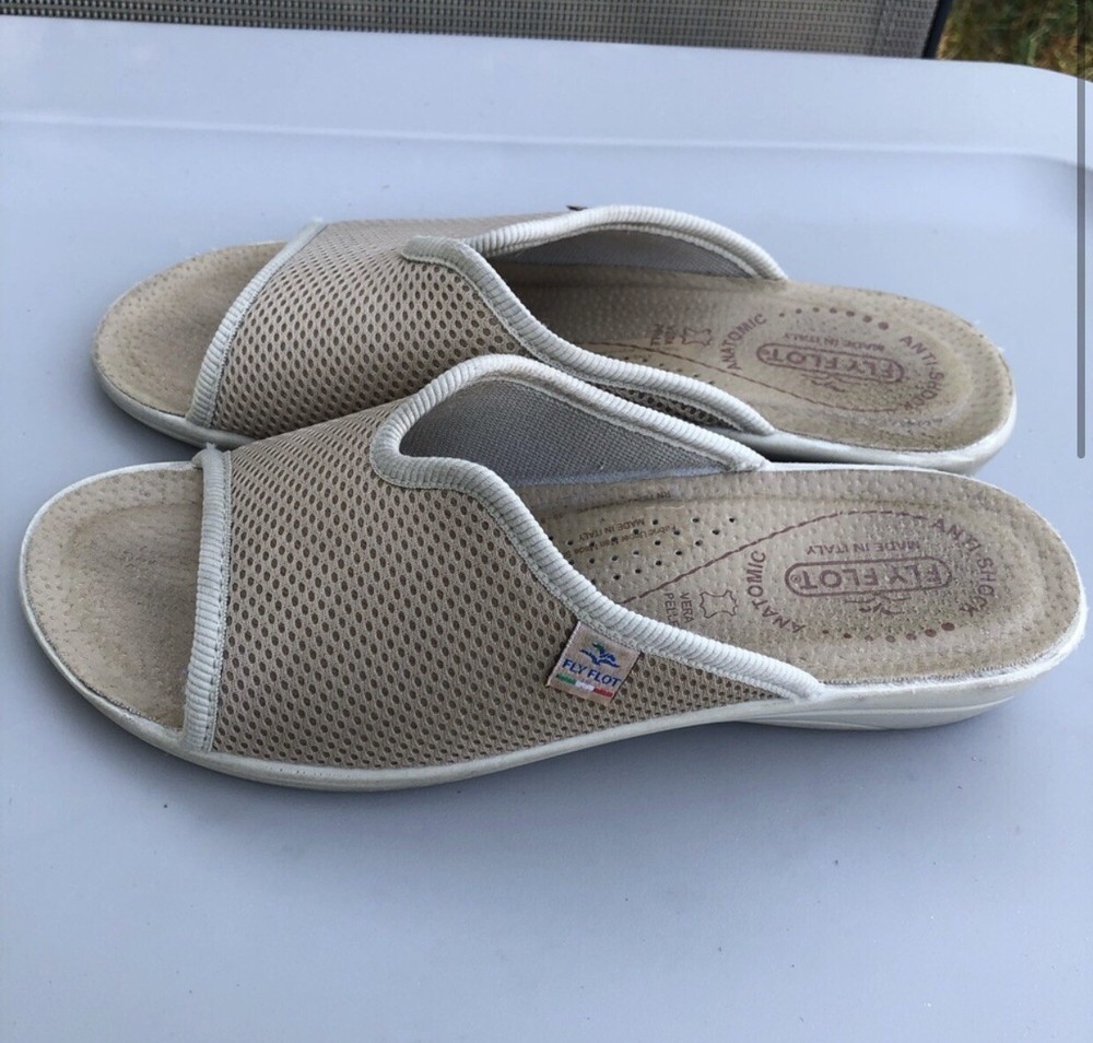 Fly Flot Anti-Shock Anatomic Slip On Shoes Tan Mesh Clogs Sz 8-8.5/39. Shows some discoloration on white part.