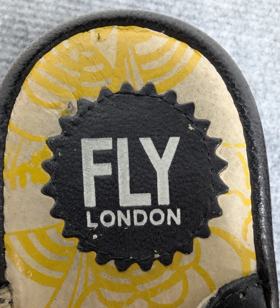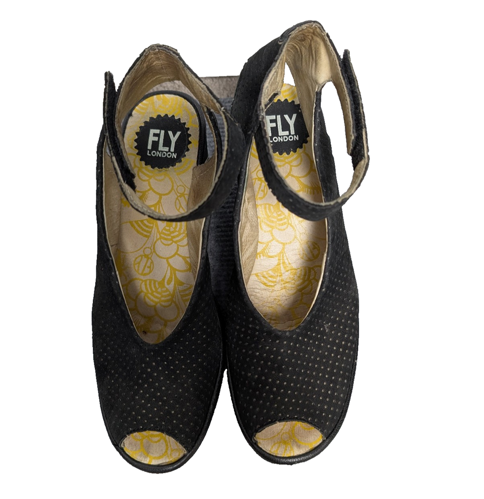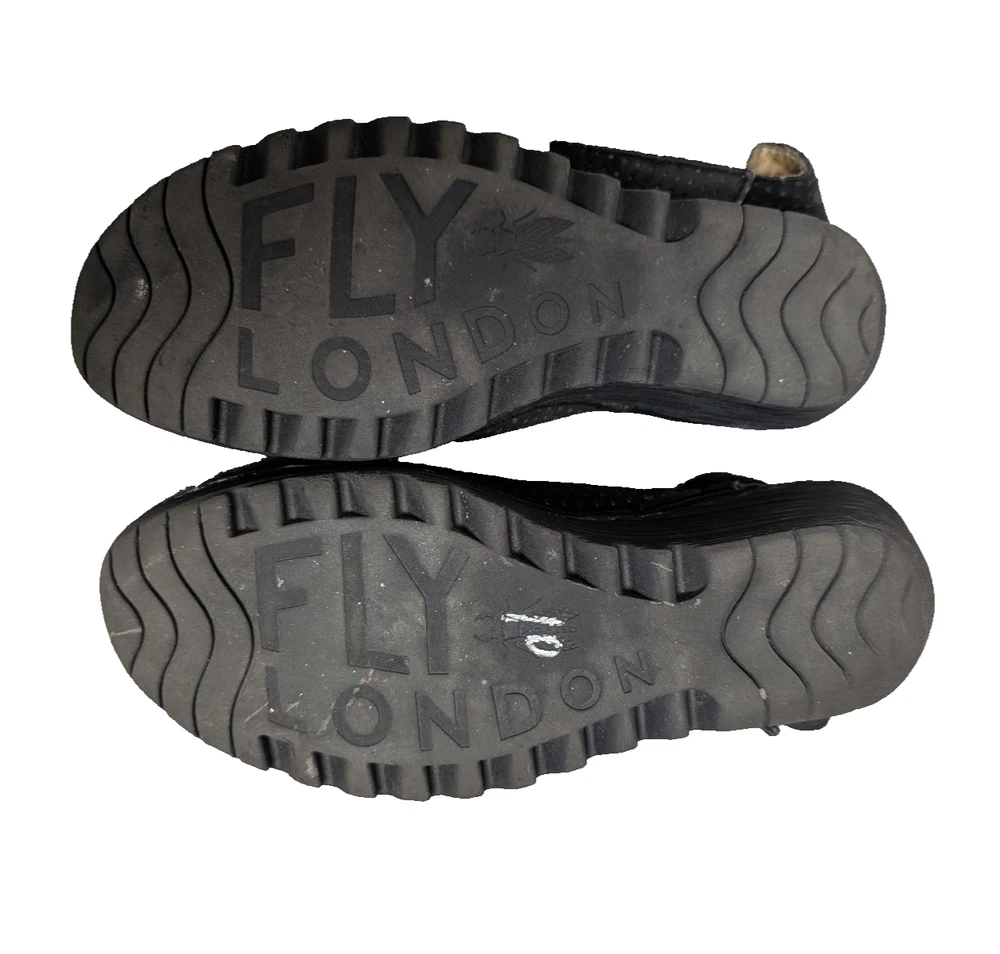 Brand: Fly London Department: Women Type: Sandals Style: Wedge Color: Black Upper Material: Leather Closure: Hook & Loop Toe Shape: Open Toe US Shoe Size: 9-9.5 EU Shoe Size: 40 Occasion: Casual, Travel, Everyday Features: Wedge Heel, Comfort, Lightweight Pattern: Solid Country/Region of Manufacture: China Good used condition with visible wear and creasing from normal use (see photos).