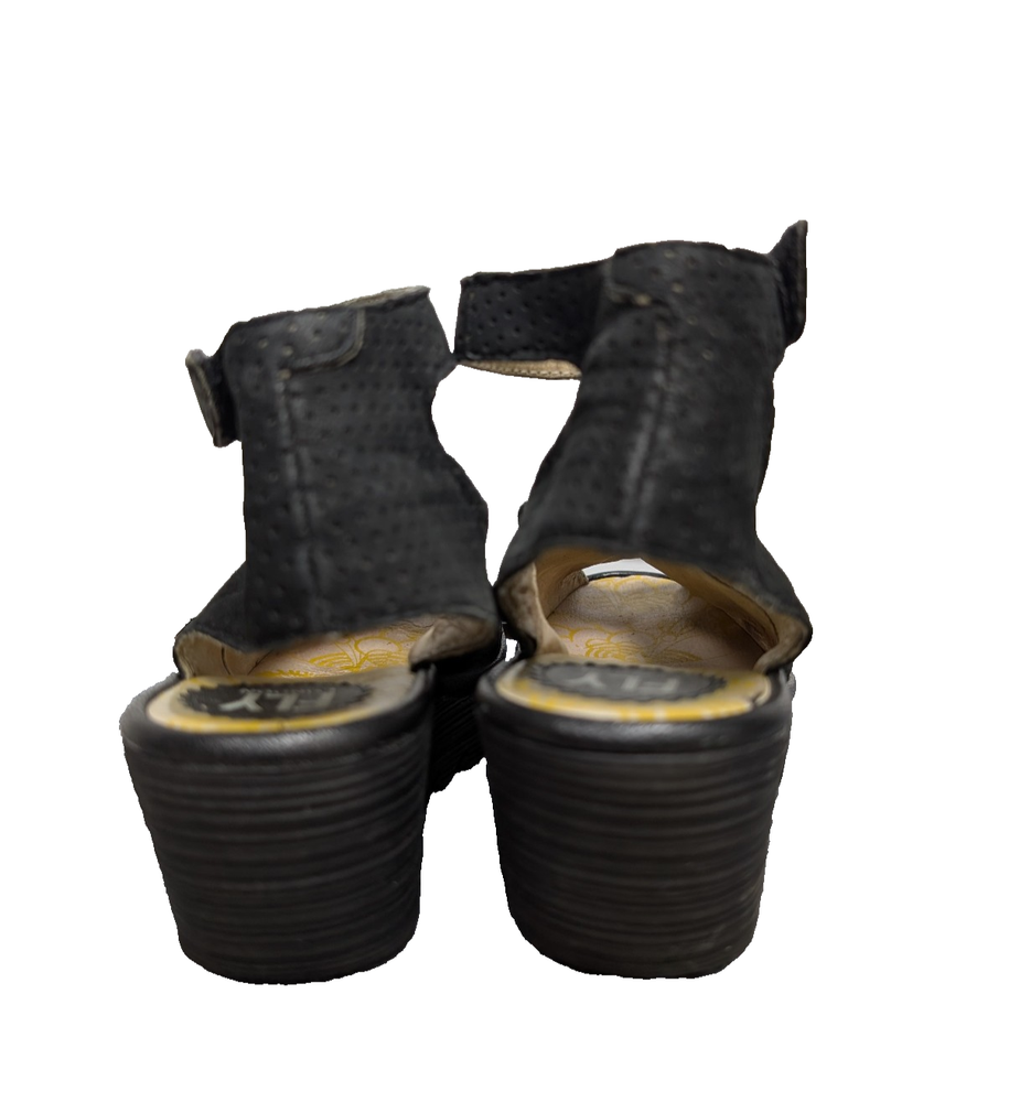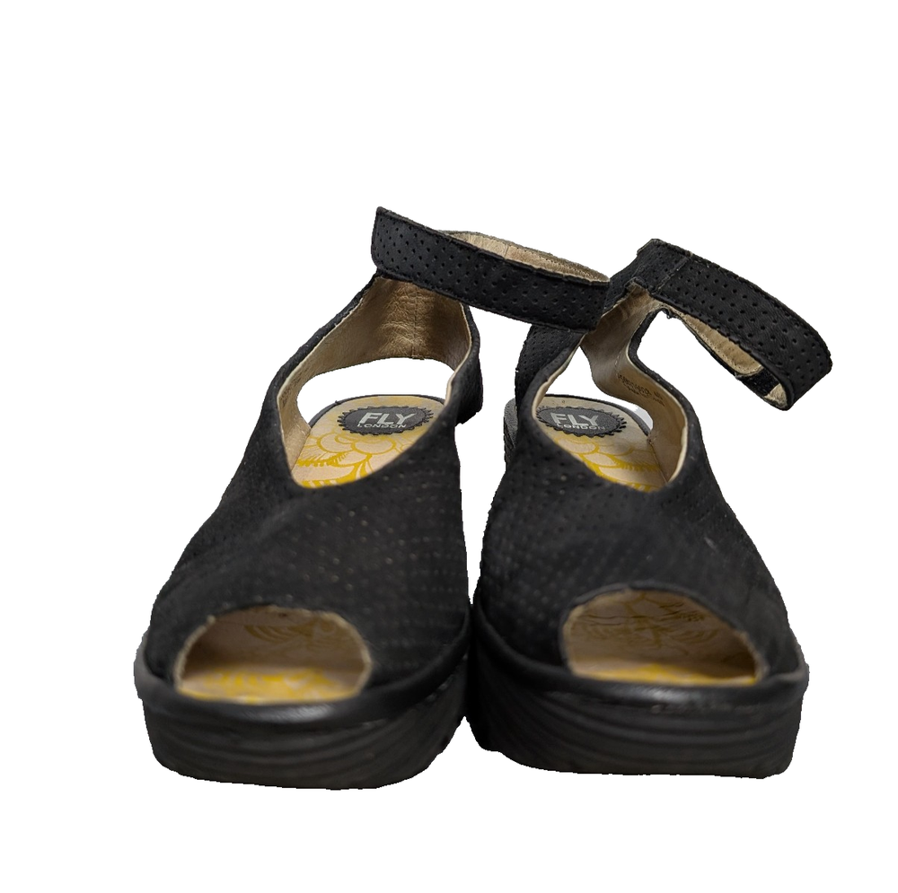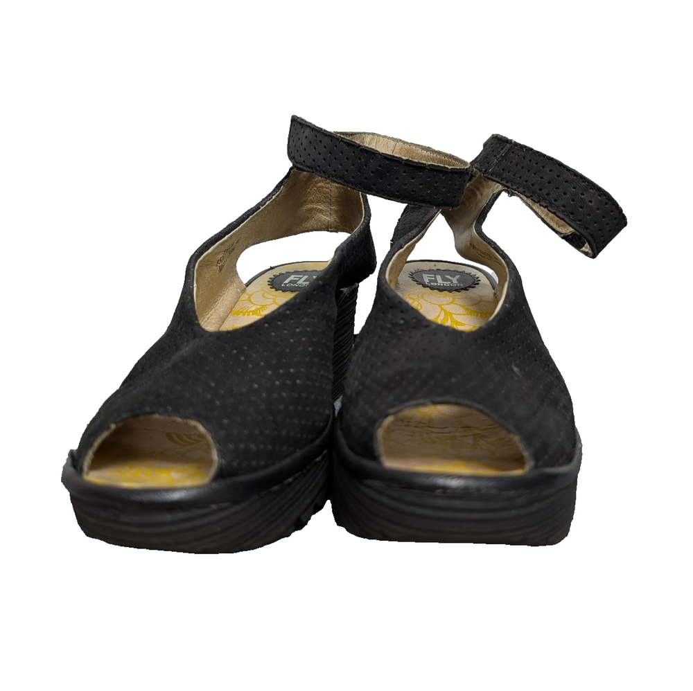 Fly London Yala Wedges Womens EU40 US9 Perforated Sandals Black Leather Boho