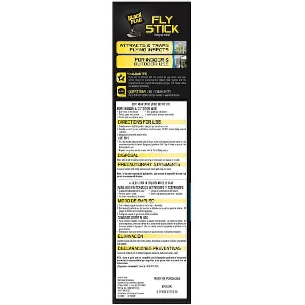 Fly Stick Insect Trap - Attracts and traps Insects, for indoor & outdoor use Insects invading your corner of the world? Whatever insect you're fighting, Black Flag products are dedicated to providing the tools you need to regain control. With formulas that act fast and never back down, Black Flag insect controls have been arming homeowners in the battle against invading bugs for more years than any other brand.Flies and other flying insects can be a real aggravation when they raid your picnic, porch or patio. Black Flag Fly Stick attracts and traps houseflies and other flying pests indoors or outdoors anywhere flying insects are a nuisance. Simply add honey or syrup to attract them to the stick - once they land, they never leave. Hang in any room of the house; near your porch, patio or garden; around recreational areas; near garbage containers; and inside barns, kennels and stables. Replace every 3 months or when the stick is full. Just remove, wrap in newspaper and dispose of in trash. For best results, hang vertically with all sides of the stick exposed, near the center of the area where you wish to control flying insect problems. Add 1 tsp of honey or syrup to the bottom plastic cup . Features : Traps flying insects: once they land, they never leave ATTRACTS FLYING INSECTS: Just add honey or syrup. USE INDOORS AND OUTDOORS: Use anywhere flying insects are a nuisance. HOOK INCLUDED FOR HANGING: For best results, hang vertically with all sides of the stick exposed. GUARANTEED: Guaranteed to work or your money back This product is applicable for the following pest types: Cluster Flies, Flies, Houseflies