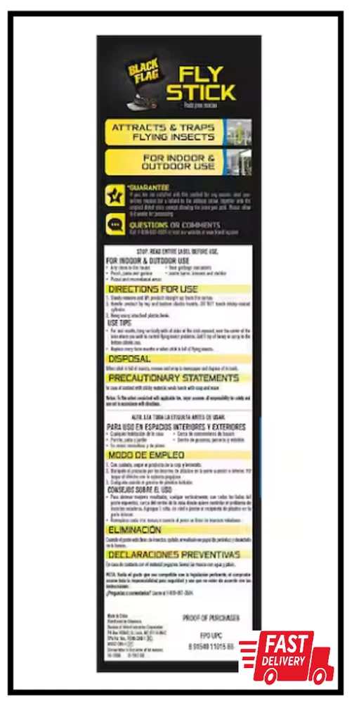 Fly Stick Insect Trap Indoor Outdoor (4-Pack) • Traps flying insects: once they land, they never leave • Attracts flying insects: just add honey or syrup • Use indoors and outdoors: use anywhere flying insects are a nuisance • Hook included for hanging: for best results, hang vertically with all sides of the stick exposed • Guaranteed: guaranteed to work or your money back • Product is applicable for the following pest types: cluster flies , houseflies • Return Policy