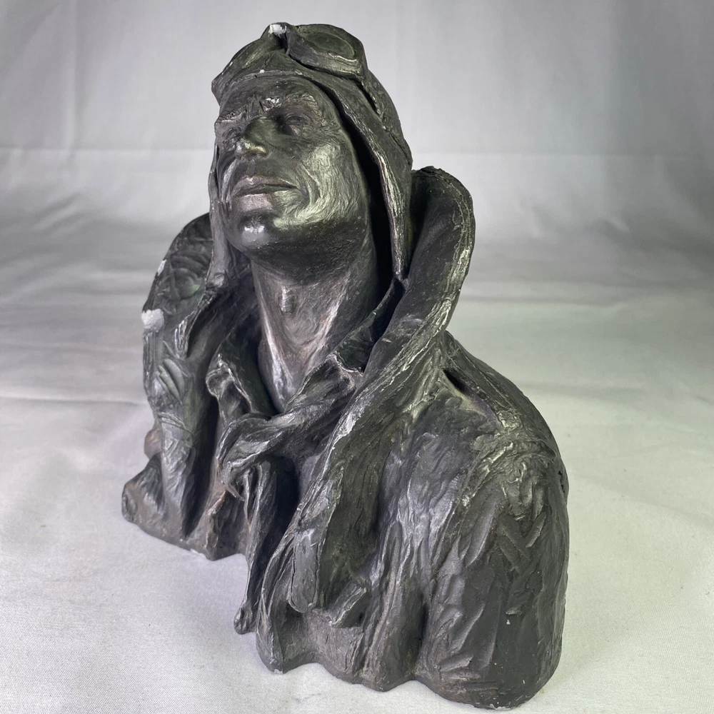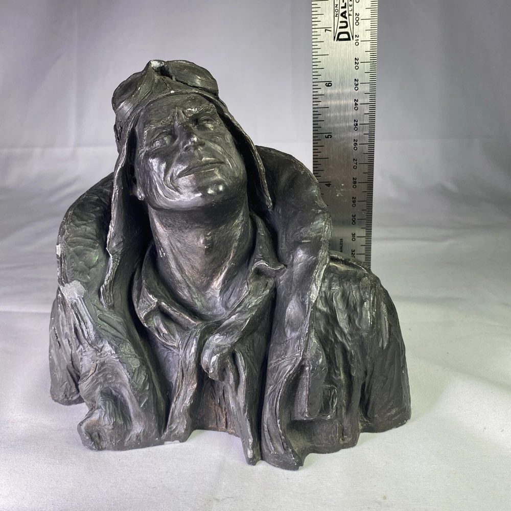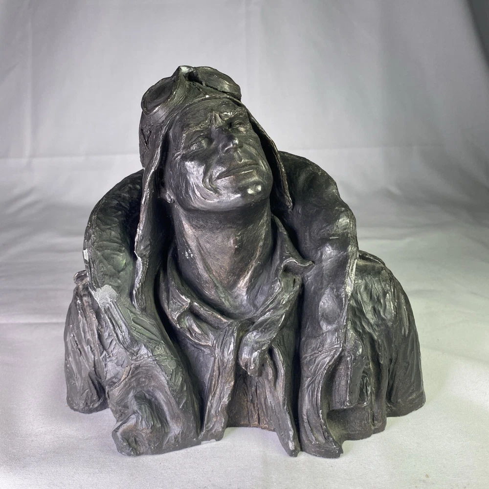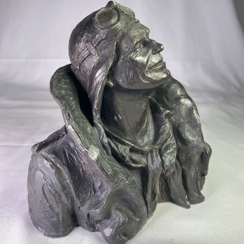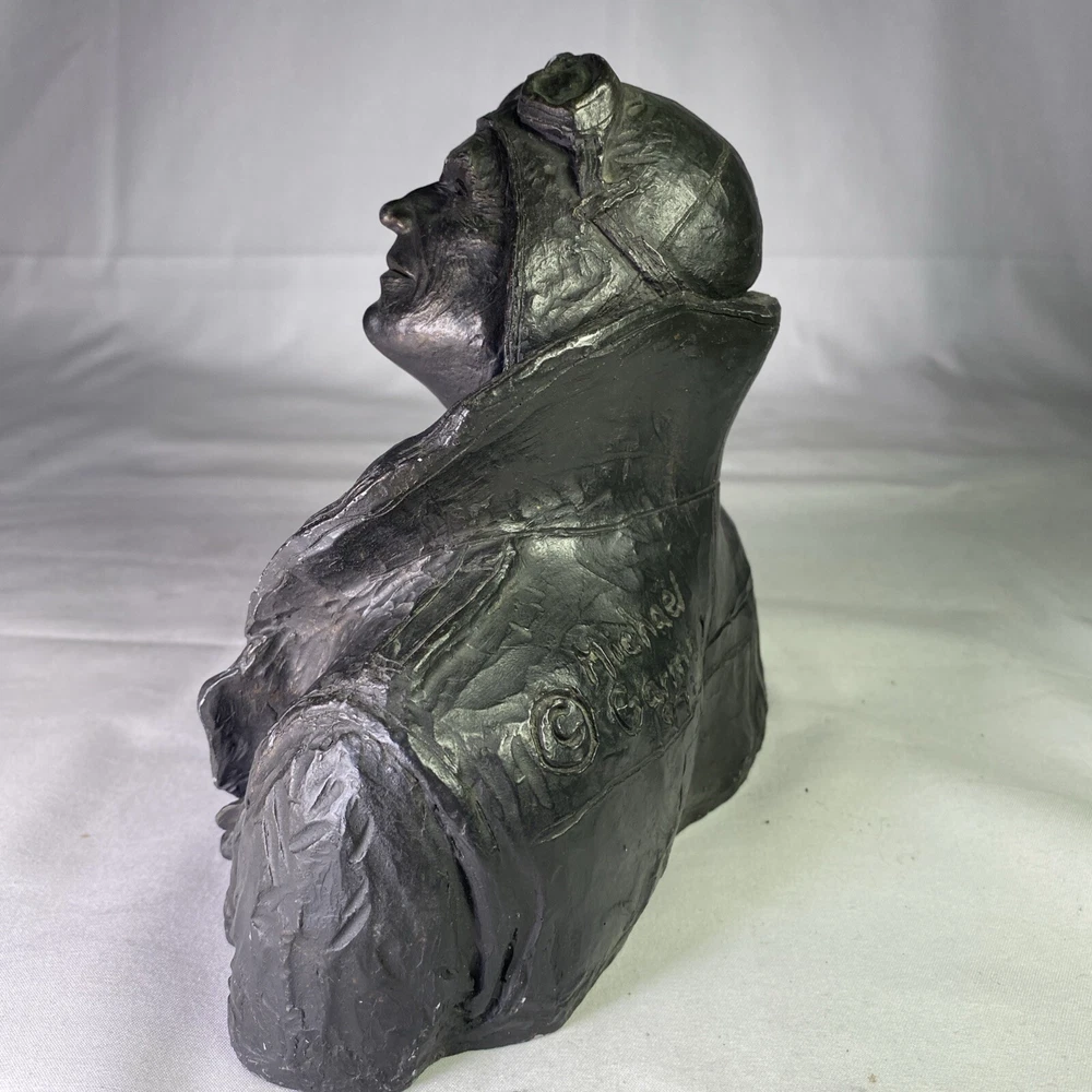 Material:ResinItem Height:6 inArtist:Michael GarmanTitle:Flying LeatherUPC:Does not applyOriginal/Licensed Reproduction:OriginalCountry/Region of Manufacture:United StatesSubject:FiguresPeriod:Contemporary (1970 - 2020)Culture:MilitarySigned:YesItem Width:8”Time Period Produced:1970-1979Style:Pop Art, Realism, SteampunkFormat:Bustgtin13:Does not applyType:SculptureSize:MediumTheme:AviationYear of Production:1973