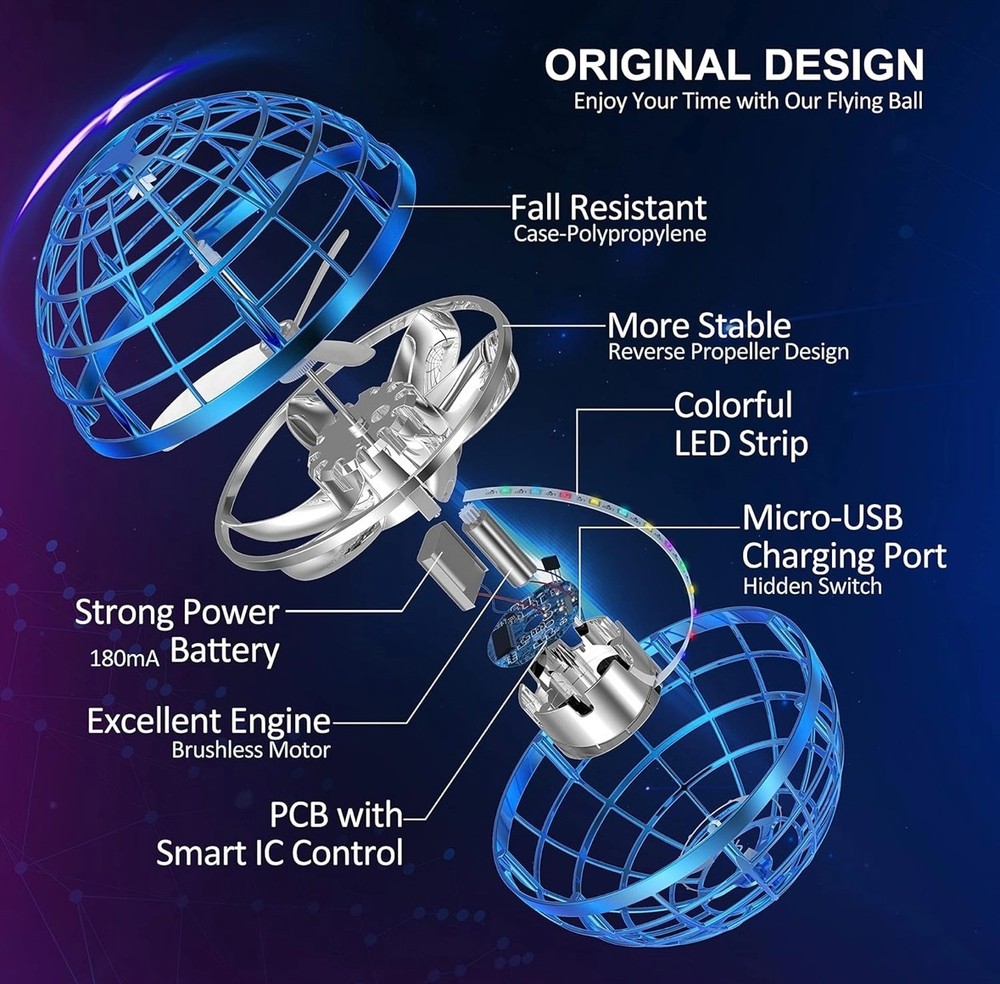 The Flying Orb Ball Toy Spinner Drone Hover Ball is a fun and entertaining toy suitable for kids and adults alike. With its mesmerizing LED lights and durable plastic material, this toy promises hours of entertainment. The blue color and recommended age range of 6 years old and up make it ideal for young users who enjoy interactive play. This modern toy, manufactured in China, is sure to provide endless excitement for users of all ages.