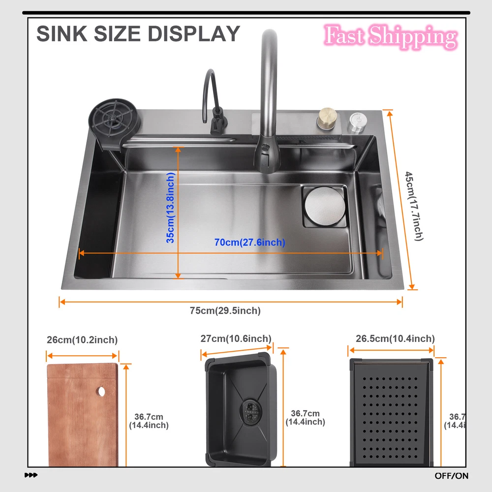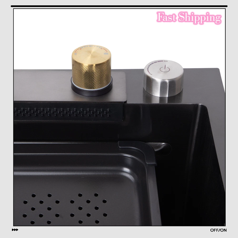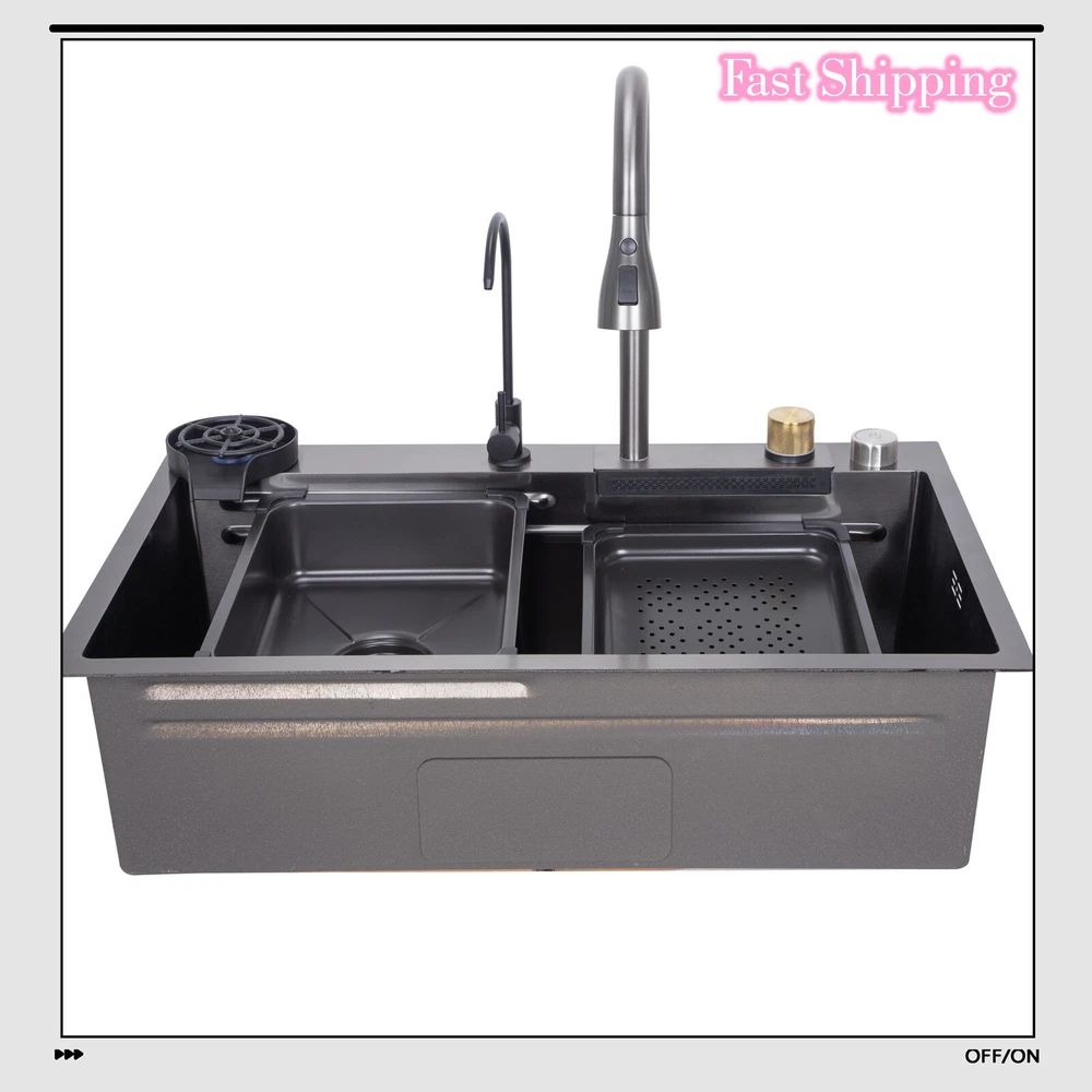 Material: Steel Inner Bowl Front-to-Back Length: 27.56 in Bowl Height: 8.27 in Inner Bowl Side-to-Side Width: 14.17 in EAN: Does not apply Assembly Required: Yes MPN: Does not apply UPC: Does not apply Type: Waterfall Personalize: No Brand: Unbranded Style: Modern Mounting: Drop in Color: Black Bowl Shape: Rectangular Features: drain grooves design Item Height: 8.27 in Bowl Depth: 8.27 in gtin13: Does not apply Shape: Rectangle Item Width: 17.71 in Number of Faucet Holes: 4 Item Length: 29.5 in Room: Kitchen