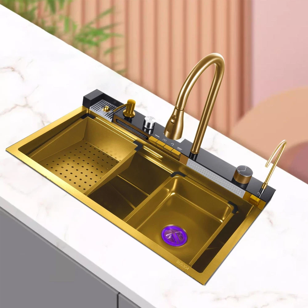 Store category Sign Up Now ! You may also like Product Description Bullet Points: Easy Integration: Recessed design of our top mount sink makes it simple to insert directly into the pre-cut hole on the countertop, delivering a mid-counter basin installation design that blends seamlessly with the surroundings for a polished look Innovative Design: Make dishwashing and vegetable preparation effortless with this top-mount kitchen sink's multi-function faucet. With a 360 pull-out faucet, three water spray modes, and an innovative waterfall design, this sink is ideal for any kitchen Excellent Durability: This kitchen sink top mount is built to last with its high-quality 304 stainless steel composition. Its nano-coating surfaces features long-lasting rust-proof performance while maintaining a bright appearance Modernized Maintenance: Utilizing a powerful high-pressure waterflow, our top mount kitchen sink is easy maintenance. An efficient cup washer simplifies cup cleaning, while a one-touch control drain button allows for effortless drainage Flexible Use: Designed for versatility, this top-mount kitchen sink is ideal for bar counters, kitchens, laundry rooms, outdoors, and public areas, including basic accessories for all settings This kitchen sink drop in is easy to install directly into pre-cut countertop holes and features easy dish and veggie washing. With rust-proof construction and easy maintenance, it's perfect for a variety of settings. Specifications: Product name: kitchen sink top mount Product color: Gold Product size: Sink size: 750x450x220mm/29.5x17.7x8.66in Inner diameter: 700x350x220mm/27.5x13.7x8.66in Outer diameter of drain hole: 110mm/4.33in Inner diameter of drain: 90mm/3.54in Drain pipe diameter: 45mm/1.77in Sink material: 304 SUS stainless steel Sink thickness: panel 3mm/0.11in Pipe: 0.8mm/0.03in Packing list: Basin x1 Drainer x1 Drain pipe x1 Bin in basin x1 Chopping board x1 Stainless steel whale faucet x1 Angle valve x2 Hot and cold hose x2 Table control drain x1 Triangular drain basket x1 Notes: 1. Due to different lighting and screen settings, the item color may be slightly different from the picture. 2. Due to different manual measurements, please allow a 1-2cm difference in size. Payment Delivery details Terms of sales About us Feedback & DSRs Payment Before you palce an order, please kindly make sure that you have a paypal account. We accept PAYPAL payment only. Payment should be completed within 2 days after auction closed, or unpaid dispute will be filed for an closing auction. An unpaid case will be filled after 4 days. Delivery details We ship to your eBay address. Each package will be shipped to US by UPS Regular Parcel with tracking number. Please check your shipping address carefully before checkout, it can't be changed if order completed. All items will be shipped within 1-2 business day upon receipt of payment.Orders placed on weekend will be shipped within 3 days. If you do not receive your item in 7-10 business days.please contact us immediately for further assistance. We will be responsible for any damages or losses incurred in the shipping process. About us We maintain high standards of excellence FIVE STAR and strive for 100% customer satisfaction! Positive Feedback is very important to us. We hope that you contact us immediately Before you give us neutral or negative feedback, so that we can satisfactorily address your concerns. We promise to offer the lowest price and high quality produce. Our working time: From Monday to Friday(9:30 am to 18:00pm), we don't working on holidays ,hope you can understand and know that , thank you. Please always talk to us via ebay Message. We appreciate your business and look forward to growing our e-Bay sales with satisfied customers. Feedback Contact us If you have any questions, please feel free to contact with us by ebay Message during our business hours ( 9:30a.m. to 5:30 p.m.), or email us through eBay, we will try our best to help you to resolve it. For any presale or after-sale questions,please do feel free to email us! Due to the time difference, each email will be replied within 1 working day,and weekend will be delayed a bit. Feedback