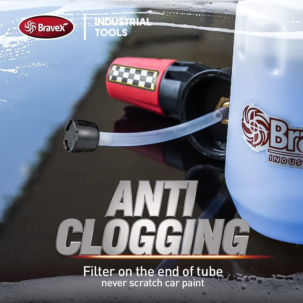 About this item 【Heavy Duty Brass Core & 1.1mm Metal Orifice】- The foam cannon is made with all thick brass core and wall engineering plastic can to be leak-free and durable under high pressure, can produce plenty thick snow and remove the thickest dirt and mud easily. (Notice: 5 nozzles included in the kit) 【Built to Last】- ①Extra Wide Bottle: Designed to spread the pressure out, efficiently avoid neck cracks that is frequently happened to the other models after a period time use. ② Filters on the end of tube set to filter particles in the soap or water, avoid any blocks or scratches to the car 【Excellent Foaming Performance】- The spray nozzle is adjustable and can rotate 180° to be vertical or horizontal, conveniently wash all nooks and corners. The snow foam thickness can be adjusted by top knob and incredible thick (maximum pressure reaches 4000psi) 【Widely Used】- Sprays thick car wash foam over any vehicles, luxury car, motorcycle, trucks, SUVS, floor, roofs, window, driveway. Compatible to 1/4’’ pressure washer connector, 725-4,000 PSI operating pressure range; 2-5.3 gallon/minute pressure washer 【100% Satisfaction】- Backed by 90-days no asked 100% money back and lifetime customer service Product Description Designed for Professional Car Wash, Suitable for Most Pressure Washer (Garden hose not suitable) This foam cannon works under 725 PSI ~ 4,000 PSI,and water flow 2.0 GPM ~ 5.3 GPM Suitable for most 1/4 connector pressure washer, can be widely used on not only car but motorcycles, windows, driveways, roofs, ground, floors, wall and siding or watering flowers and plants. We are committed to select and manufacture premium automotive accessories. This foam cannon is the one selected for your best choice. Its kinds of flexible adjustments for your convenience, 100% brass core & solid plastic bottle and metal orifice construction make it definitely premium and durable. 1 * Foam Cannon 5 * Pressure Washer Nozzles 1 * Instruction Manual Heavy Duty Foam Cannon Required Condition Pressure: 725 PSI ~ 4,000 PSI; Never Exceed 4,000 PSI. Require Flow: 2.0 GPM ~ 5.3 GPM; Never Exceed 5.3 GPM Max Temperature: 60℃ / 140℉ Bravex foam cannon with built-in 3.0 orifice (1.1mm) Mix soap and warm water solution in the bottle Connect to the 1/4” connector of pressure washer Press the washer trigger to start spraying Adjust the water regulator to produce foam Adjust the fan blade (jet wide) to desired foam consistency WIDELY USED -- Sprays thick car wash foam over any vehicles, luxury car, motorcycle, trucks, SUVs, floor, roofs, window, driveway TIPS Before spraying the snow foam, rinse the car with water. After use, clean the foam cannon with water to avoid any blocks in the next use Save the soap by properly adjusting the foam concentration depending on how dirty of the car No swirls and scratches by choosing a good quality cannon & soap It is suggested that foam is produced with 20% soap + 80% water (adjustable as needed) Adapter needed if not 1/4’’ quick connector