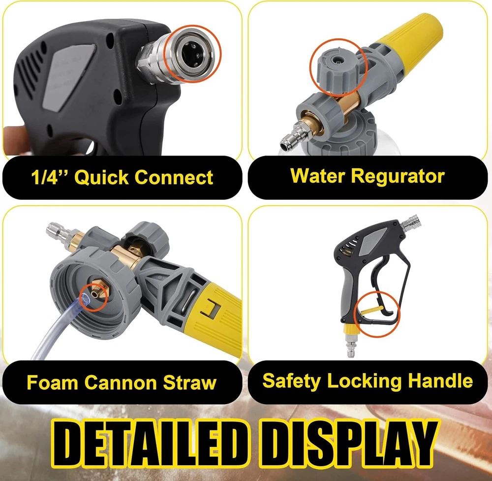 Foam Cannon with Pressure Washer Gun 5000 PSI, Power Washer Gun with 3/8'' Swivel Quick Connector, Adjustable Foam Blaster, M22 and /4 Inch Quick Connect, .5 Liter PRESSURE WASHER GUN SWIVEL FITTING: With 360-degree swivel, foam gun avoids kinking your pressure washer hose effectively, extended your pressure washer hose's service life. UPGRADED FOAM CANNONS: Power washer foam cannon’s working condition is 000 PSI to 3600 PSI. Snow foam cannon’s container bottle has a bigger mouth’s easy to fill in and an extra-wide neck to prevent crack issues, no leaking. A larger capacity foam lance’s container Capacity: Liter / Gallon. IMPROVED POWER WASHER GUN: Pressure washer guns’s made of high temperature resistant plastic & silicone material, snub nose pressure washer gun's internal structure is made of high-quality brass and stainless steel. Car wash spray gun’s working pressure is up to 5000PSI, max temperature for water is up to 50℃ ( 300℉). STRONG COMPATIBILITY: Pressure washer short gun has 3/8" NPT adapter. Incidental M22 4mm to 3/8’’ quick connector’s available for different sizes of high power washer hose, offers different connect way and provides effective convenience for your life. UNIVERSAL APPLICATION: Car foam cannon is a good cleaning helper. Wide mouth foam cannon’s useful for Motorcycle, Car washing; Roofs, Driveways, and Siding washing; Floors, Windows washing; and more helpful for detailing Trucks or SUVs. Car wash mitt scrubs your car cleanly. High-quality products and professional services give you a wonderful shopping experience.