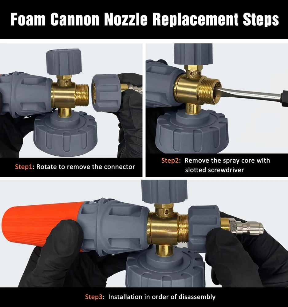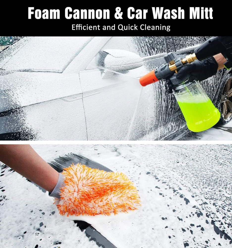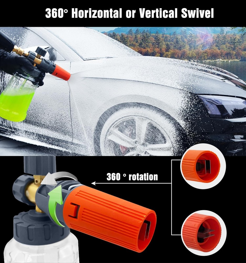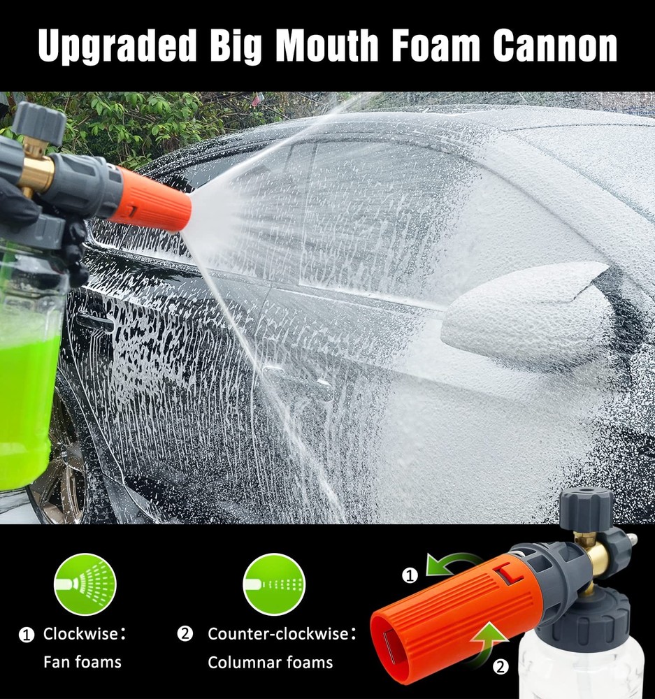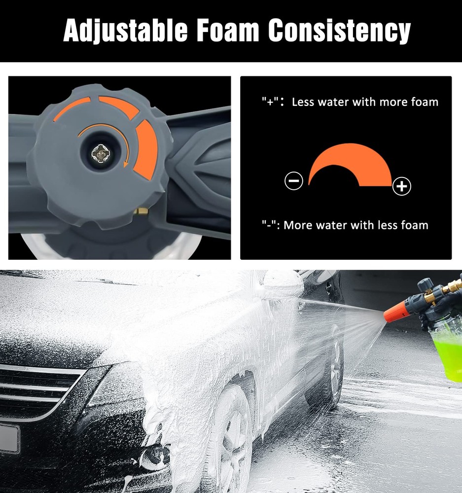 This foam cannon is a game-changer for car washing! The thick, clingy foam it produces makes cleaning effortless, and the adjustable nozzle lets you control the consistency. The build feels solid with stainless steel and ABS plastic, and the quick-connect setup works smoothly with my pressure washer. Love that it comes with extra nozzles and a wash mitt—great value for a pro-level clean every time.