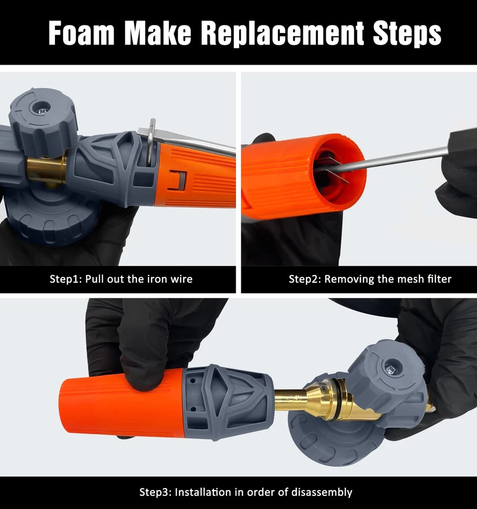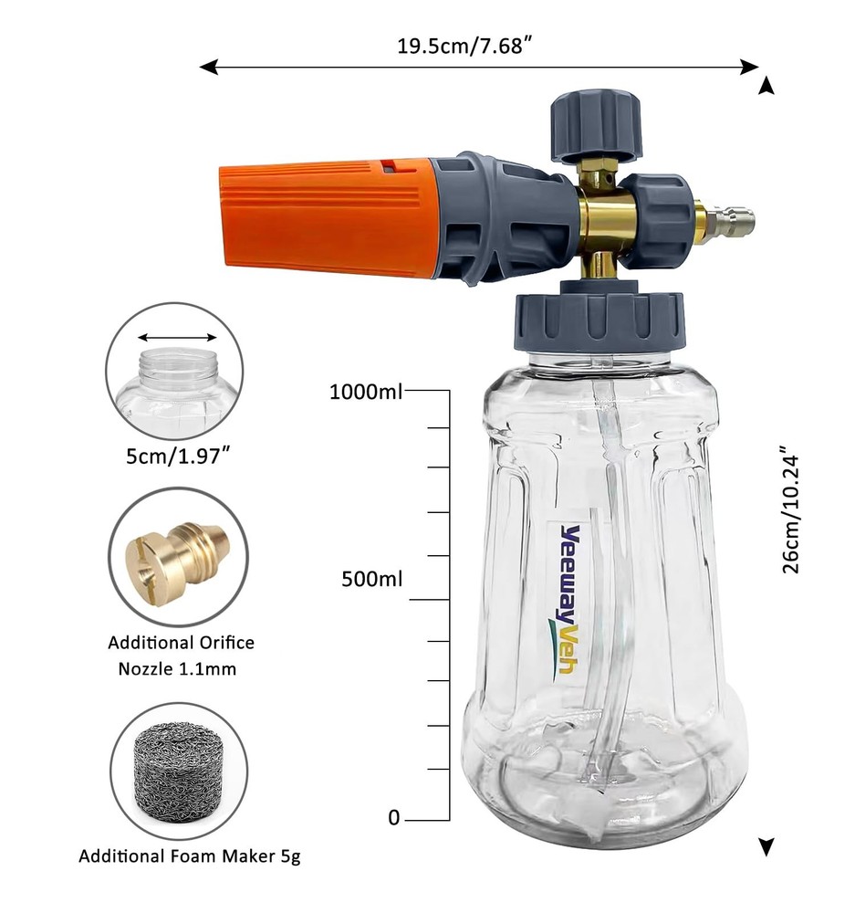Professional Pressure Washer Foam Cannon Kit Product Features: MAX: 4000 PSI Foam Spray Bottle Volume: 1L Connector Type: 1/4 Inch quick connect and M22 Materials: Stainless Steel, ABS Plastic Package Include 1 x Clear Foam Cannon (Orifice Nozzle 1.25mm) 1 x Additional Orifice Nozzle 1.1mm 1 x Foam Maker 1 x Car Wash Mitt Notes: The effect of using the foam cannon is related to multiple factors such as water, pressure washer, cleaner, spray nozzle diameter, foam maker, etc., which can be adjusted according to the actual situation DIY. Foam Cannon Care Instructions 1. After use it is recommended to use water PA repeated action for cleaning the spray cartridge, cartridge and remaining chemicals in the chamber to prevent blockage. 2. Please select the correct calibre of the spray cartridge according to the power of the car wash machine, do not make it too small, which may cause the machine to run intermittently and block the machine. 3. It is recommended to replace the foam cartridge every six months. Foam consistency can be adjusted as you wish, The(+) means less foam with more water; The(- )means more foam with less water. High-pressure foam spray with deep-tailed wick for even fan spray and greater release of thicker foam. The cannon is also large enough to hold 1 liter of cleaning solution, which is enough for multiple washings. transparent bottle deasign and full copper body, more durability. Original foam spray bottle with 1.2mm Orifice Nozzle is suitable for pressure washer over 1800W, additional orifice nozzle 1.1mm (suitable for 1200-1800W pressure washe) and additional orifice nozzle 1.0mm (suitable for pressure washerup to 1200W). original foam maker 0.13oz and additional foam maker is 0.176oz. Foam cannon suitable for 1000-4000PSI of most pressure Washer. Snow Foam Lance is made of high-quality materials and is designed to produce thick, sudsy foam that is perfect for washing cars, trucks, motorcycles, and more. It is also very easy to use, simple design and intuitive controls. Foam cannon car cleaning kit includes: 1 * Foam Cannon, 1 * Additional Orifice Nozzle 1.1mm, 1 * Additional Orifice Nozzle 1.0mm, 1 * foam maker 0.18oz, 1 * car wash mitt. The foam filter in the spout is recommended to be cleaned regularly and replaced in case of serious blockage.