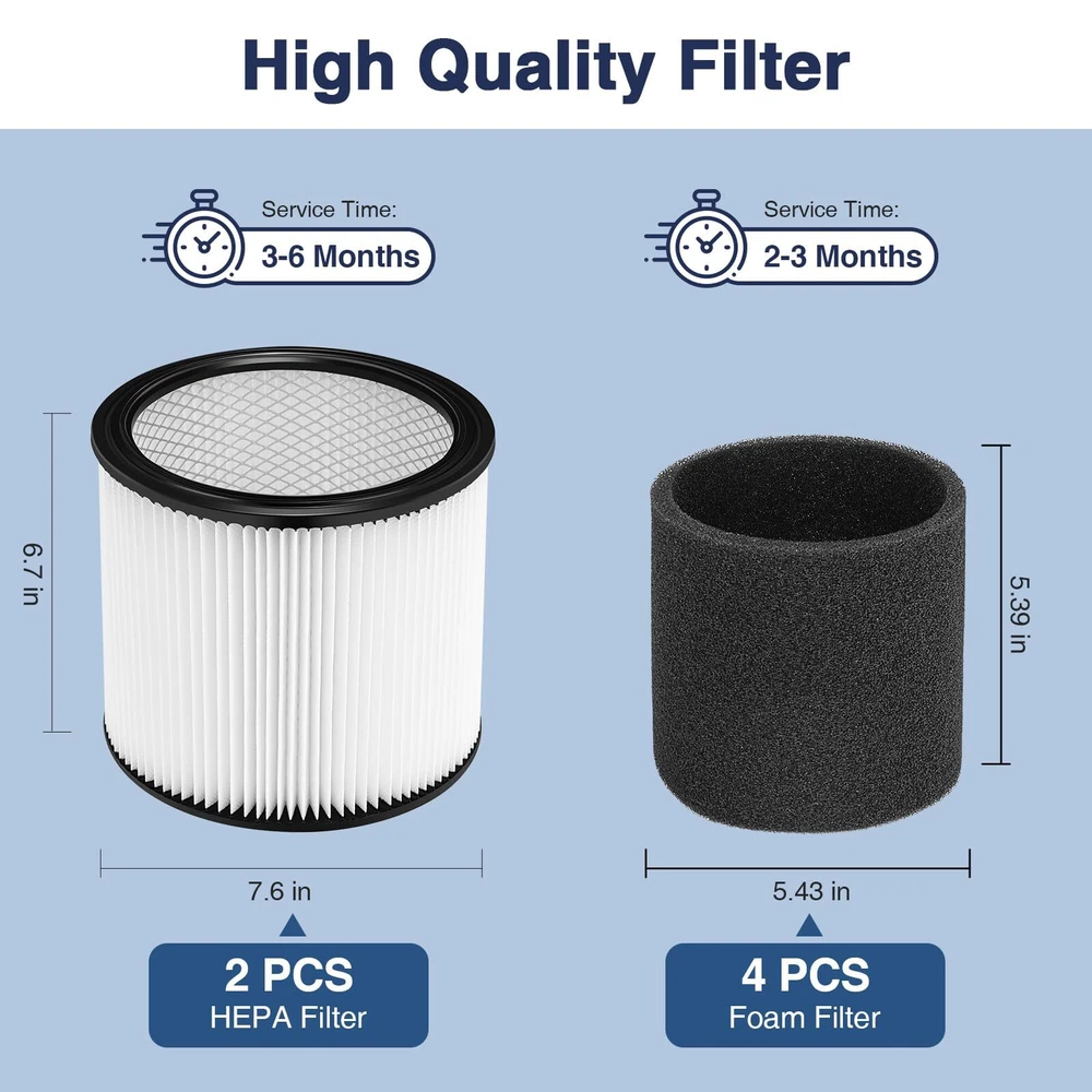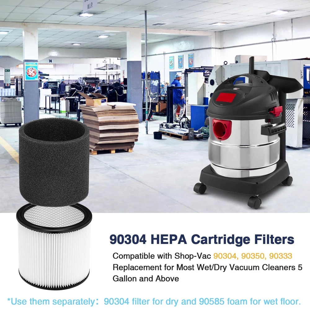 Note This is not -Vac original product and is not covered under any -Vac . The -Vac brand name and logo are the registered trademark of the respective owner. Any use of the -Vac brand name, model or part designation for this product is made solely for purposes of demonstrating compatibility. 【USE CARTRIDGE OR FOAM FILTER ALONE】 DO NOT Use the cartridge and foam sleeve filter at the same time!!! The filter and sleeve are used separately, the sleeve is not suitable for wearing on the filter. Please refer to the picture description for the installation tutorial. You can use the 90304 filter. 90304 cartridge filter fit for dry floor, 90585 foam filter fit for wet floor. Package include 2 HEPA cartridge filter and 4 Activated Carbon Foam Filter. 【PERFECT COMPATIBILITY】This 90304 cartridge filter and foam sleeve filter for 90304, 90350, 90333 Cartridge filters; Fit for -vac 5-gallon and up wet/dry vacuums SS11-450, LB650C, 4045AH, SS12-300A 800, to part No. 90304 90585. With -Vac Type U 9030400,Type X 9035000, TypeW9034000 Cartridge Filters, models BLB450, SSP16-500A, SSP16-600C, SS12-350A, SS14-450, SS16-SQ550, SS16-SQ650, 86MTSQ550. 【COMPATIBILE MODELS】90304 filter is With -Vac 90340 SL16-575A SS11-450 SS12-300A SS14-350A SS14-550A SS14-600C 16RT500A 16RTP550A 4045AH 85L450 85L575 SS16-450 SS16-550A SS16-650C 86EM350 86L500A 86M350 86MT600C 86ST450 87L500A 87L650C 87M350 87P500A 87P650C 92L550A 92L650C 92P650C BLB550 BLB560C CH87-650C LB650C MSC85EM300 MSC85L450 MSC85L500 MSC85L600C MSC85M250B MSCQPL55 MSCSS12-250 Cartridge Filter for Wet or Dry Pickup. 【PREMIUM QULAITY FILTER】The filter for 90304 vac is designed with true HEPA filter, High quality rubber and metal mesh to provide a durable and reusable filter. Work for 99.97% of all airborne particles as small as 0.3 microns in diameter, pets dander, like pets hair, cooking & smoke odors. Activated Carbon Foam Filter attach large particles to keep the air clean around you and your pets. 【WASHABLE AND REUSABLE】The 90304 filter and 90585 foam sleeve filter can replace Most Wet /Dry Vacuum Cleaners, Easy to install and replace, no tools required. 90304 filter fit for dry floor, 90585 foam filter fit for wet floor. Replace the filter every 3-6 months for optimal performance. 【】: We value and satisfaction. If you have any problems with the filter, please us through our home page, We will solve the problem for you in 24 hours.