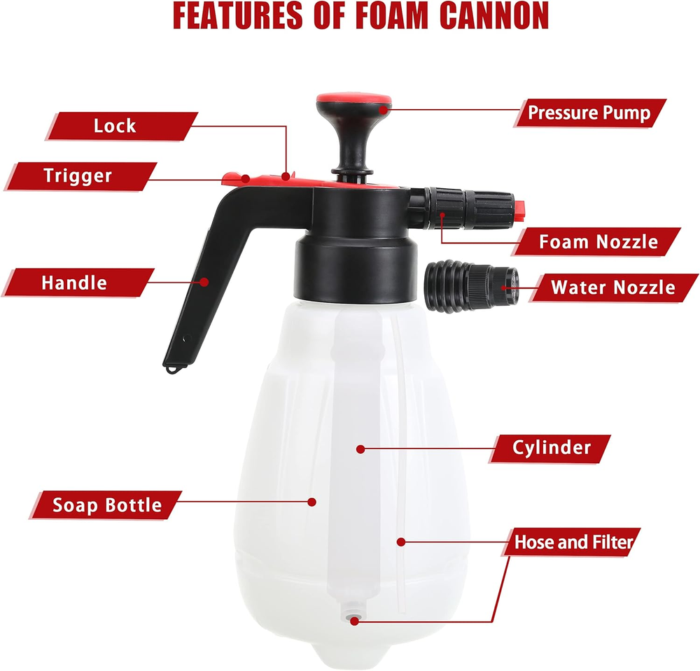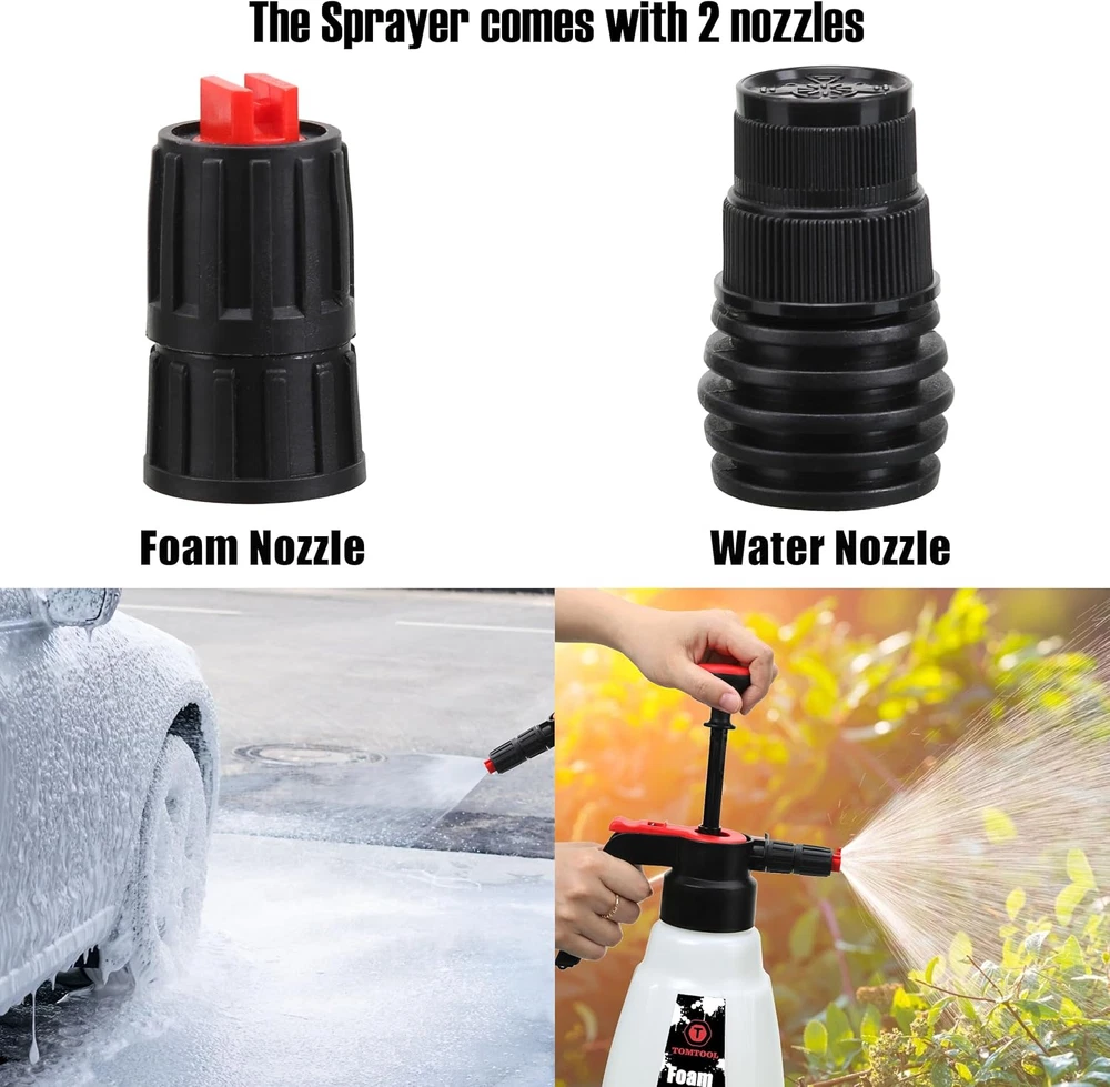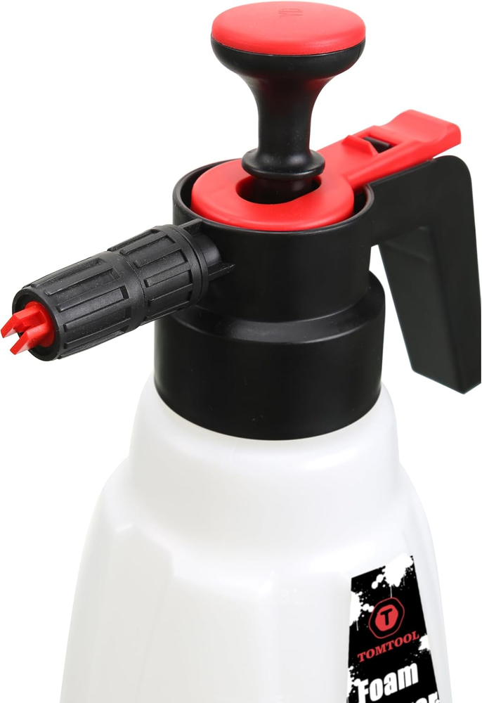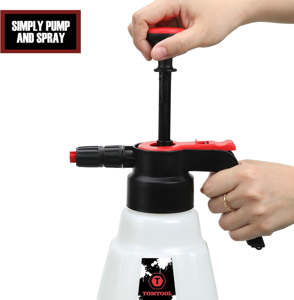 Convenient and Portable: It doesn't need pressure washer, foam gun or garden hose, the foam sprayer is just manually pressurized to create thick and cling snow foam, or mist water. Multi-function: The foam sprayer comes with 1 extra water nozzle. Use snow soap sprayer with foam nozzle for car washing / windows / motorcycle / siding washing, etc. Use water nozzle for watering plant and flowers. High Quality: Foam Pump Blaster features a rugged bottle, 1.8 Liter / 0.48 Gallon tank capacity for larger volume storage and longer spray time. You may need to pressurize when using if the foam sprayer at a low pressure. Easy to Use: Simply mix the warm water and detergent according to the appropriate ratio and easily produce foam instantly. (Note: Do not overfill tank with solution, Do not exceed the maximum level). Works with any type of car detergent wash / pressure washer soap. Perfect Choice: Easy assembly and taking apart for cleaning and maintenance, tool-free. Without any connection plug needed, the manual foam cannon is the perfect way to foam down your travel with a thick, sudsy soap solution. Product Description TOMTOOL High Pressure Pump Foam Sprayer This is a high quality professional handheld compression foam sprayer. Need No Air Compressor and Car Washer, the foam sprayer just is manually pressurized to create thick and cling snow foam, or mist water. It will spray all types of foaming chemical products. Professional quality sprayer to apply snow foam and other foaming products, produce thick and clinging foam. Just Fill The Bottle With The Water And The Cleaner According To The Requirements, Then Shake Up To Mix The Solution Well. Prime The Pump And You Can Spray The Foam Towards Your Car! Easy To Clean And Maintain After Use! Features Lightweight and compact, this foaming spray provides startling high pressure without any connection plug needed! Lose the noisy electric compressors and the limitations of hoses, this portable foam sprayer will suit your every need. No need to interrupt your wash with constant refills. The spray bottle is designed with a large and practical capacity of 1.8 Liter / 0.48 Gallon for larger volume storage and longer spray time. The foam compressing pump spray easily creates a thick layer of foam during your car wash, pre-rinse and all-purpose cleaning processes. It is versatile with an ergonomic design that makes it easy to hold & spray. Wheel & Tire Cleaner or Foam Car Wash Soap are the perfect cleaning products to put inside of your pump foam sprayer. Easy to Use Mix the water and detergent according to the appropriate ratio. For ordinary car wash, the ratio of detergent: water =1:20~1:40. Shake well to mix the solution, then pressurize the sprayer with around 10-13 pumps & foam away! Used for both snow foam spray and water spray