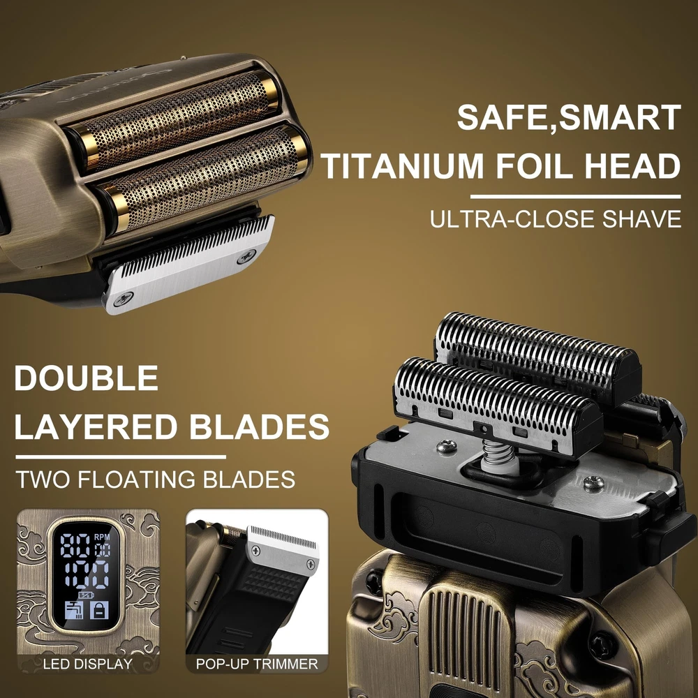Foil Shavers for Men Beard Trimmer for Men Electric Razor for Men Bald Head Hair Shaving Kit Cordless Waterproof Product Details Recommended Uses For Product: Beard Color: Bronze Hair Type: All Brand: Scttomon Power Source: Battery Powered Package Dimensions : 8.43 x 8.15 x 2.83 inches; 2.2 Pounds Batteries : 1 Lithium Ion batteries required. (included) Date First Available : September 9, 2024 Manufacturer : Scttomon Country of Origin : China Professional Men's Grooming kit: The cordless trimmer set includes hair trimmer and foil shaver. The T-blade trimmer allows for precise hair trimming, ensuring a clean cut every time. The foil shaver provides a smooth and close shave, leaving your skin feeling soft and stubble-free. Ideal for home use and barbershops and we suggest that you first use hair trimmer trim your stubble before using an electric shaver Exquisite Body&Strong Power: T-blade trimmer and foil shaver are made of metal material, which adds luxurious sense and resistant to scratches and dents, keeping it looking flawless for longer. The foil shaver and hair trimmer is equipped with a heavy duty motor and self-sharpening blade that effortlessly removes excess hair without causing any pain and pulling Double-layer Blades&Adjustable speed: The electric shaver adopts a unique double-layer floating mesh design with independent dual cutting blades to fit to contours of the face, neck, and jawline. Achieve flawless and skin-friendly shaving for sideburns, mustaches, and stray hairs with the pop-up trimmer and titanium foil head. Two adjustable speeds(7000RPM/8000RPM) to meet your shaving needs Long-lasting & Portable: With a built-in rechargeable lithium-ion battery, our trimmer kit can provide long-lasting running for you. Charge for sets just 1.5 hours and get up to 150 minutes runtime for trimmer and 75 minutes runtime for shaver. The cordless trimmer set and travel lock design making it convenient and safe to take and use with you wherever you go Waterproof &Wet Dry Shave: The trimmer sets are easy to clean and fully washable because of its IPX6 waterproof design. Press the shaver button to remove the blade cover, and Just clean it under the running water after use. Designed to meet your preferences, not only dry shave, also can be used wet with shaving gel or foam to reducing the risk of skin nicks and cuts Smart LED Display: The high-definition LED screen clearly displays the remaining battery percentage, reminding charging and oil add reminder, three hair trimmer speed turbo mode(6000RPM/6500RPM/7000RPM) display is more intelligent, providing you with all the information to ensure you are using the correct speed and keep trimmer in good condition