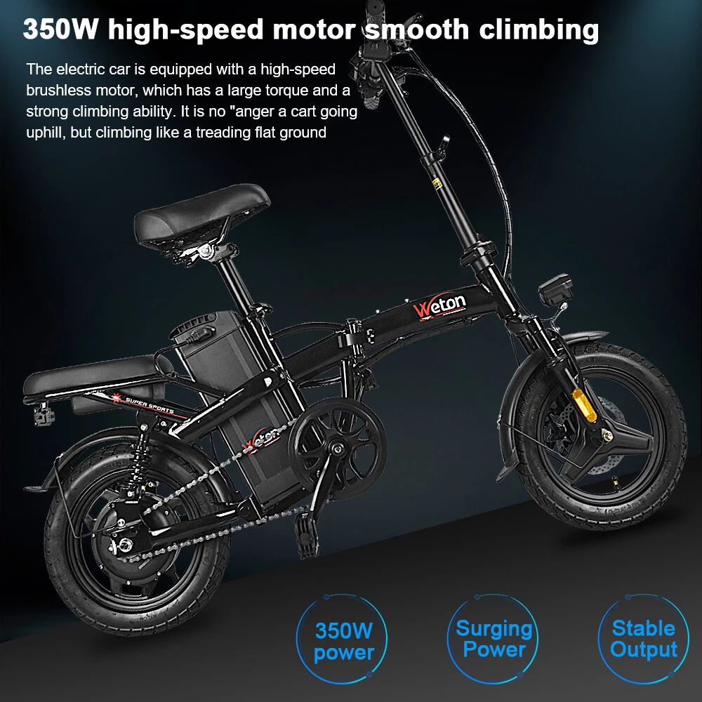 Foldable Electric Scooters 22MPH 48V 350W Urban Commuter Adult E-Bike With Seat Description Specification: Load capacity: 330 LB(150kg) Vehicle weight:55LB(25kg) Meter: LED battery display Wheels: 14 inch Flat wheels Brake: Front and rear disc brake Frame: High-strength carbon steel Battery: 48V 15Ah Lithium battery Range: 35-40 Miles Charging time: 4-5 hours Motor speed:0-22 miles per hour Pedal: Collapsible Aluminum Alloy Pedal Motor: 350W high speed brushless gear motor Degree of climbing::40° Product description Portable Design : The foldable design allows you to put it in the back of the car, elevator,office and saving space. Double Disc Brake : With front and rear disc brakes, it is more accurate and safer when braking. LED headlights and taillights : The LED headlights and taillights make it safer to ride in the dark. 14 in Air Tires : 14-inches large rubber air tires make riding more shock-absorbing and comfortable. Large-capacity Lithium Battery : With a 15 AH battery, you can expect a range of up to 30-35 miles on a single charge, perfect for long-distance commute. 350W Rear-drive Motor : With a 350W rear-drive motor, you can travel up to 30-35 miles, go up to 20 MPH, and clime a 40° slope. Comfortable Seat and cushion : Upgraded version e bikes with a thicker seat, which brings a more comfortable experience when riding on uneven roads. Features Safety The frame is built sturdy and durable.The dual disc brakes make this bike very safe and it stops with ease.Anti-slip wear resistant tire is suitable for all kinds of road such as rainy, muddy, mountain and other terrains.The LED headlight adds safety to the bike, as do the reflectors. Large-capacity Lithium Battery Powerful and long lasting battery and easy to use. 48V/15AH battery supports ride to 35-40 miles (Electric mode) under specific conditions. Smart lithium battery charger used for fast charging (4-5 hrs).The e bike is surprising lightweight if you need to commute with it. Lightweight & Foldable The ebikes folds up to transport or store it easily. It can be folded down in the back of the car,elevator,office. You will get compliments on it everywhere you go. Folding electric bicycle seat and handle bar can also be adjusted according to each person's preferences.This bike is very stylish and it’s fun for all ages. It can be used as a present for your kids.When the weather is good, he/she would go ride the bike. Free Choice of Mode You can go faster and farther in electric mode without breaking a sweat. Choose enjoyable pedal-assisted mode so the motor provides a max range of 40 miles to you. Or turn it off, then you can ride it like a traditional bike without feeling any drag or resistance. Per-assemble & After Sales Your folding electric bike would arrive 90% assembled and after one simple step of seat and pedals assembling, then you are ready to go. The foldable bike warranty period for battery, motor, controller and charger is 12 months. Natural damage or quality problems during the warranty period, we will provide you with free replacement part. What will you get 1 x 14’’ folding electric bicycle 1 x 48v 15ah lithium battery 4 x Key 2 x foot pedals 1 x manual instruction UL 2849 Certified, link to UL Certification - https://productiq.ulprospector.com/en/search Payment ◆ We accept Paypal. It's a safer, faster and free way to pay! ◆ Please pay the money within 7 days after the auction ended. ◆ Non-Paying Bidders: Serious Buyer Only! Please place bid or "Buy it now" only if you agree the price and terms of the product and no argument after the auction end. And payment must be received within 7 business days of the auction close. We will report Non-paying buyer to eBay. Delivery details ◆ Our shipping rates include the cost of shipping, handling,packaging and related manpower costs. ◆ All item will be shipped by Standard Shipping within 3 business days (excluding weekend & holiday).It takes approximately 5-7 working days.Shipping time is only estimated and not guaranteed. Please contact us if there's any problem. ◆ All items will be shipped to buyer's paypal address.Please confirm your paypal address is right.We are not responsible for wrong or undeliverable address. We reserve the right to charge the shipping fee again for returned items due to wrong address. Terms of sales ◆It is our goal to provide our customer 100% satisfaction. ◆30 Days Money Back or Return for New one Guarantee from the date of original purchase. Buyers must contact us to send the defective items back for exchange within the warranty period. ◆Our warranty does not extend to any products that are physically damaged or that are not under normal operating conditions as a result of misuse or improper installation on the buyer/user's part. ◆For all return products customers MUST contact us for the returning address. Products should be returned with original packages and must be returned in like-new condition with all accessories and packaging. ◆If the return is due to the mistakes of buyers, for example, wrong purchase, no need of the batteries after transaction, or other artificial damages,the buyer will be responsible for the postage. Contact us ◆If you have any general questions then please contact us via eBay message service only. ◆Please allow up to 24 hours for responses. You can also contact us via eBay message service for any wholesale enquiries. Please note that we are closed on Weekend. ◆ We have always been trying our best to provide the best service and reliable products for every customer. Please contact us via ebay message or email to resolve the issue before leaving negative feedback. On Jan 11, 2025 at 01:09:39 PST, seller added the following information: