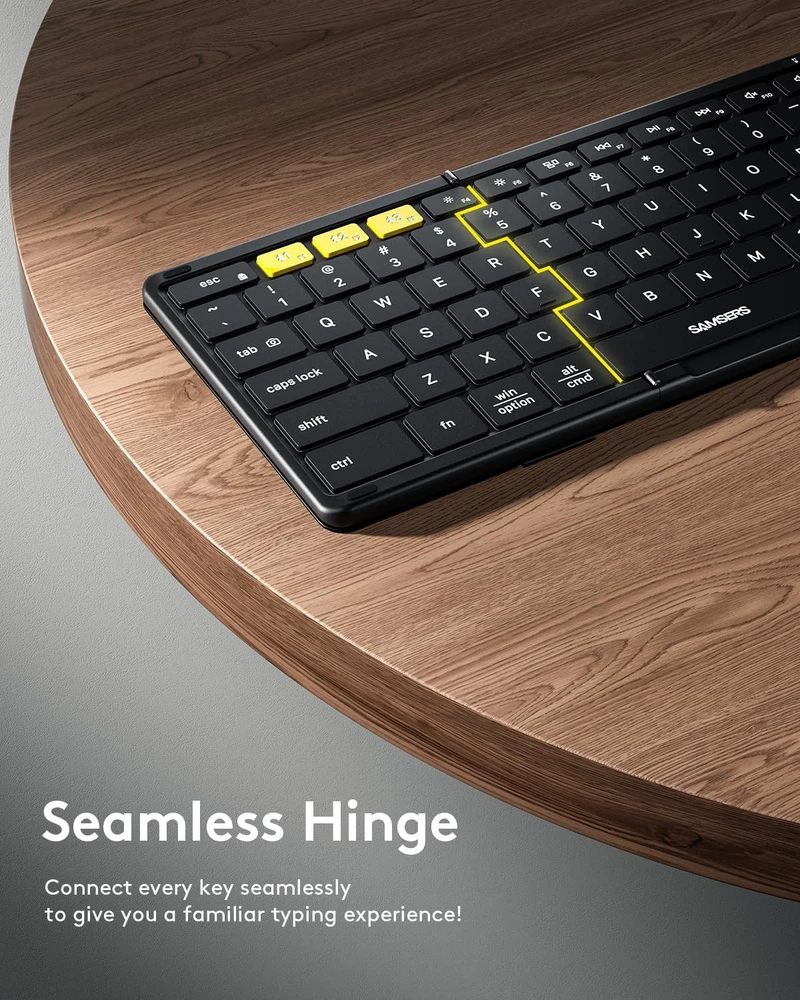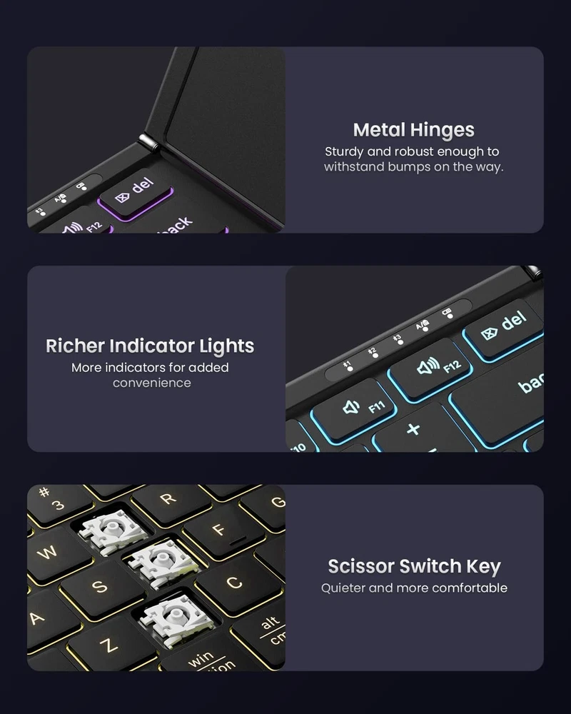 Full-Size Wireless Foldable Backlight Bluetooth Keyboard with Touchpad 【Full-size Folding Wireless Keyboard】 Elevate your workspace with foldable keyboard. Designed with standard size (unfolded size: 13.5 x 4.5 inch) and 0.63 inch standard keys, more in line with finger size and typing habits. Innovative seamless metal hinge, allow you to adapt to its layout anytime and anywhere. Quiet scissor-switch keys and non-slip PU leather at the bottom, so that you can fully concentrate on your work! 【Connect up to 3 Devices】 Streamline your workflow with multi-device Bluetooth keyboard, supports up to 3 connected devices, seamless switching without delay (Bluetooth 5.1 x 3). Compatible with Windows, Mac OS, iOS or Android. You can type, switch, and keep typing on your iPad, phone, tablet, or laptop! 【Multi-touch Trackpad Foldable Keyboard】Upgraded larger sensitive touchpad supports multi-touch, allowing you to control your device without a mouse. Richer and more practical multimedia shortcuts with fn lock function make your work more convenient and efficient! Built-in 500 mAh battery can last up to 110 hours (no blacklight) or standby 300 days after a 2-3 hour charge. One full zcharge is enough time for your short business trip or vacation! 【Adjustable 7 Color Backlight Lighting】Illuminate your workspace with adjustable backlit options. Choose from 7 colors(Green, purple, blue, yellow, white, cyan and red ) and 4 brightness levels (High-Medium-Low-Off) to match your environment and preferences, creating your focused and comfortable atmosphere! 【Delicate Portable Keyboard】Black PU leather appearance, made of ABS+PU material, lightweight but steady, no need to worry about daily wear or scratches. Elegant layout design, excellent tactile feel and simple appearance make it a perfect match for your tablet, phone and laptop. The Great gift for travel and business trips! 【Little Things & Big Convenience】 folding keyboard with backlight, only 11.0 ounces. Palm-sized keyboard can be folded up magnetically and put in your briefcase without taking up much space. Maximum convenience for you with minimum weight and size! Comes with a phone stand and a velvet storage bag, the perfect companion for a folding keyboard. Not just a keyboard, but a travel solution! 【Satisfaction Service】provides you with Email Response all day & Technical Support. If you have any questions, please don't hesitate to contact us!~